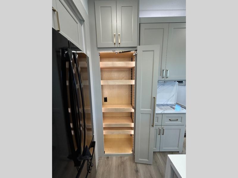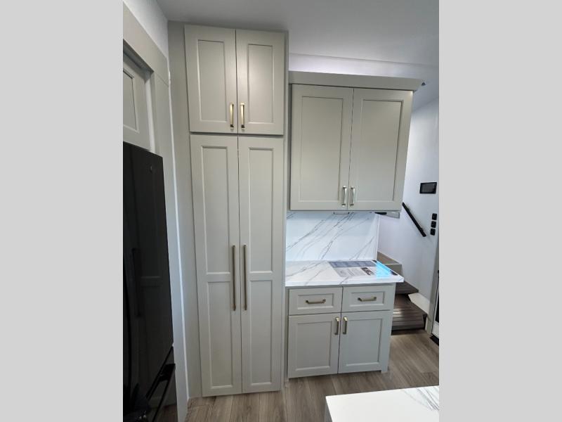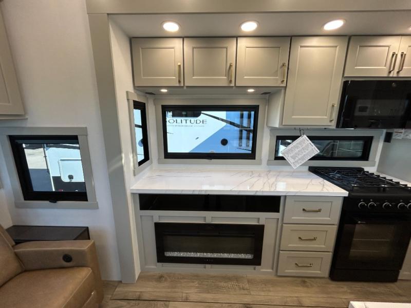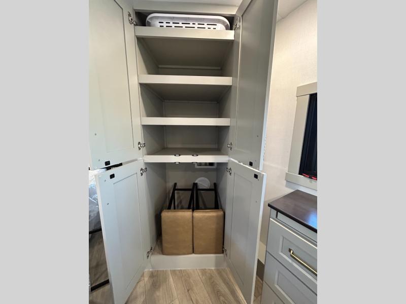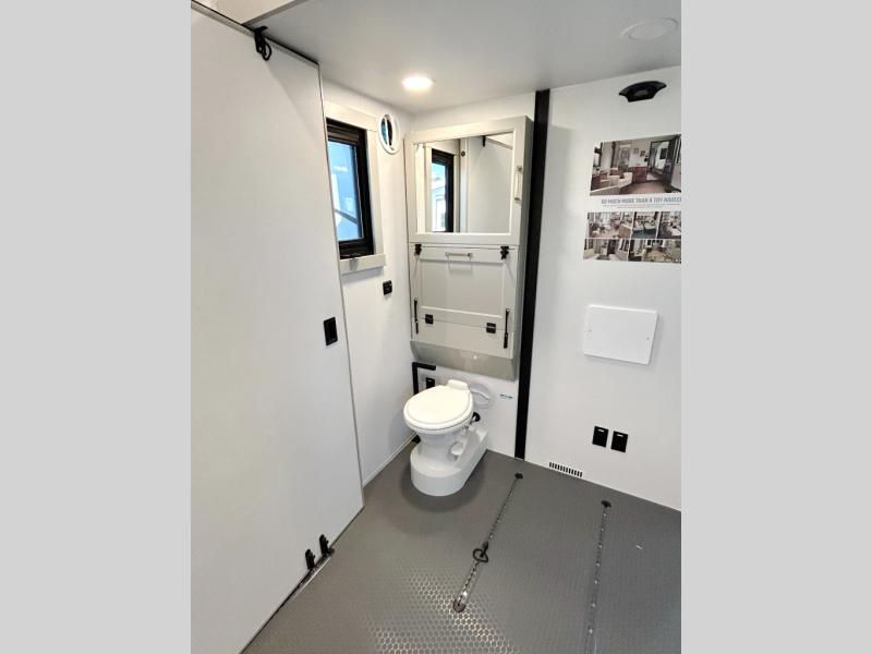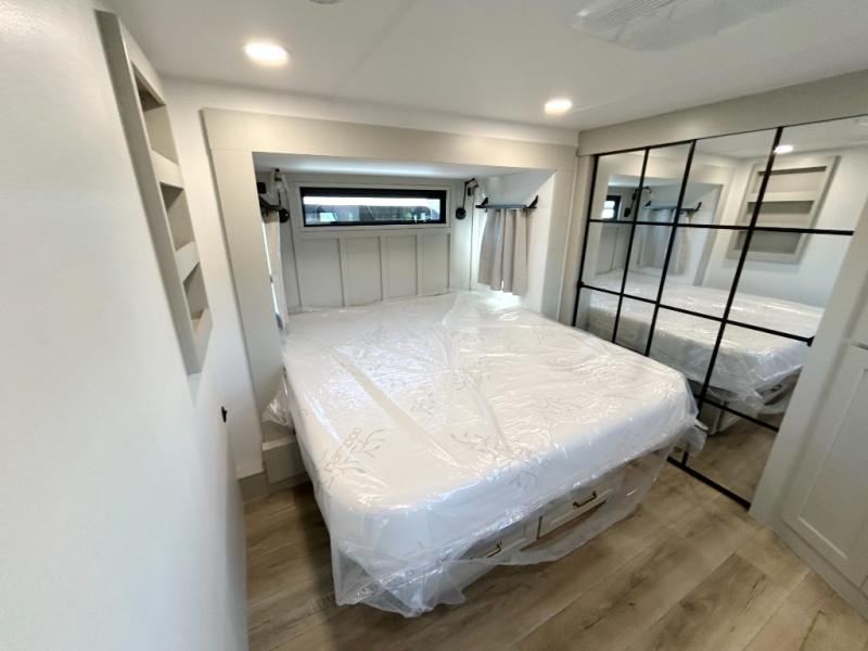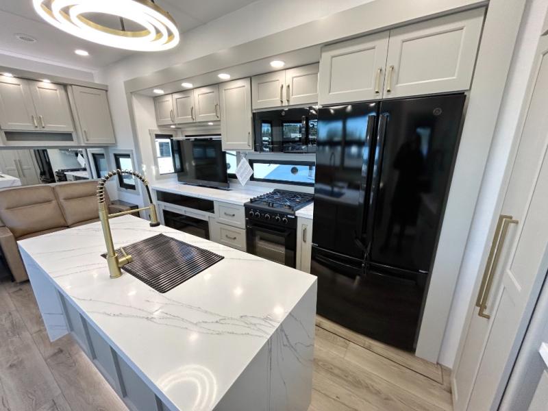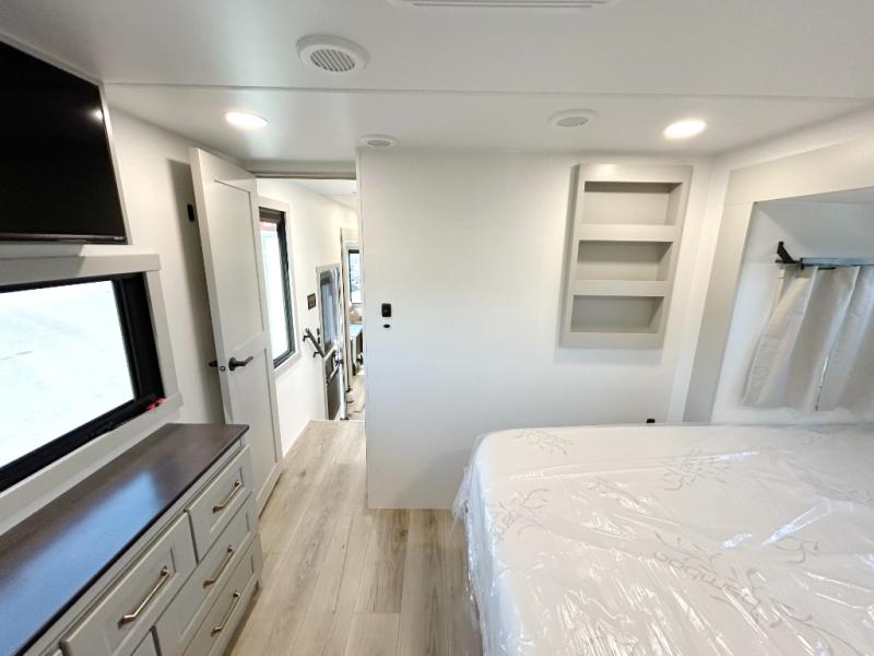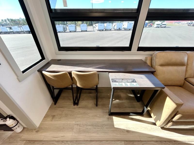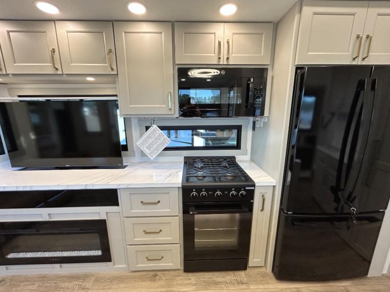 The front bedroom is a serene retreat, featuring a plush king bed, spacious walk-in closet, 32” smart TV, sliding dresser top, and hidden storage for better organization.The bathroom is a haven of convenience, boasting a full bathroom with pull-out linen and trash bin, and a spacious 30 x 42 shower. Perfect for freshening up after a long day of adventure! The kitchen has a pantry featuring adjustable shelving, a hutch, 19 cu. refrigerator, microwave, four-burner cooktop, kitchen island, and convertible dining table/L-desk. Plus, pet bowls for your furry friends! Gather with family and friends in the living room, which features a dual sofa with two recliners, each with heat and massage functions, a televator, and a cozy fireplace. It's the perfect spot to relax and unwind! The garage has a half bathroom, two sofas, and a 43” smart TV, ideal for game days, movie nights, or just relaxing with friends. Outside, enjoy the convenience of a fuel station, three-way pass-thru storage, and LP quick connect. Whether you're an adventure-seeker, or just love to travel in style, this toy hauler has everything you need and more!