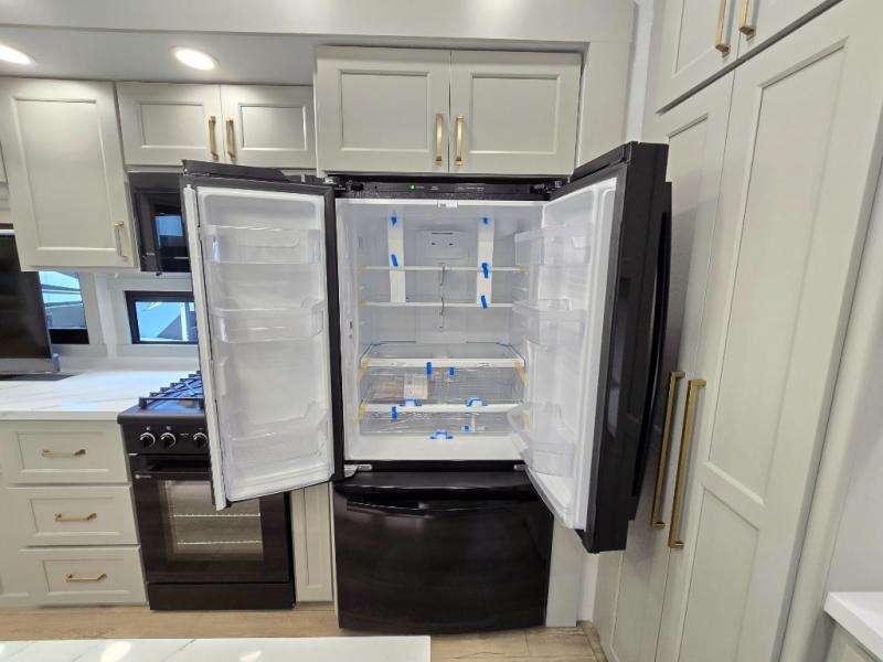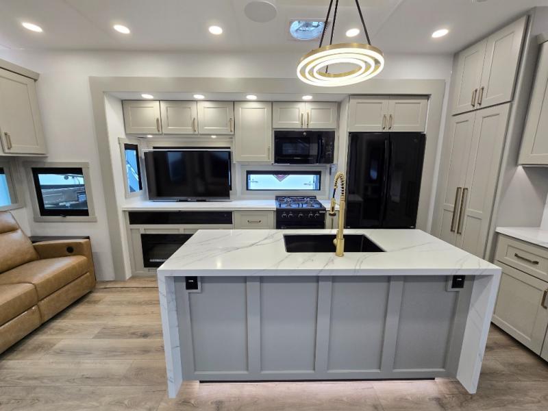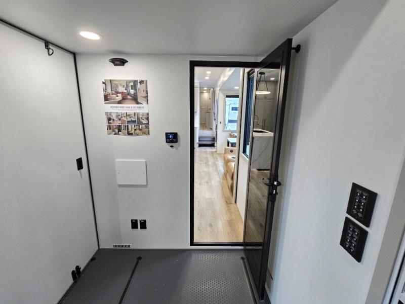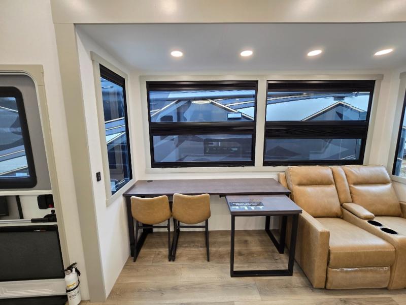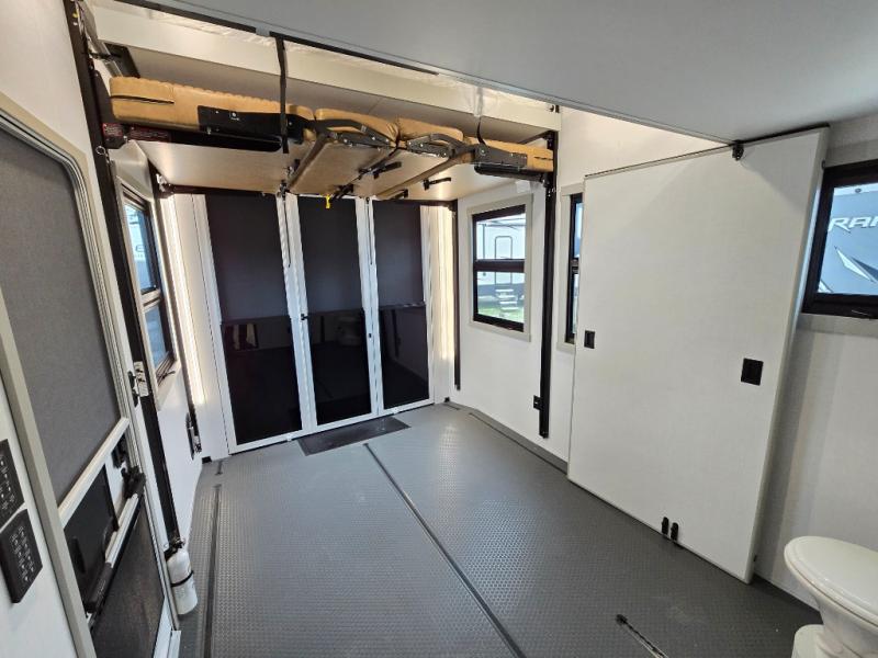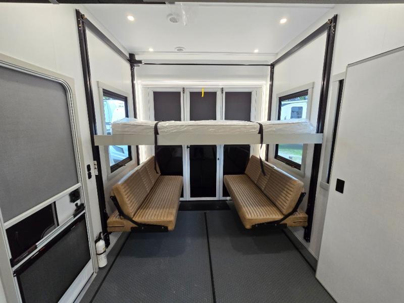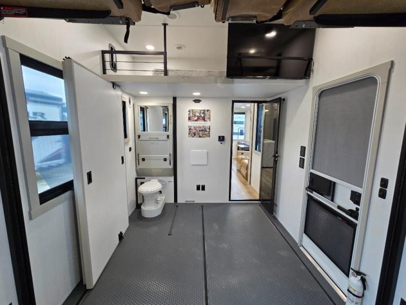 The front bedroom is a serene retreat, featuring a plush king bed, spacious walk-in closet, 32” smart TV, sliding dresser top, and hidden storage for better organization.The bathroom is a haven of convenience, boasting a full bathroom with pull-out linen and trash bin, and a spacious 30 x 42 shower. Perfect for freshening up after a long day of adventure! The kitchen has a pantry featuring adjustable shelving, a hutch, 19 cu. refrigerator, microwave, four-burner cooktop, kitchen island, and convertible dining table/L-desk. Plus, pet bowls for your furry friends! Gather with family and friends in the living room, which features a dual sofa with two recliners, each with heat and massage functions, a televator, and a cozy fireplace. It's the perfect spot to relax and unwind! The garage has a half bathroom, two sofas, and a 43” smart TV, ideal for game days, movie nights, or just relaxing with friends. Outside, enjoy the convenience of a fuel station, three-way pass-thru storage, and LP quick connect. Whether you're an adventure-seeker, or just love to travel in style, this toy hauler has everything you need and more!