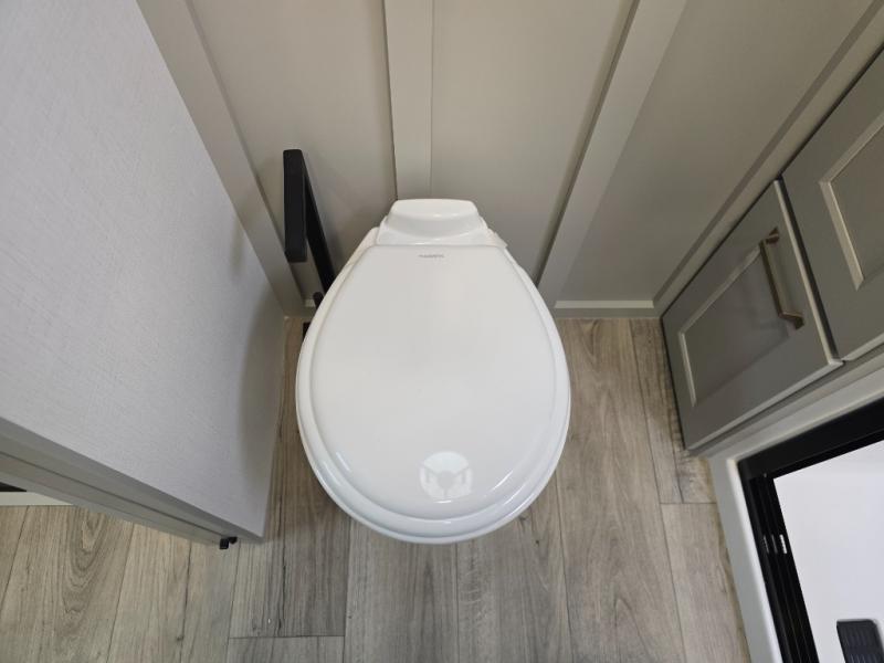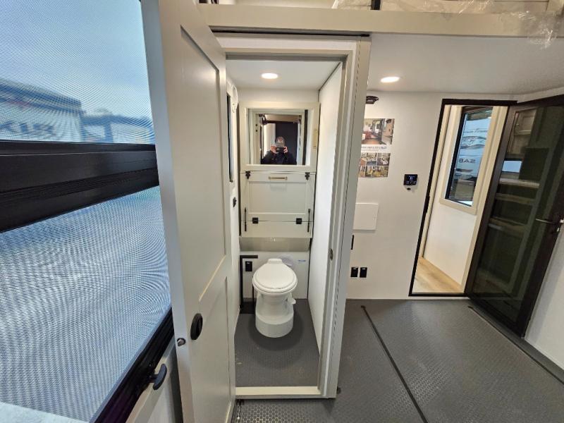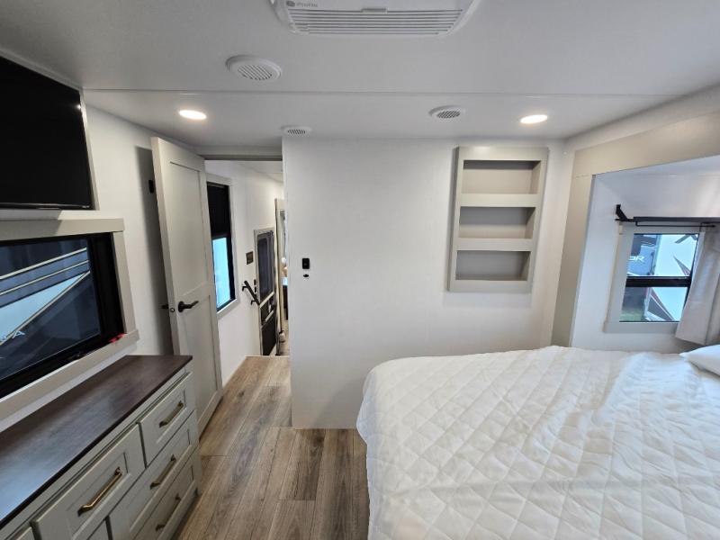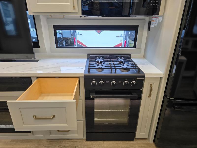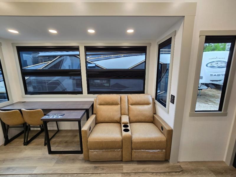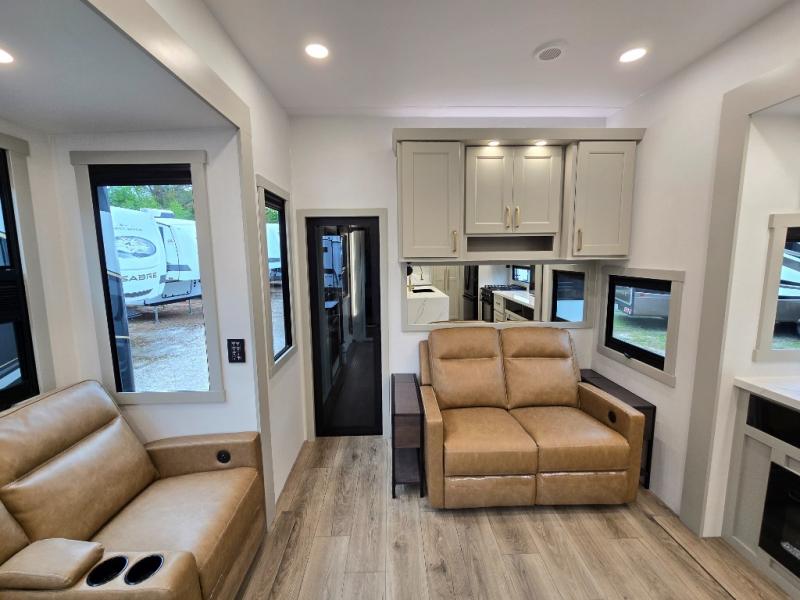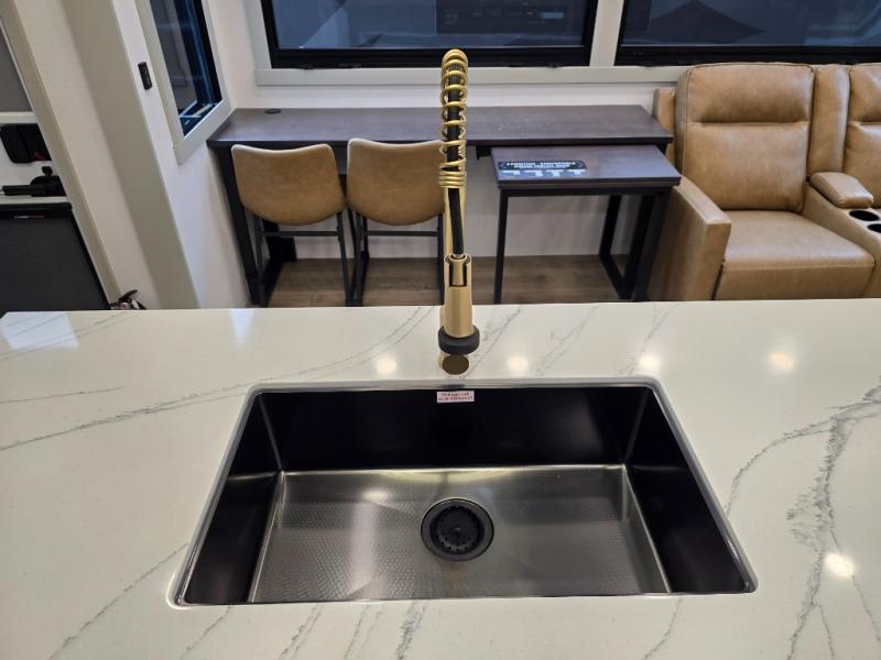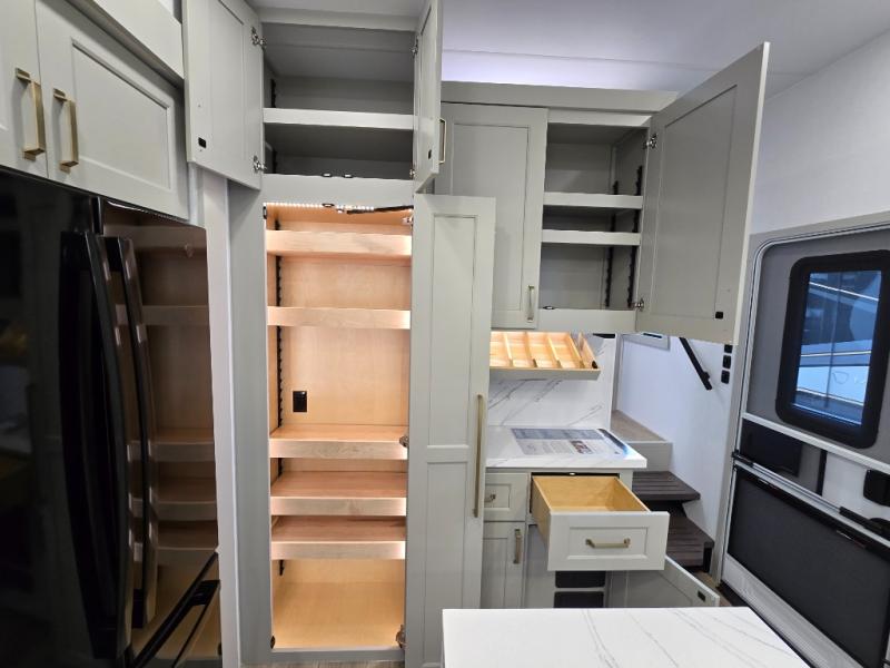 The front bedroom is a serene retreat, featuring a plush king bed, spacious walk-in closet, 32” smart TV, sliding dresser top, and hidden storage for better organization.The bathroom is a haven of convenience, boasting a full bathroom with pull-out linen and trash bin, and a spacious 30 x 42 shower. Perfect for freshening up after a long day of adventure! The kitchen has a pantry featuring adjustable shelving, a hutch, 19 cu. refrigerator, microwave, four-burner cooktop, kitchen island, and convertible dining table/L-desk. Plus, pet bowls for your furry friends! Gather with family and friends in the living room, which features a dual sofa with two recliners, each with heat and massage functions, a televator, and a cozy fireplace. It's the perfect spot to relax and unwind! The garage has a half bathroom, two sofas, and a 43” smart TV, ideal for game days, movie nights, or just relaxing with friends. Outside, enjoy the convenience of a fuel station, three-way pass-thru storage, and LP quick connect. Whether you're an adventure-seeker, or just love to travel in style, this toy hauler has everything you need and more!
