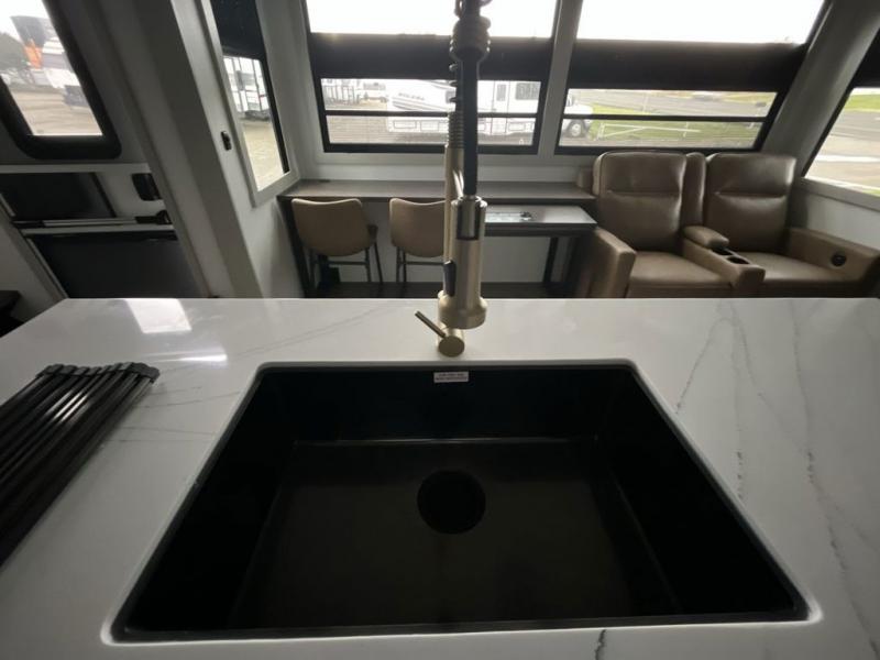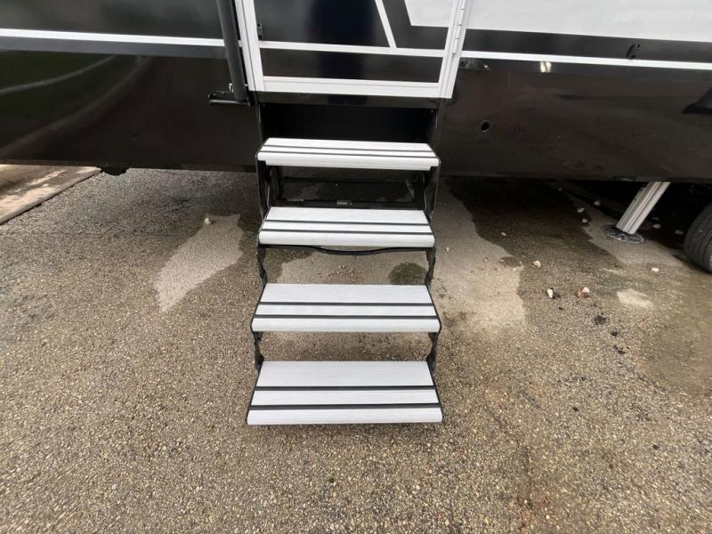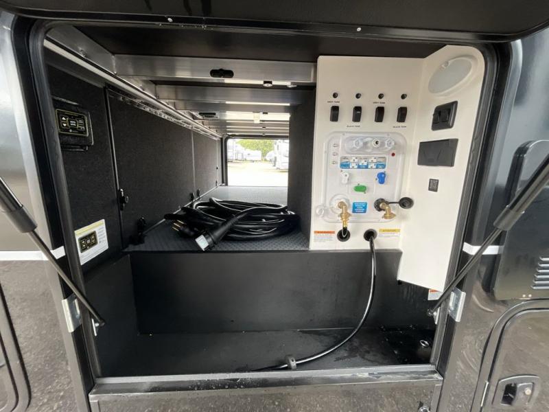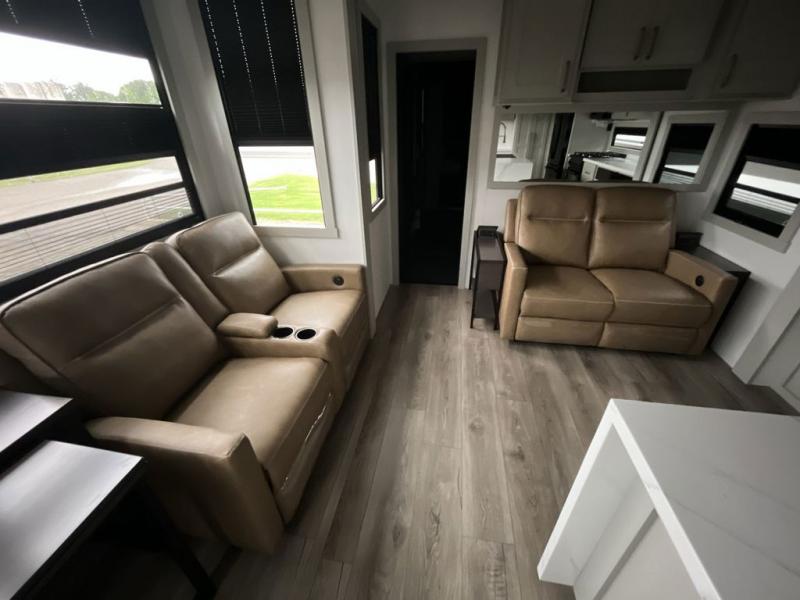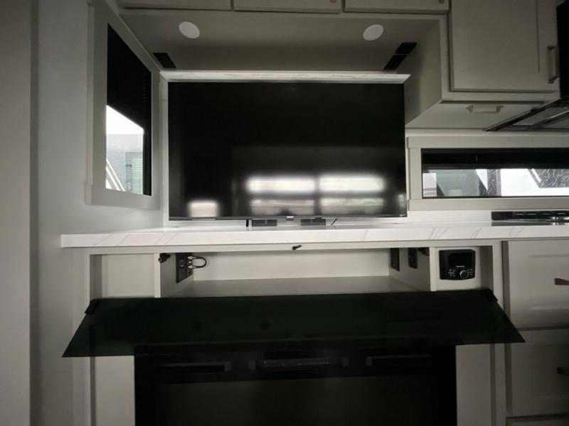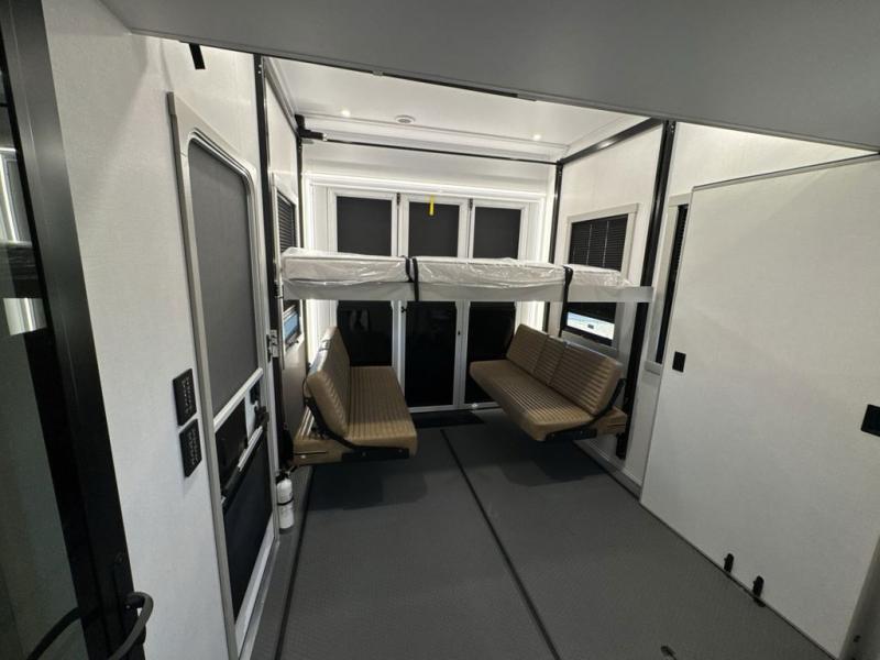 The front bedroom is a serene retreat, featuring a plush king bed, spacious walk-in closet, 32” smart TV, sliding dresser top, and hidden storage for better organization.The bathroom is a haven of convenience, boasting a full bathroom with pull-out linen and trash bin, and a spacious 30 x 42 shower. Perfect for freshening up after a long day of adventure! The kitchen has a pantry featuring adjustable shelving, a hutch, 19 cu. refrigerator, microwave, four-burner cooktop, kitchen island, and convertible dining table/L-desk. Plus, pet bowls for your furry friends! Gather with family and friends in the living room, which features a dual sofa with two recliners, each with heat and massage functions, a televator, and a cozy fireplace. It's the perfect spot to relax and unwind! The garage has a half bathroom, two sofas, and a 43” smart TV, ideal for game days, movie nights, or just relaxing with friends. Outside, enjoy the convenience of a fuel station, three-way pass-thru storage, and LP quick connect. Whether you're an adventure-seeker, or just love to travel in style, this toy hauler has everything you need and more!