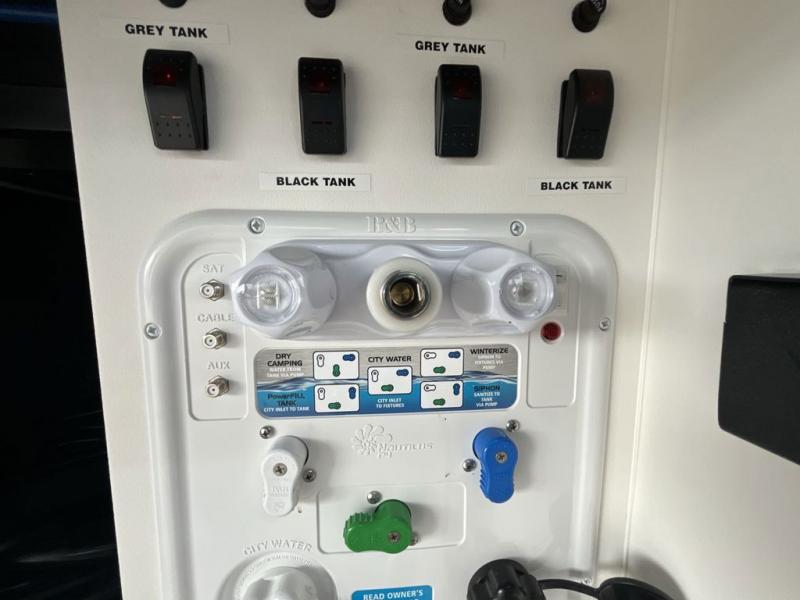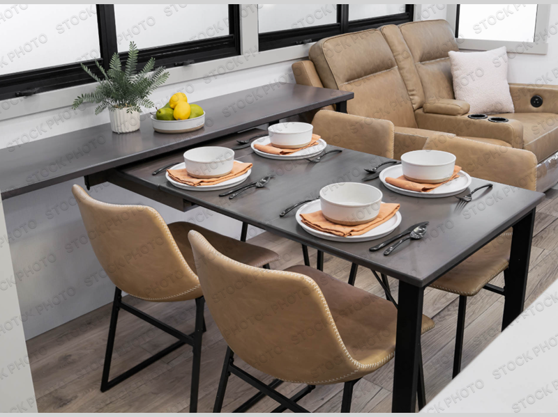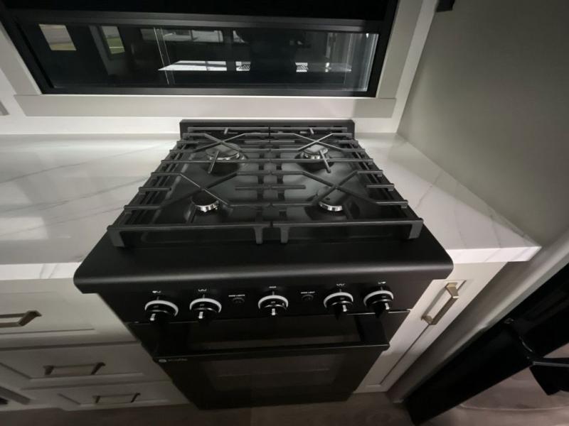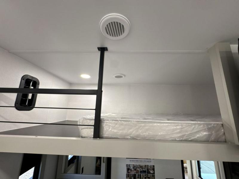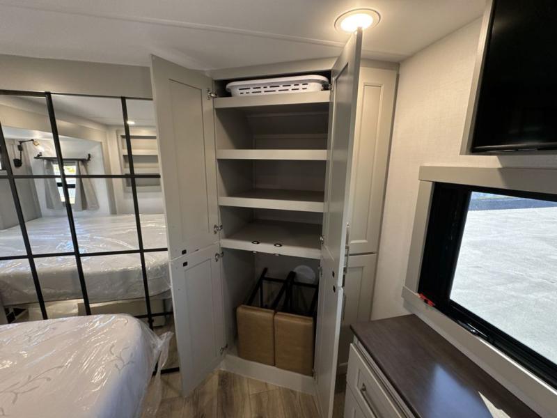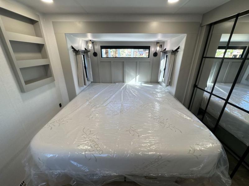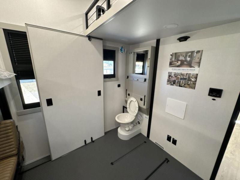 The front bedroom is a serene retreat, featuring a plush king bed, spacious walk-in closet, 32” smart TV, sliding dresser top, and hidden storage for better organization.The bathroom is a haven of convenience, boasting a full bathroom with pull-out linen and trash bin, and a spacious 30 x 42 shower. Perfect for freshening up after a long day of adventure! The kitchen has a pantry featuring adjustable shelving, a hutch, 19 cu. refrigerator, microwave, four-burner cooktop, kitchen island, and convertible dining table/L-desk. Plus, pet bowls for your furry friends! Gather with family and friends in the living room, which features a dual sofa with two recliners, each with heat and massage functions, a televator, and a cozy fireplace. It's the perfect spot to relax and unwind! The garage has a half bathroom, two sofas, and a 43” smart TV, ideal for game days, movie nights, or just relaxing with friends. Outside, enjoy the convenience of a fuel station, three-way pass-thru storage, and LP quick connect. Whether you're an adventure-seeker, or just love to travel in style, this toy hauler has everything you need and more!