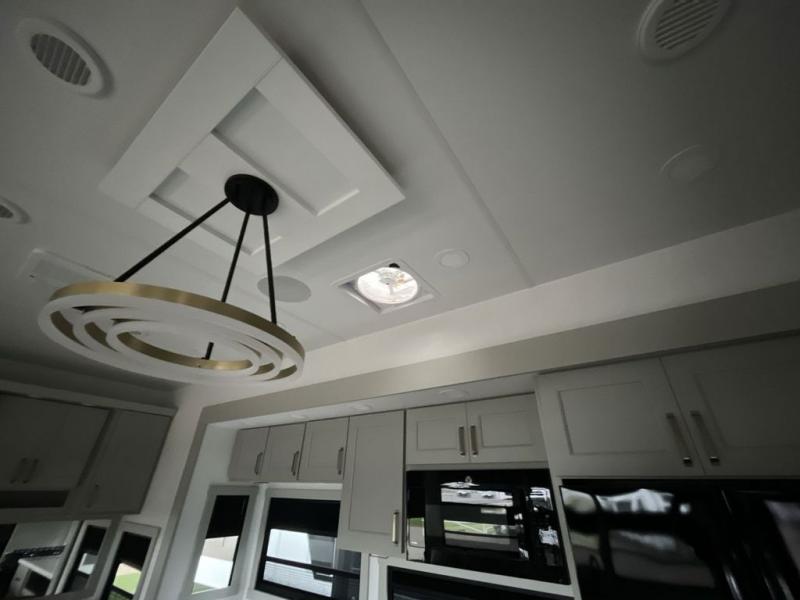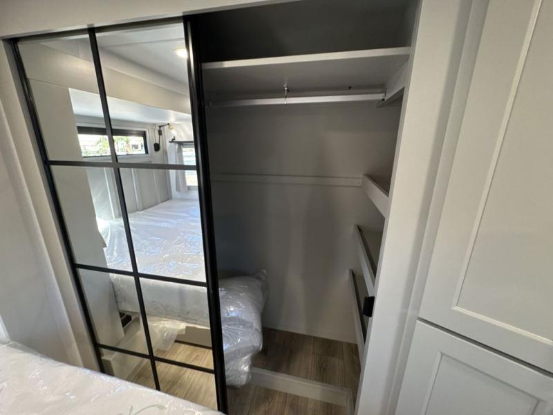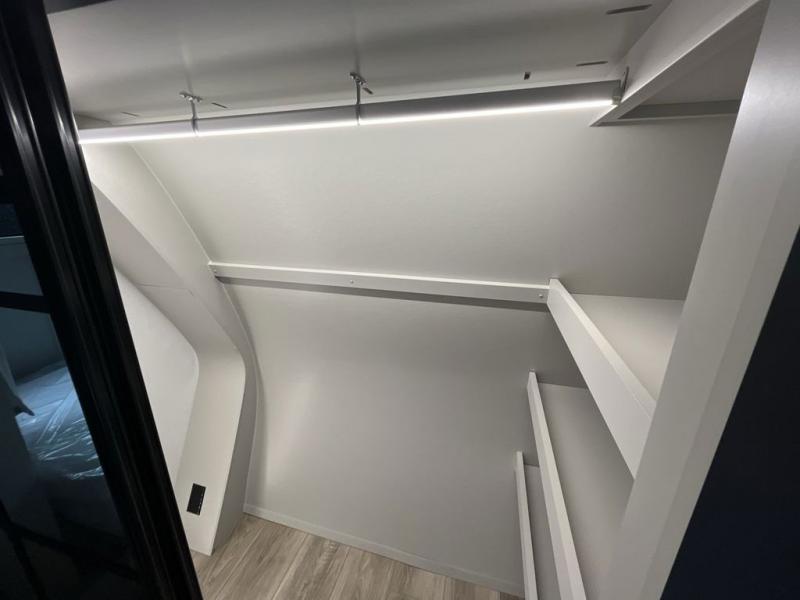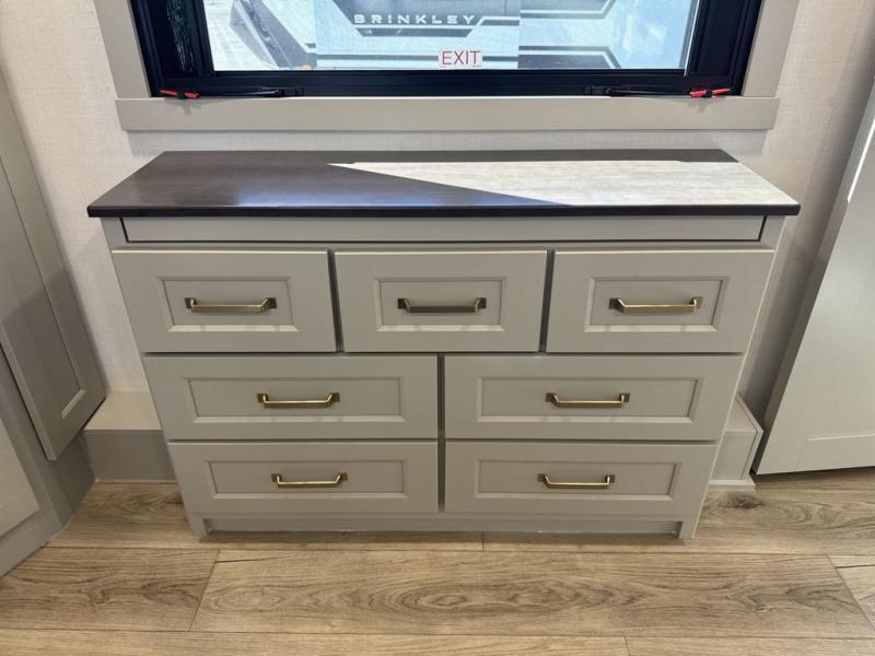 With any Model G toy hauler fifth wheel by Brinkley you will enjoy luxurious amenities, tons of storage space, and innovative features that have been developed and tested in the real world. Durable construction includes an industry leading PDI process, an industry best insulation package, and reinforced and walkable slide roofs. Some of the exterior features you'll find are a 3-way pass-through with a multi-functional flip-up bulkhead wall, under I-beam storage, a MAX-Vision reverse lighting system, and a low-maintenance roof to name a few. A Rockford Fosgate audio system comes standard, along with a OneControl app system that lets you control your fifth wheel's functions right from your mobile device. You will find the solar system with a designated storage area to be ultra convenient, plus there is a FlexPower 5500 with a dual fuel inverter generator for all your power needs. Head inside to find a residential interior with Brinkley's CraftSense wood trim construction, floating entrance steps, integrated window screens and insulated blackout blinds, and residential solid surface countertops plus backsplash. You will also enjoy the neon shower lighting and recessed medicine cabinets in the bath, plus motion activated LED bed lights and dual bedside outlets in the bedroom. Choose a Model G toy hauler fifth wheel to experience all the luxury it has to offer!