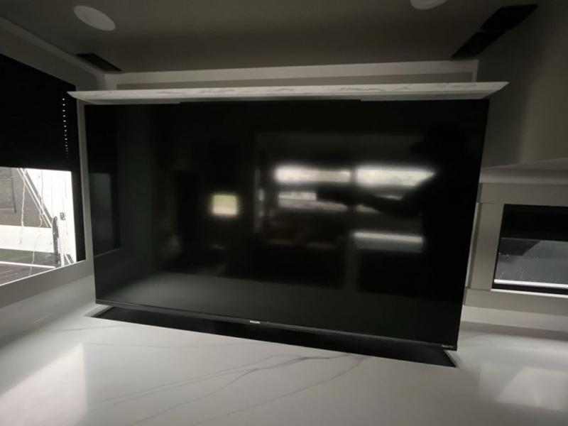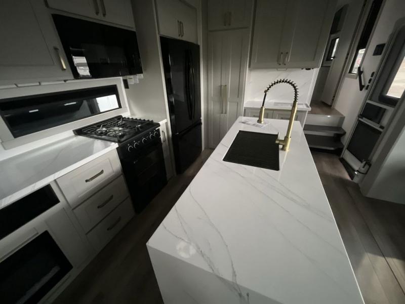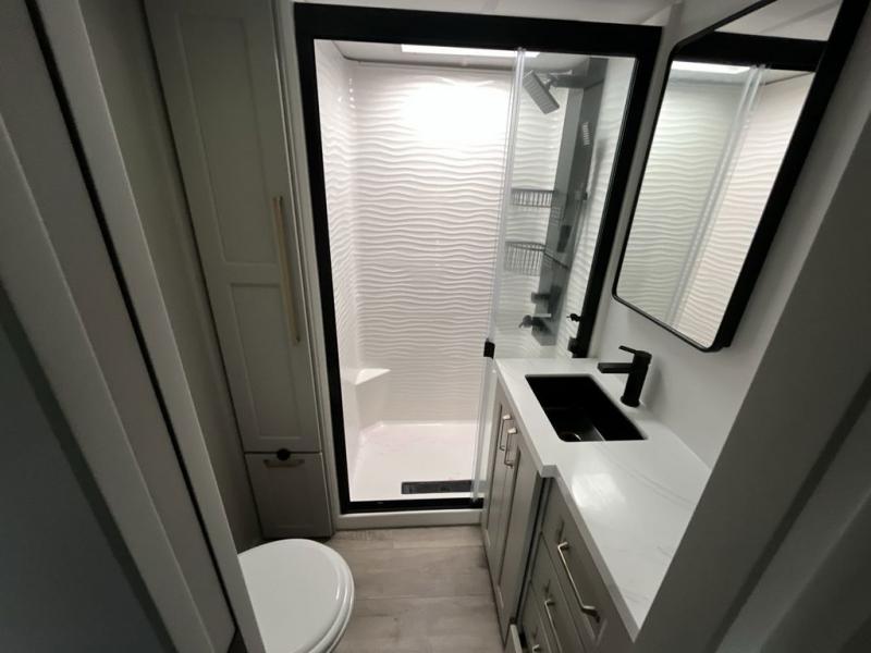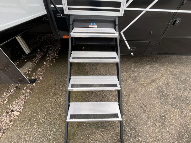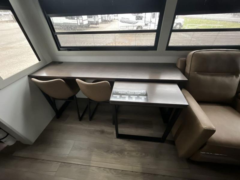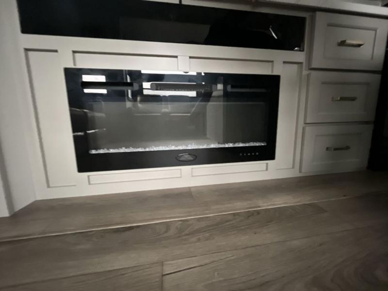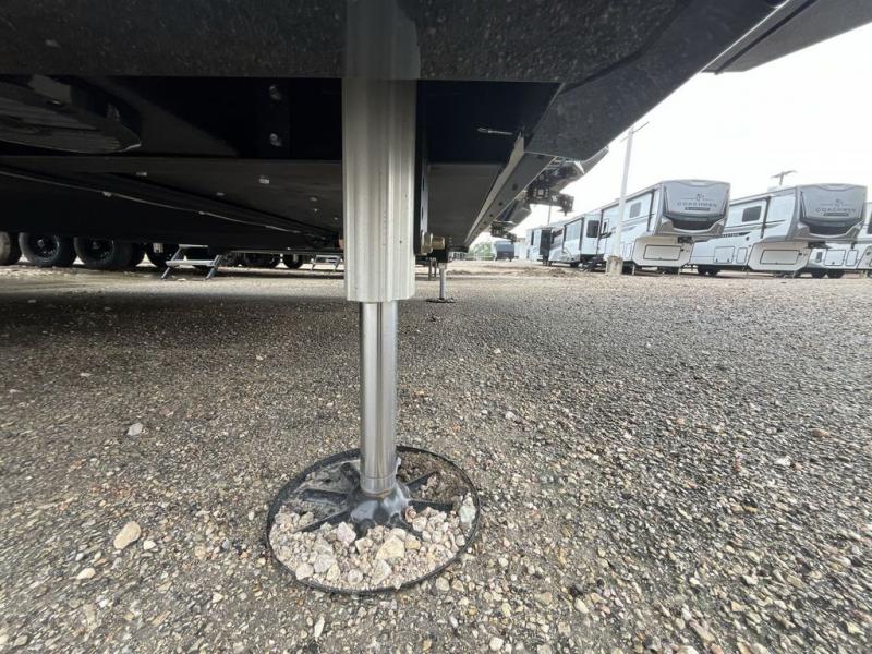 The front bedroom is a serene retreat, featuring a plush king bed, spacious walk-in closet, 32” smart TV, sliding dresser top, and hidden storage for better organization.The bathroom is a haven of convenience, boasting a full bathroom with pull-out linen and trash bin, and a spacious 30 x 42 shower. Perfect for freshening up after a long day of adventure! The kitchen has a pantry featuring adjustable shelving, a hutch, 19 cu. refrigerator, microwave, four-burner cooktop, kitchen island, and convertible dining table/L-desk. Plus, pet bowls for your furry friends! Gather with family and friends in the living room, which features a dual sofa with two recliners, each with heat and massage functions, a televator, and a cozy fireplace. It's the perfect spot to relax and unwind! The garage has a half bathroom, two sofas, and a 43” smart TV, ideal for game days, movie nights, or just relaxing with friends. Outside, enjoy the convenience of a fuel station, three-way pass-thru storage, and LP quick connect. Whether you're an adventure-seeker, or just love to travel in style, this toy hauler has everything you need and more!