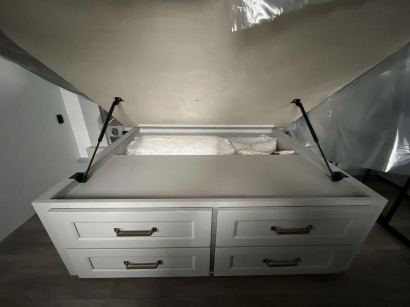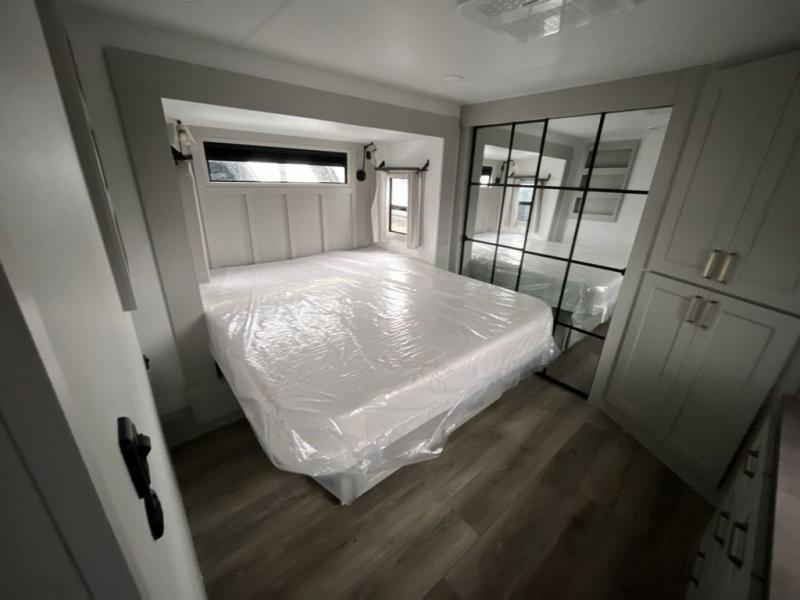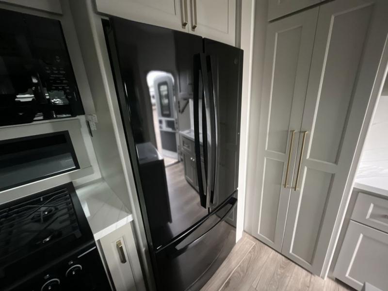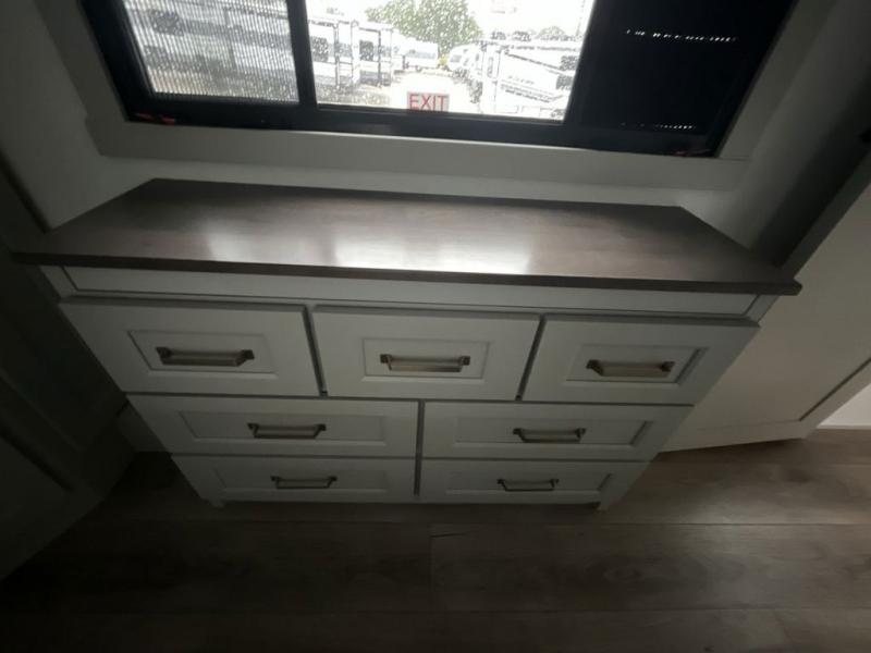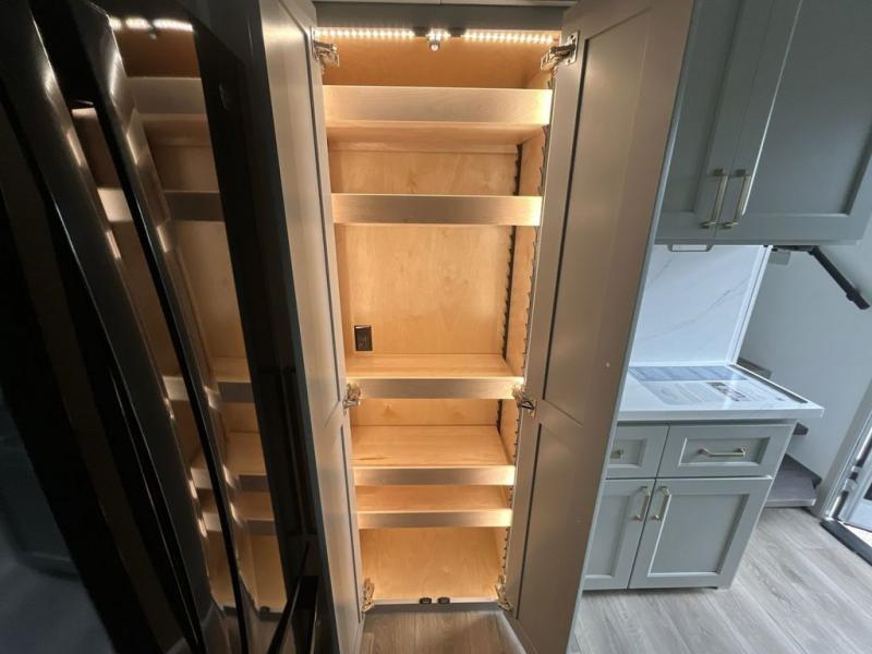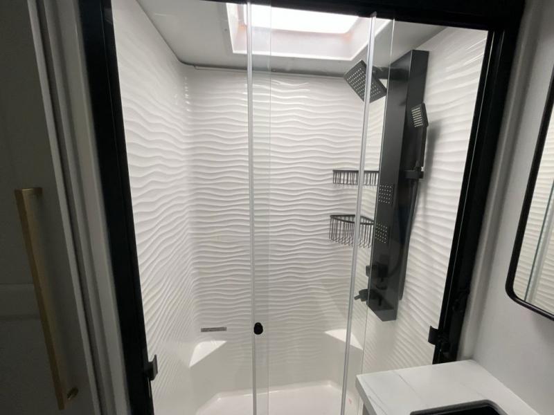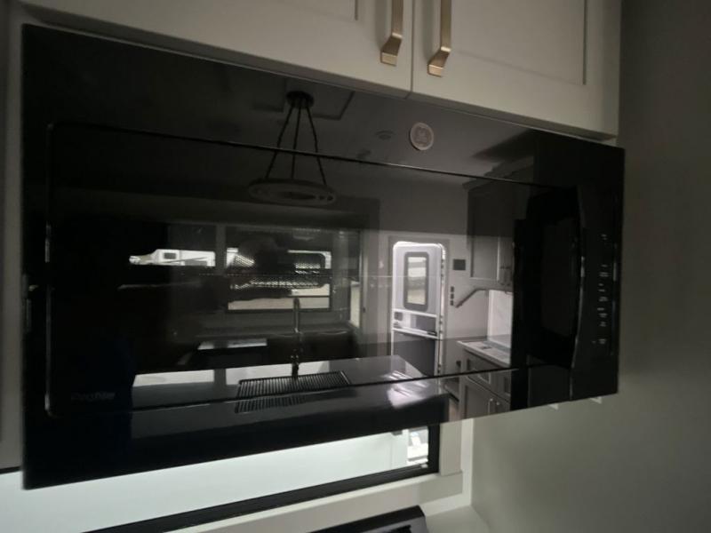 The front bedroom is a serene retreat, featuring a plush king bed, spacious walk-in closet, 32” smart TV, sliding dresser top, and hidden storage for better organization.The bathroom is a haven of convenience, boasting a full bathroom with pull-out linen and trash bin, and a spacious 30 x 42 shower. Perfect for freshening up after a long day of adventure! The kitchen has a pantry featuring adjustable shelving, a hutch, 19 cu. refrigerator, microwave, four-burner cooktop, kitchen island, and convertible dining table/L-desk. Plus, pet bowls for your furry friends! Gather with family and friends in the living room, which features a dual sofa with two recliners, each with heat and massage functions, a televator, and a cozy fireplace. It's the perfect spot to relax and unwind! The garage has a half bathroom, two sofas, and a 43” smart TV, ideal for game days, movie nights, or just relaxing with friends. Outside, enjoy the convenience of a fuel station, three-way pass-thru storage, and LP quick connect. Whether you're an adventure-seeker, or just love to travel in style, this toy hauler has everything you need and more!