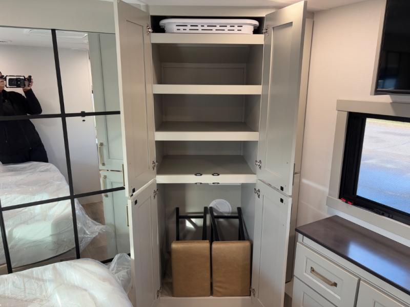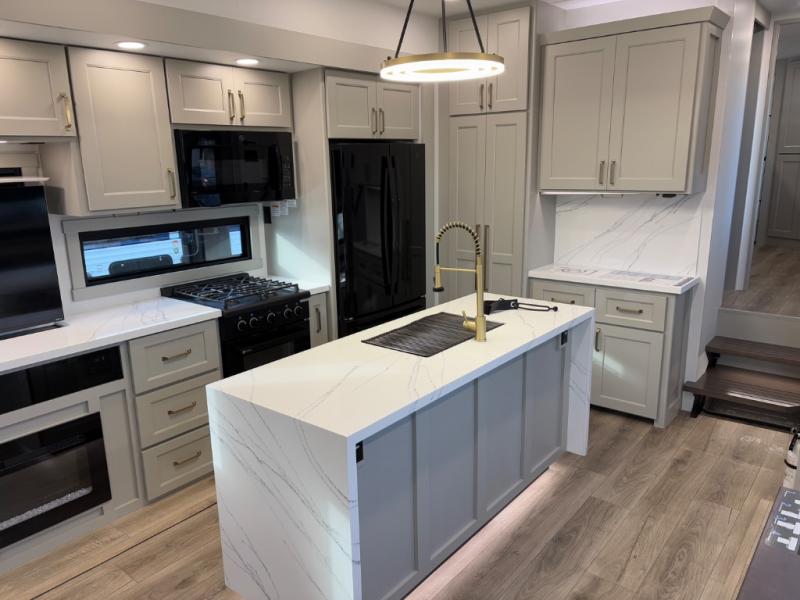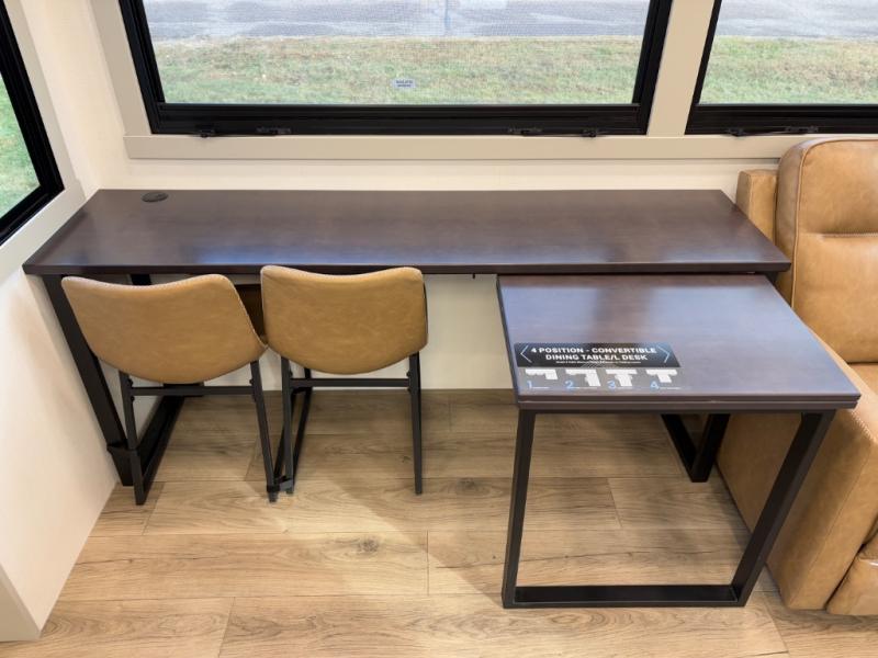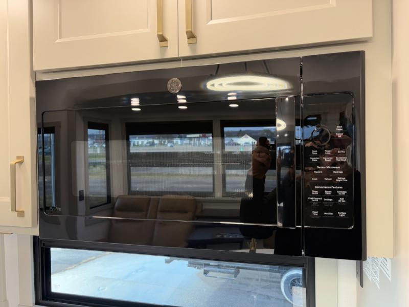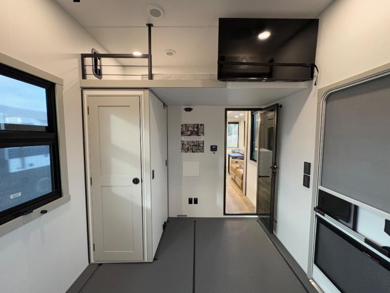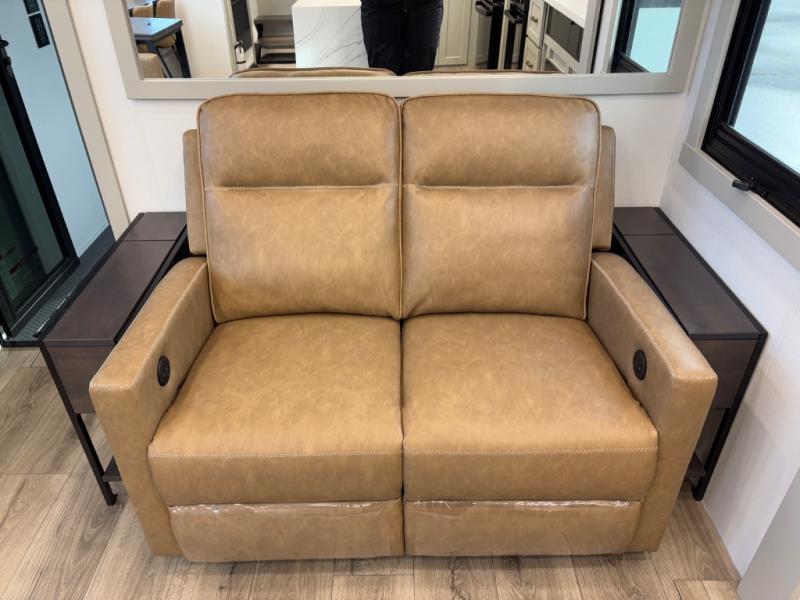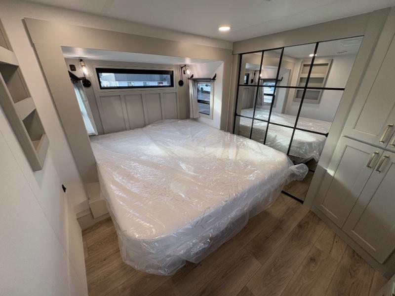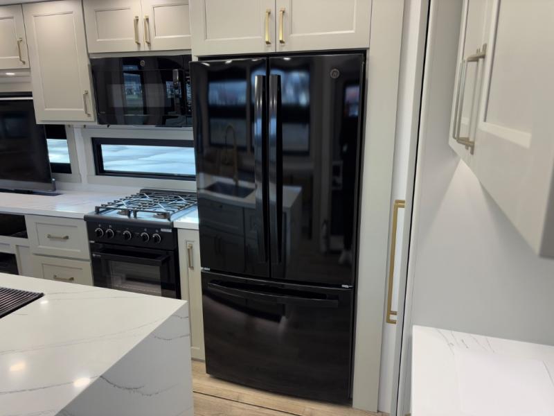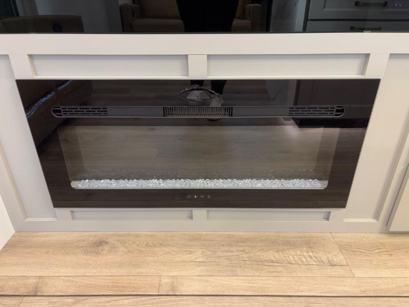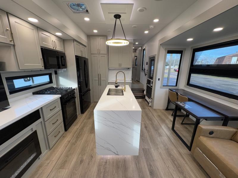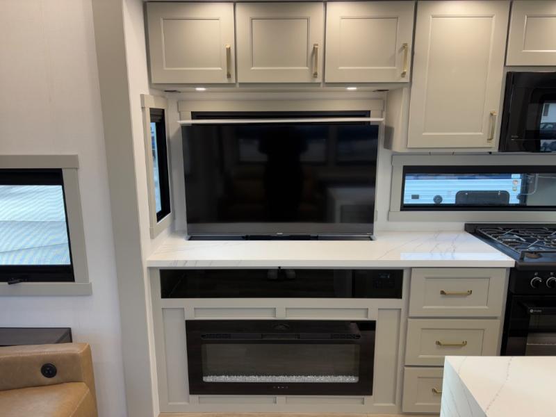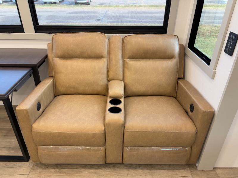The front bedroom is a serene retreat, featuring a plush king bed, spacious walk-in closet, 32” smart TV, sliding dresser top, and hidden storage for better organization.The bathroom is a haven of convenience, boasting a full bathroom with pull-out linen and trash bin, and a spacious 30 x 42 shower. Perfect for freshening up after a long day of adventure! The kitchen has a pantry featuring adjustable shelving, a hutch, 19 cu. refrigerator, microwave, four-burner cooktop, kitchen island, and convertible dining table/L-desk. Plus, pet bowls for your furry friends! Gather with family and friends in the living room, which features a dual sofa with two recliners, each with heat and massage functions, a televator, and a cozy fireplace. It's the perfect spot to relax and unwind! The garage has a half bathroom, two sofas, and a 43” smart TV, ideal for game days, movie nights, or just relaxing with friends. Outside, enjoy the convenience of a fuel station, three-way pass-thru storage, and LP quick connect. Whether you're an adventure-seeker, or just love to travel in style, this toy hauler has everything you need and more!