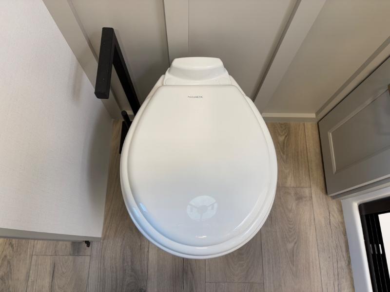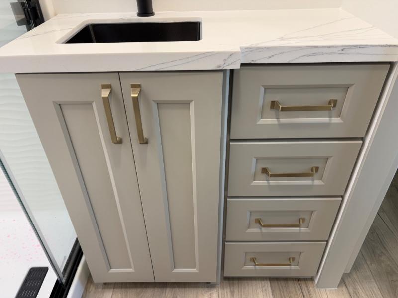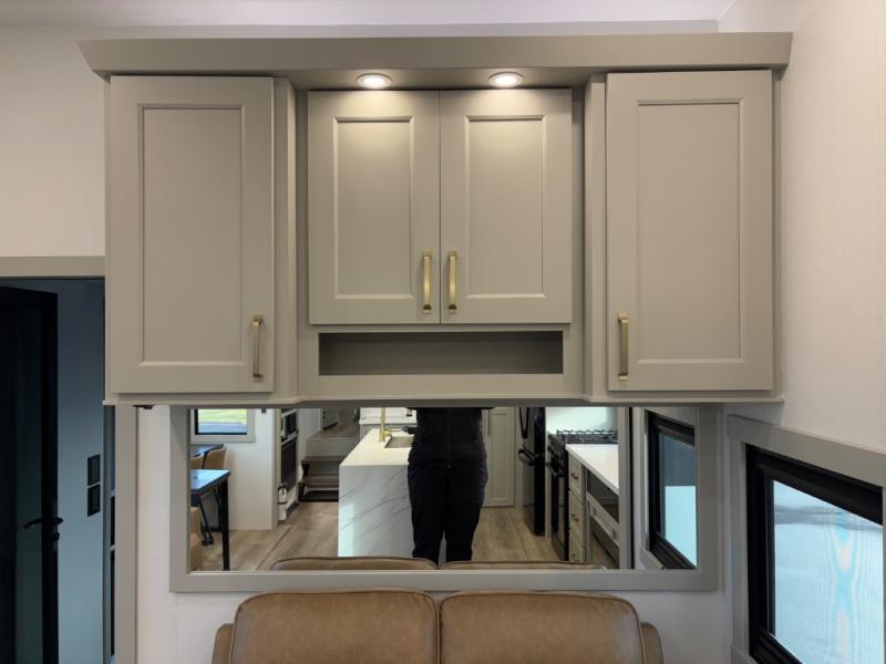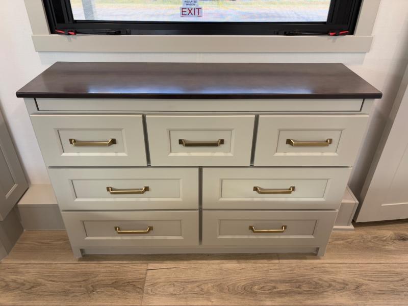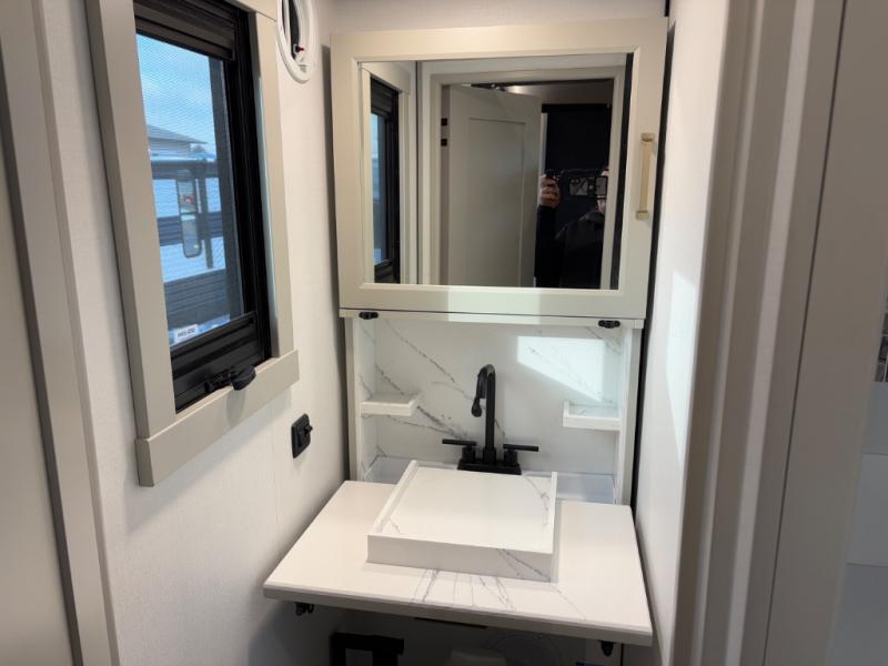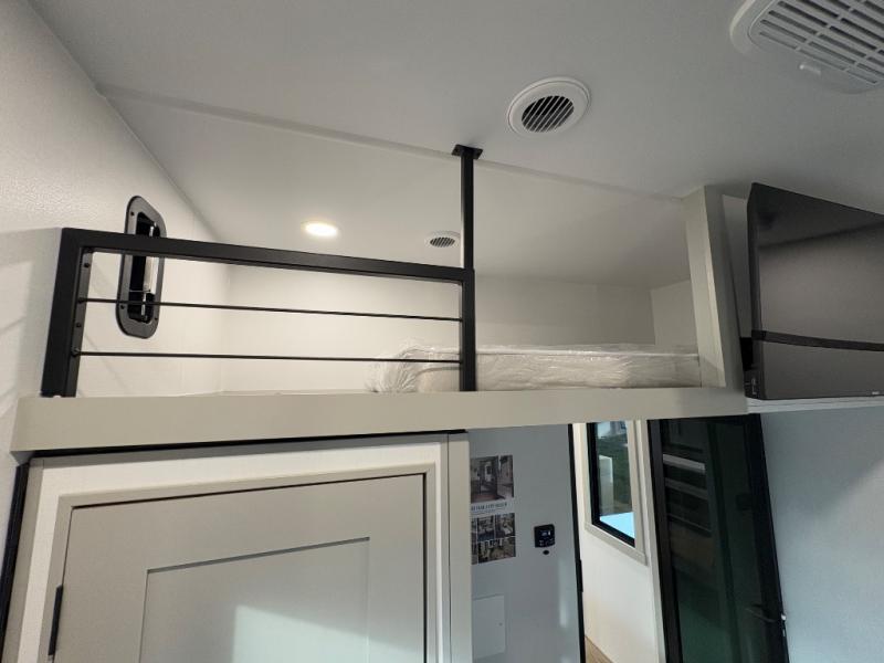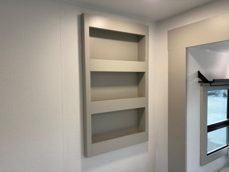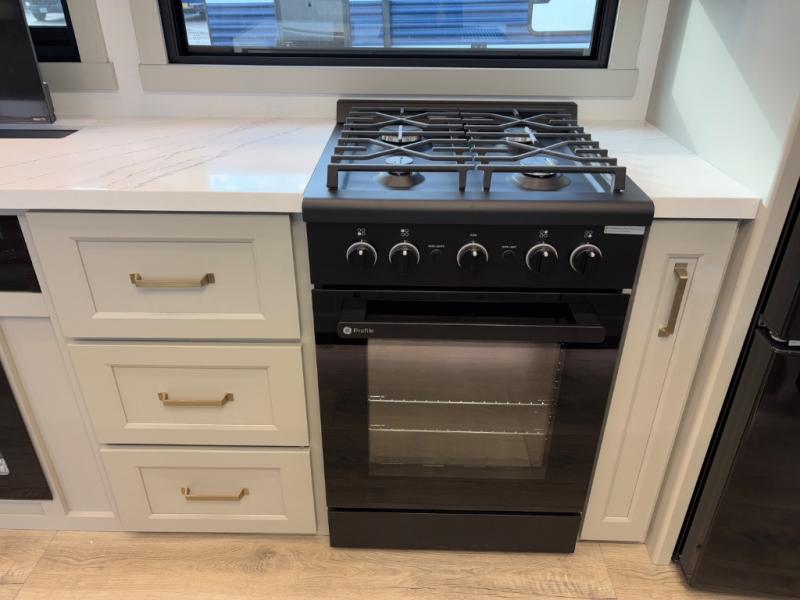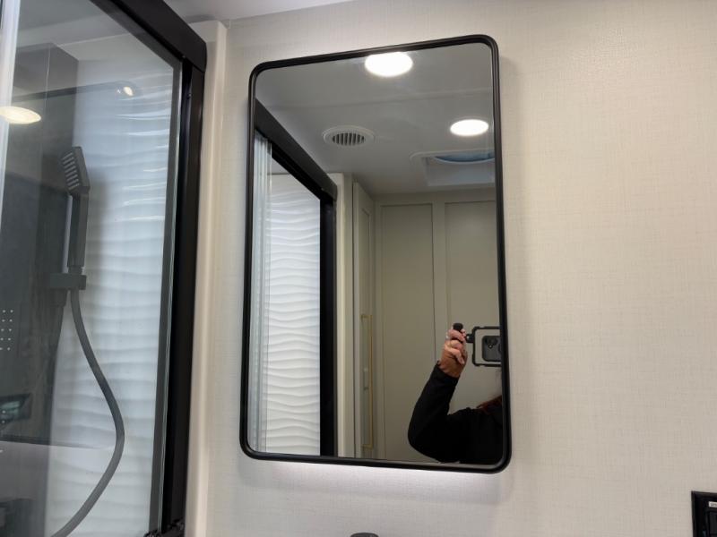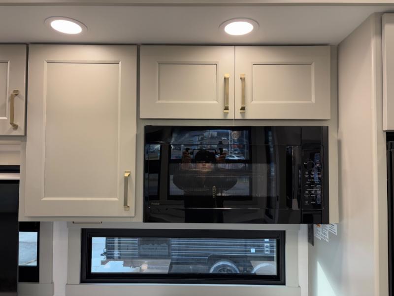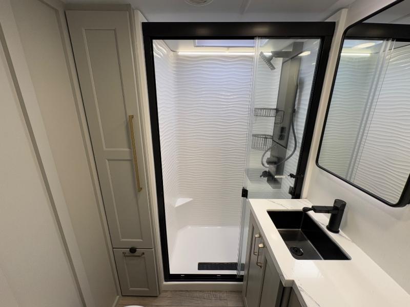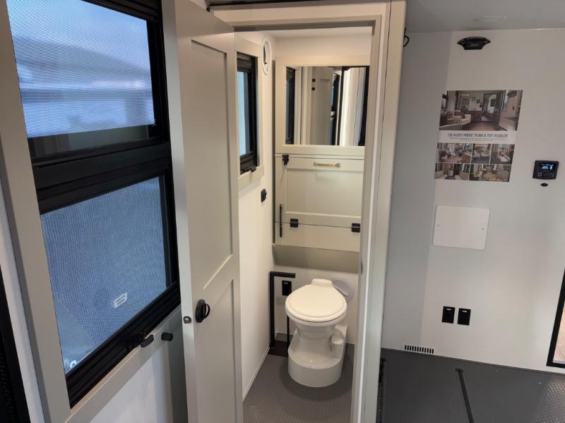 The front bedroom is a serene retreat, featuring a plush king bed, spacious walk-in closet, 32” smart TV, sliding dresser top, and hidden storage for better organization.The bathroom is a haven of convenience, boasting a full bathroom with pull-out linen and trash bin, and a spacious 30 x 42 shower. Perfect for freshening up after a long day of adventure! The kitchen has a pantry featuring adjustable shelving, a hutch, 19 cu. refrigerator, microwave, four-burner cooktop, kitchen island, and convertible dining table/L-desk. Plus, pet bowls for your furry friends! Gather with family and friends in the living room, which features a dual sofa with two recliners, each with heat and massage functions, a televator, and a cozy fireplace. It's the perfect spot to relax and unwind! The garage has a half bathroom, two sofas, and a 43” smart TV, ideal for game days, movie nights, or just relaxing with friends. Outside, enjoy the convenience of a fuel station, three-way pass-thru storage, and LP quick connect. Whether you're an adventure-seeker, or just love to travel in style, this toy hauler has everything you need and more!