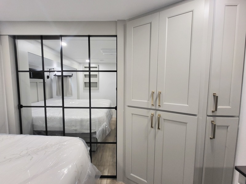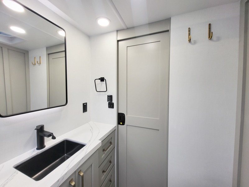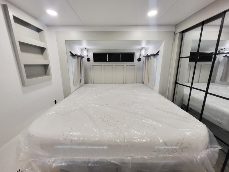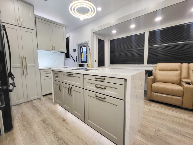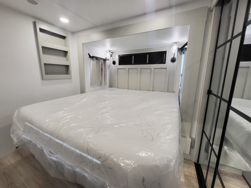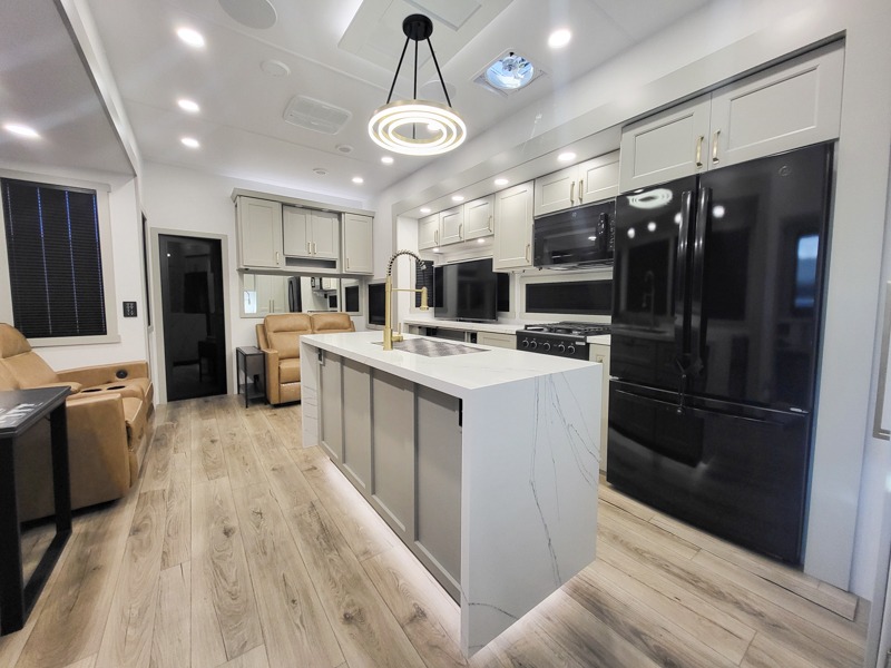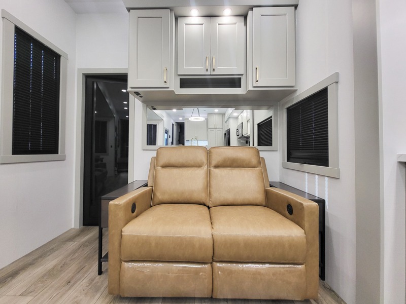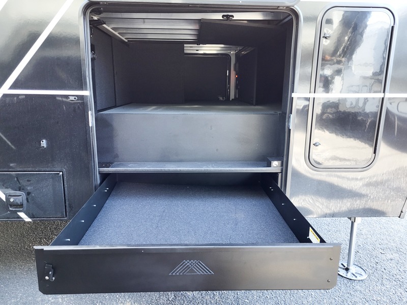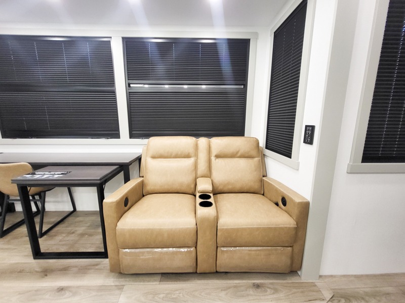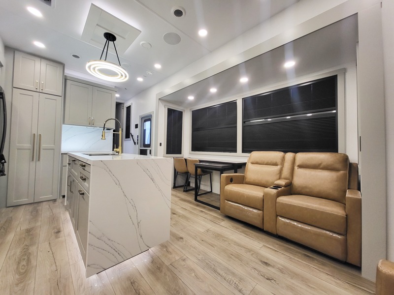 With any Model G toy hauler fifth wheel by Brinkley you will enjoy luxurious amenities, tons of storage space, and innovative features that have been developed and tested in the real world. Durable construction includes an industry leading PDI process, an industry best insulation package, and reinforced and walkable slide roofs. Some of the exterior features you'll find are a 3-way pass-through with a multi-functional flip-up bulkhead wall, under I-beam storage, a MAX-Vision reverse lighting system, and a low-maintenance roof to name a few. A Rockford Fosgate audio system comes standard, along with a OneControl app system that lets you control your fifth wheel's functions right from your mobile device. You will find the solar system with a designated storage area to be ultra convenient, plus there is a FlexPower 5500 with a dual fuel inverter generator for all your power needs. Head inside to find a residential interior with Brinkley's CraftSense wood trim construction, floating entrance steps, integrated window screens and insulated blackout blinds, and residential solid surface countertops plus backsplash. You will also enjoy the neon shower lighting and recessed medicine cabinets in the bath, plus motion activated LED bed lights and dual bedside outlets in the bedroom. Choose a Model G toy hauler fifth wheel to experience all the luxury it has to offer!