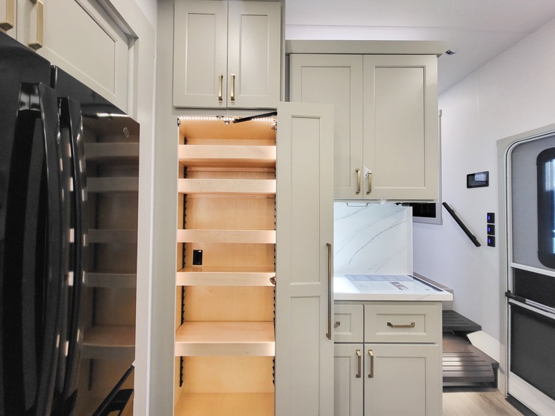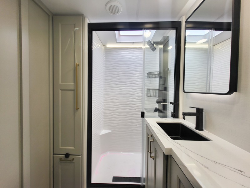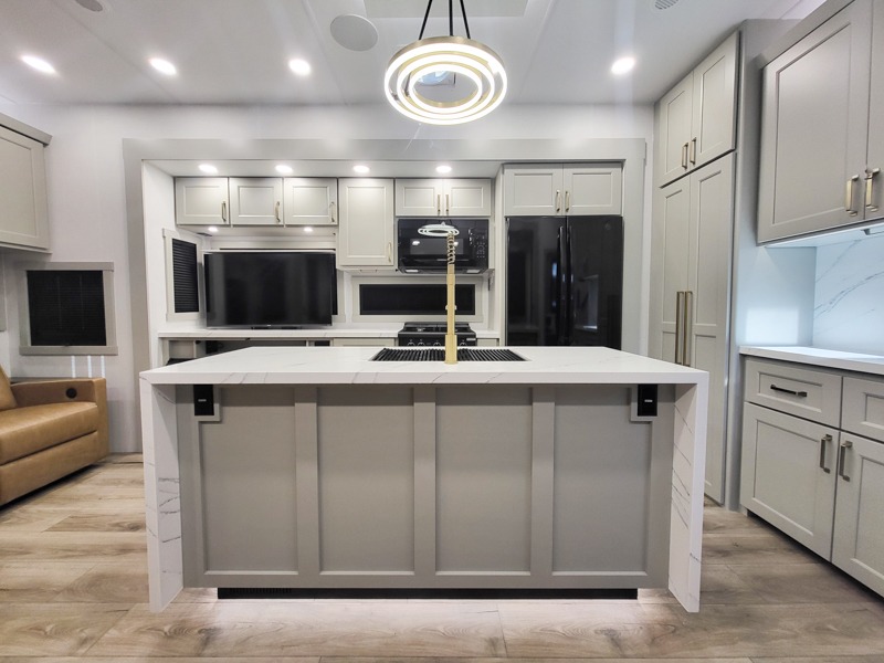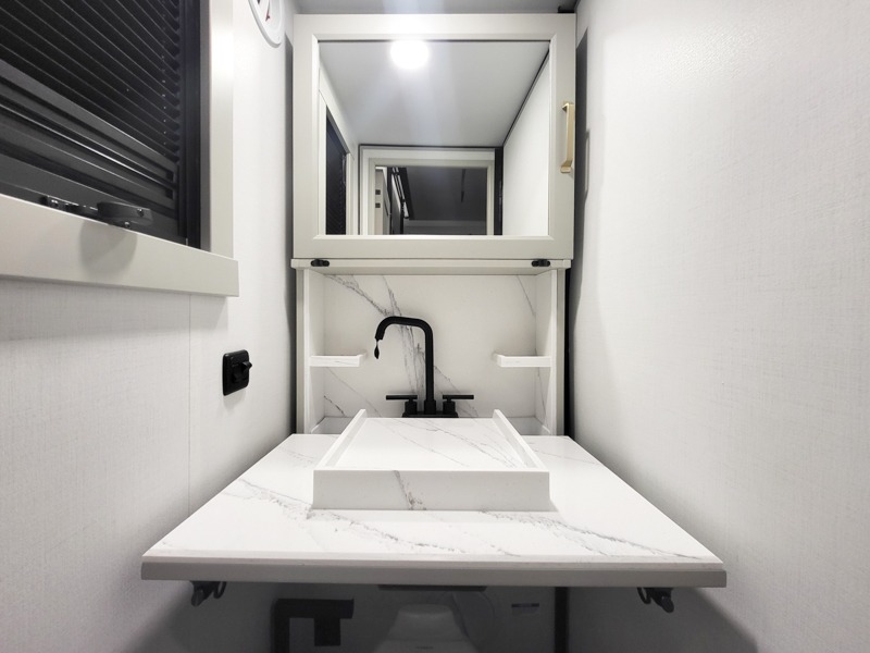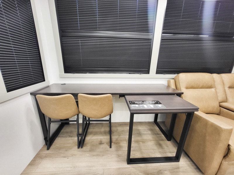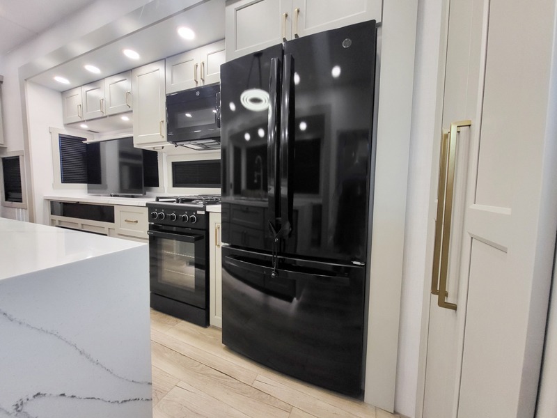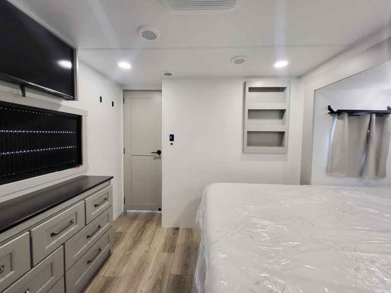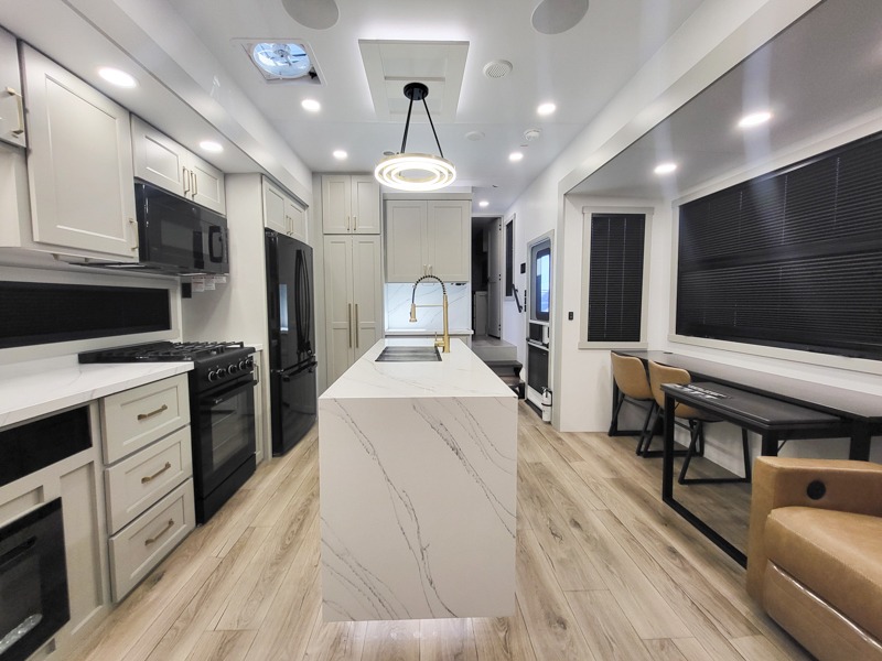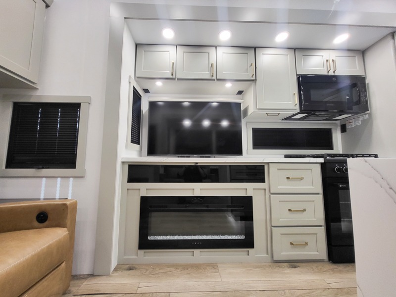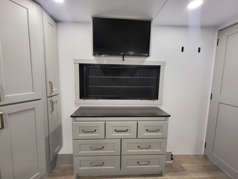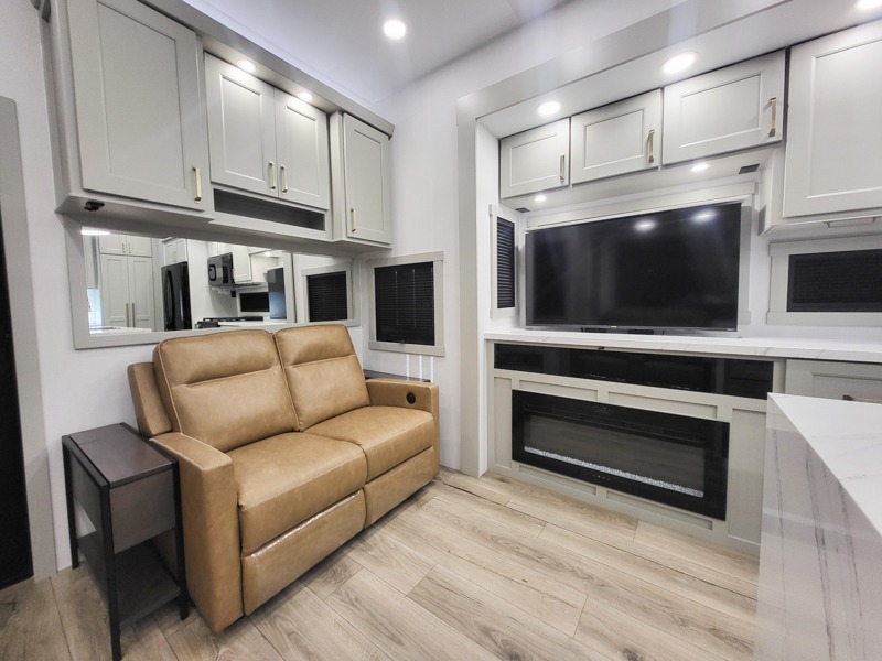 The front bedroom is a serene retreat, featuring a plush king bed, spacious walk-in closet, 32” smart TV, sliding dresser top, and hidden storage for better organization. The bathroom is a haven of convenience, boasting a full bathroom with pull-out linen and trash bin, and a spacious 30" x 42" shower. The kitchen has a pantry featuring adjustable shelving, a hutch, 19 cu. refrigerator, microwave, four-burner cooktop, kitchen island, and convertible dining table/L-desk. Gather with family and friends in the living room, which features a dual sofa with two recliners, each with heat and massage functions, a televator, and a cozy fireplace. The garage has a half bathroom, two sofas, and a 43” smart TV, ideal for game days, movie nights, or just relaxing with friends. Outside, enjoy the convenience of a fuel station, three-way pass-thru storage, and LP quick connect. Whether you're an adventure-seeker, or just love to travel in style, this toy hauler has everything you need and more!