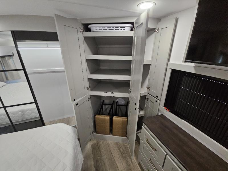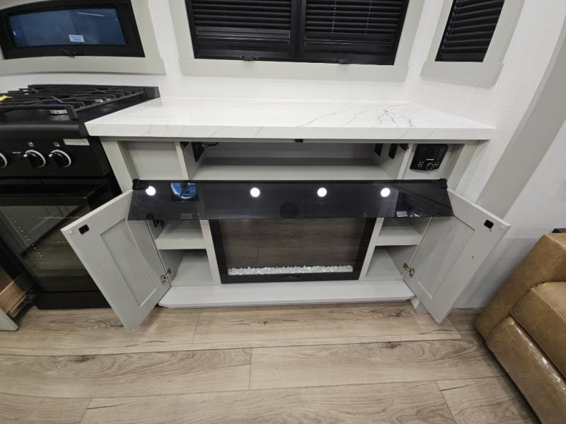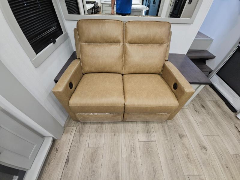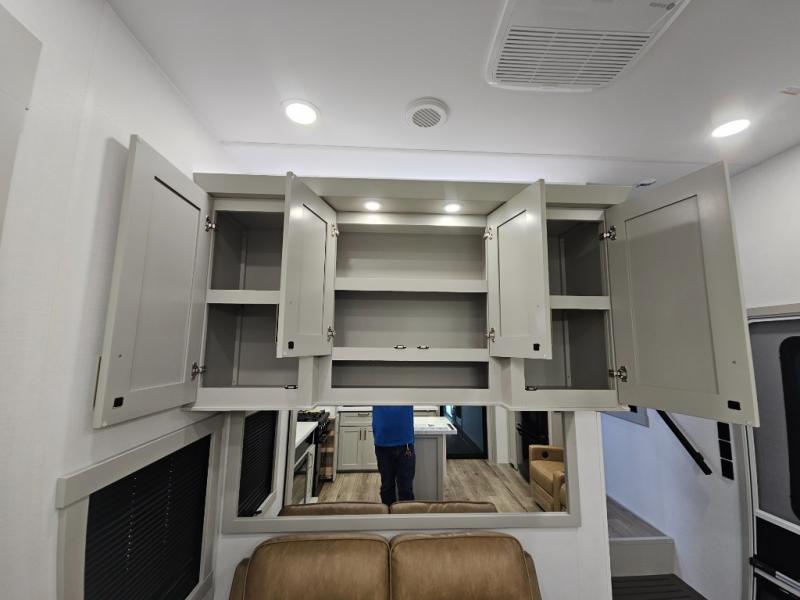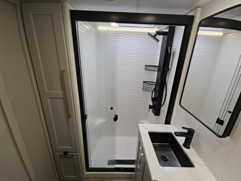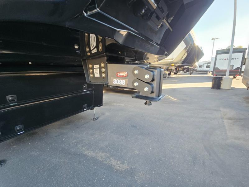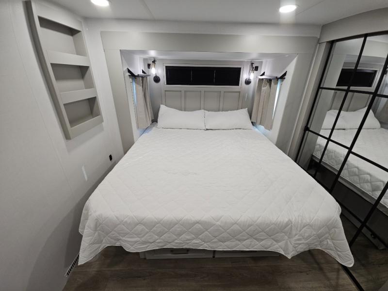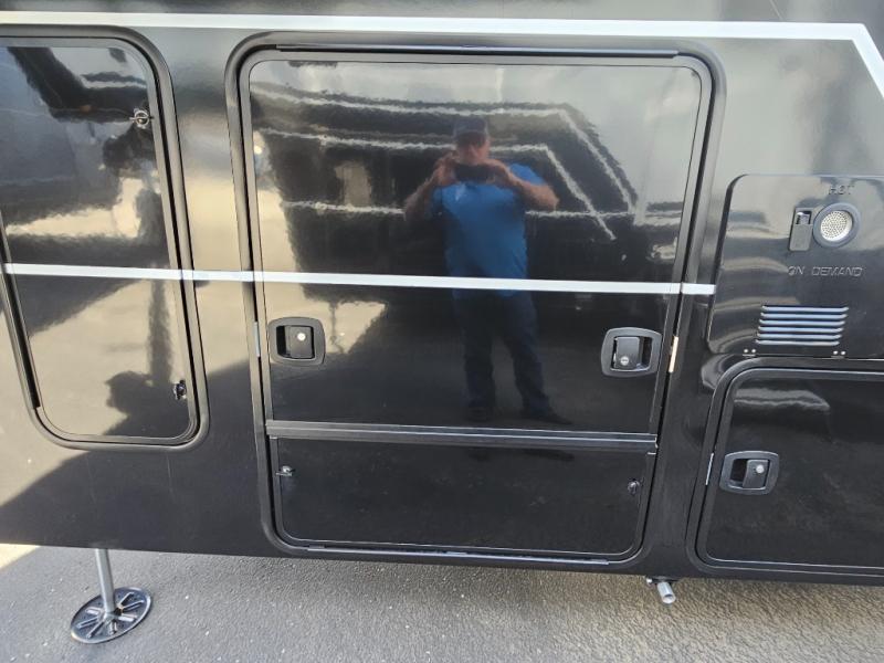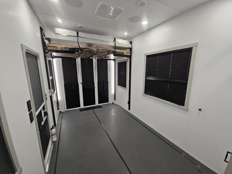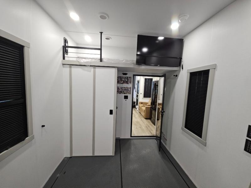 Load up your favorite riding toys and head for the trails in this spacious toy hauler with tons of cargo space! Once the bikes are out, you can relax on the independent dual sofas with a Fold-N Stow Table between or utilize the drop-down bed for a rest. The garage also includes a max-space half bath with fold-away walls and a sink plus a loft/storage for extra sleeping or storage space! Head to the combined kitchen and living area that features dual 2x recliners with heat and massage, dual opposing slides, plus a televator TV and fireplace. The chef of your group will appreciate the waterfall island that converts to a peninsula for more prep space, along with a spice rack and a pull-down utensil tray and knife rack! The spacious full bath includes a residential shower, a space saver door, a solid surface countertop and many more comforts. Last but not least, the front private bedroom will be your own oasis each night that features a king bed slide out, underbed storage drawers and motion lights, a dresser with hidden storage, plus a walk-in closet with cordless vacuum prep and washer/dryer prep!