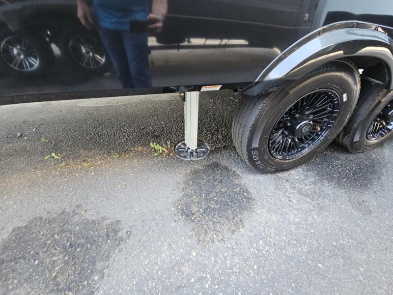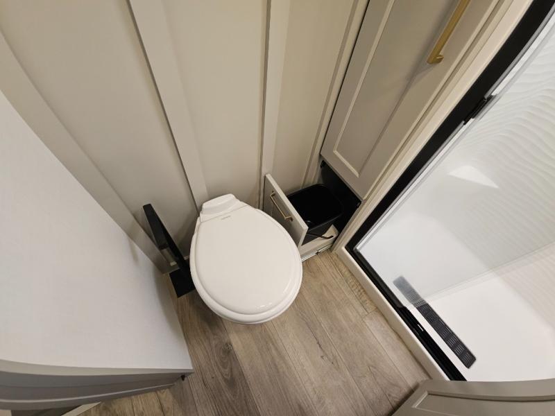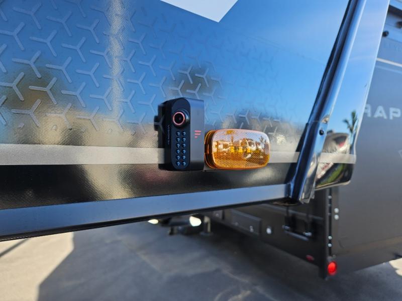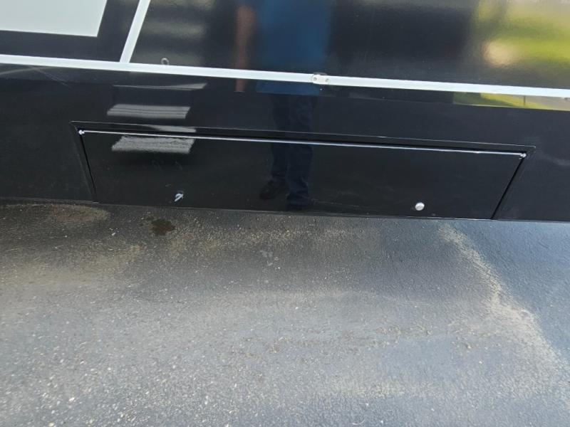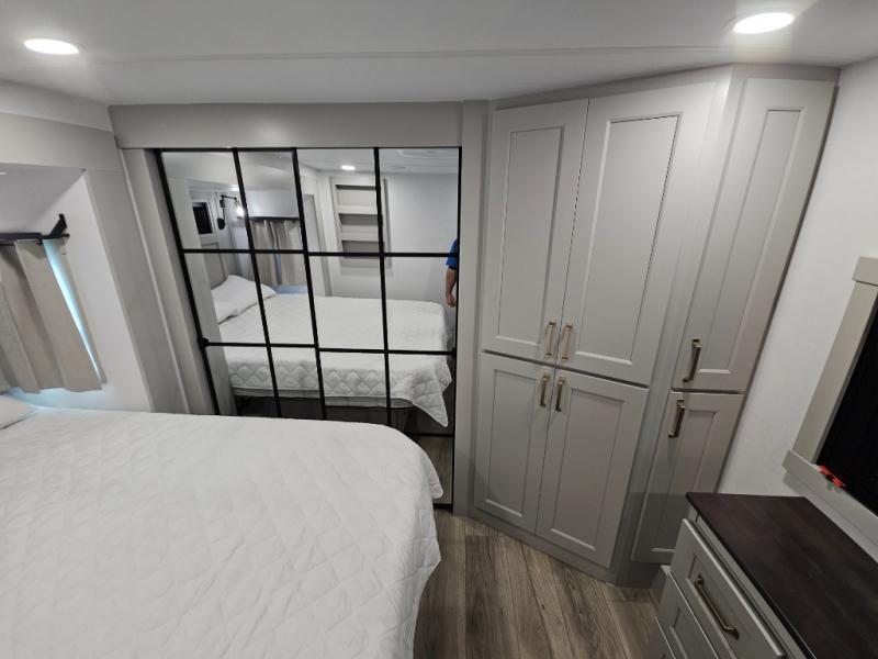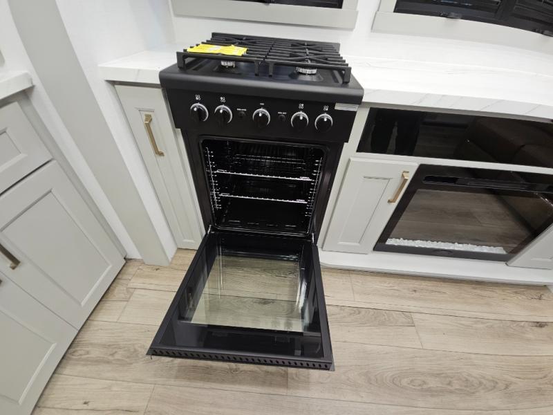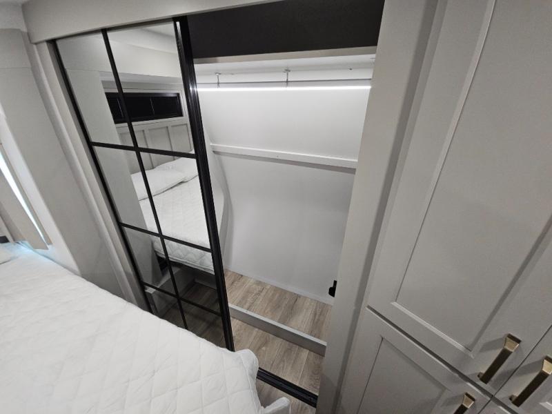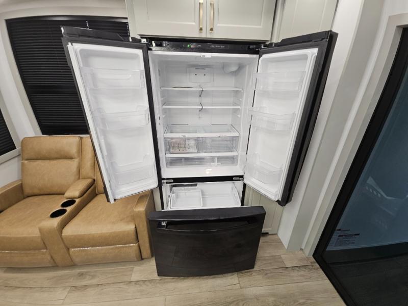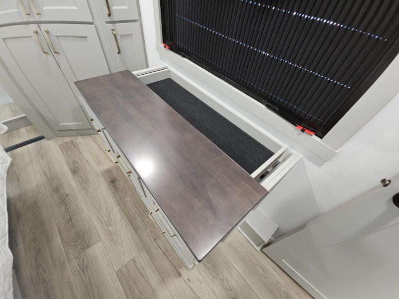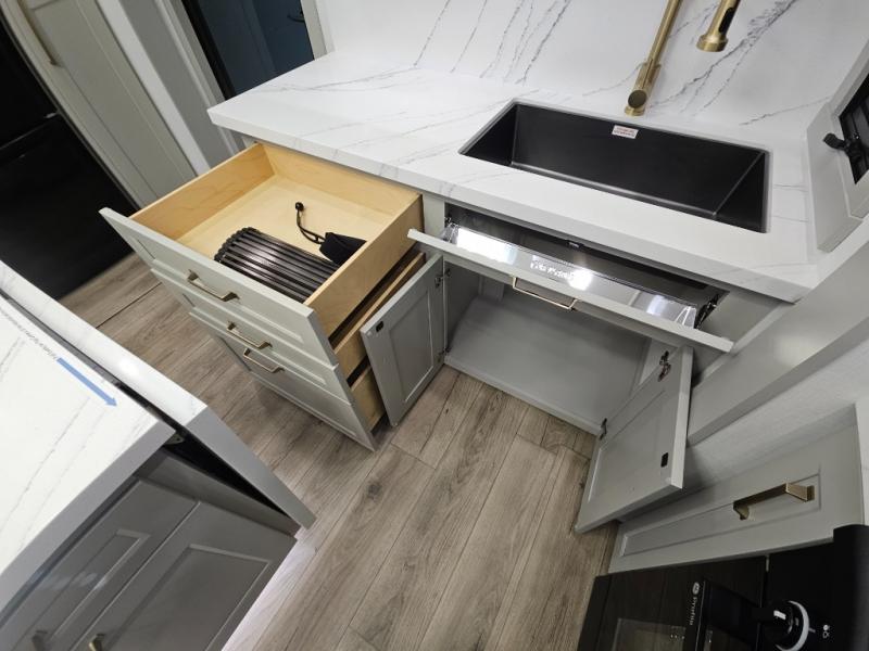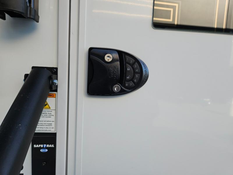 Load up your favorite riding toys and head for the trails in this spacious toy hauler with tons of cargo space! Once the bikes are out, you can relax on the independent dual sofas with a Fold-N Stow Table between or utilize the drop-down bed for a rest. The garage also includes a max-space half bath with fold-away walls and a sink plus a loft/storage for extra sleeping or storage space! Head to the combined kitchen and living area that features dual 2x recliners with heat and massage, dual opposing slides, plus a televator TV and fireplace. The chef of your group will appreciate the waterfall island that converts to a peninsula for more prep space, along with a spice rack and a pull-down utensil tray and knife rack! The spacious full bath includes a residential shower, a space saver door, a solid surface countertop and many more comforts. Last but not least, the front private bedroom will be your own oasis each night that features a king bed slide out, underbed storage drawers and motion lights, a dresser with hidden storage, plus a walk-in closet with cordless vacuum prep and washer/dryer prep!