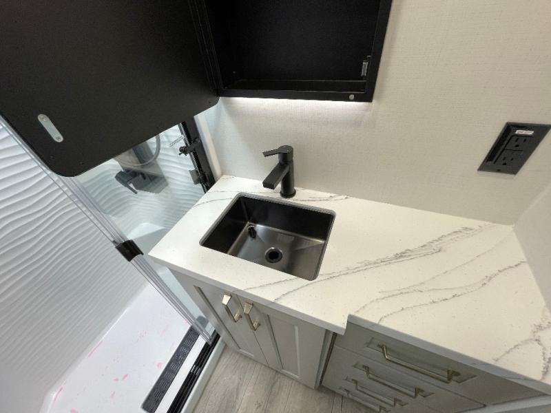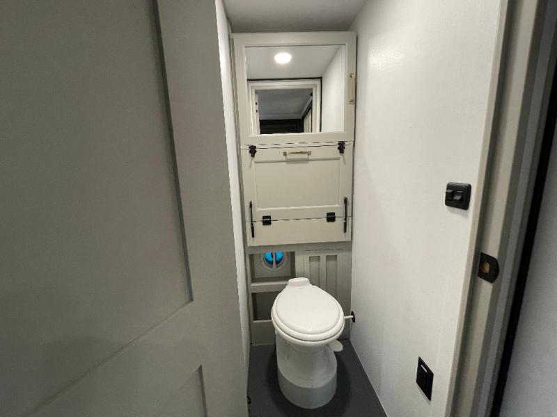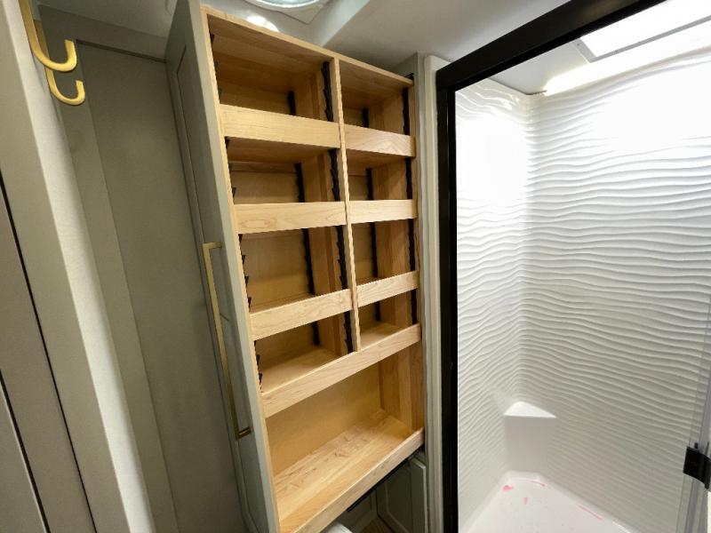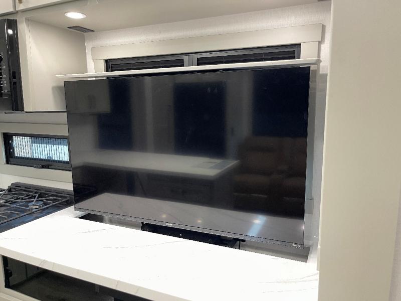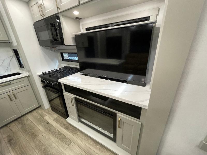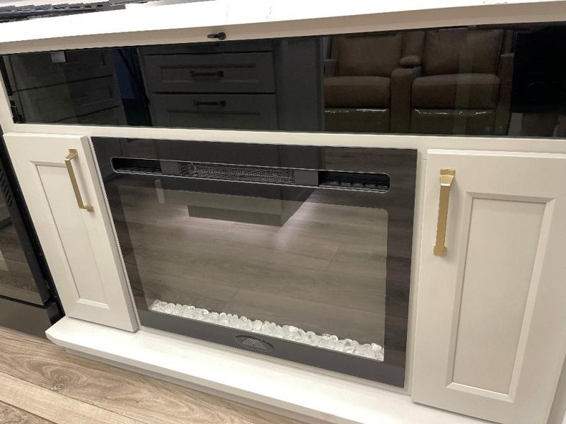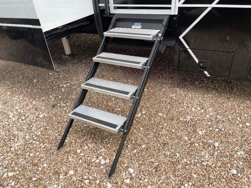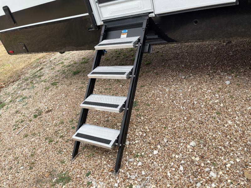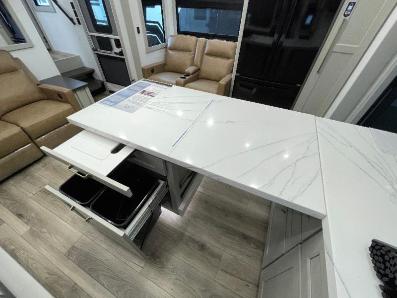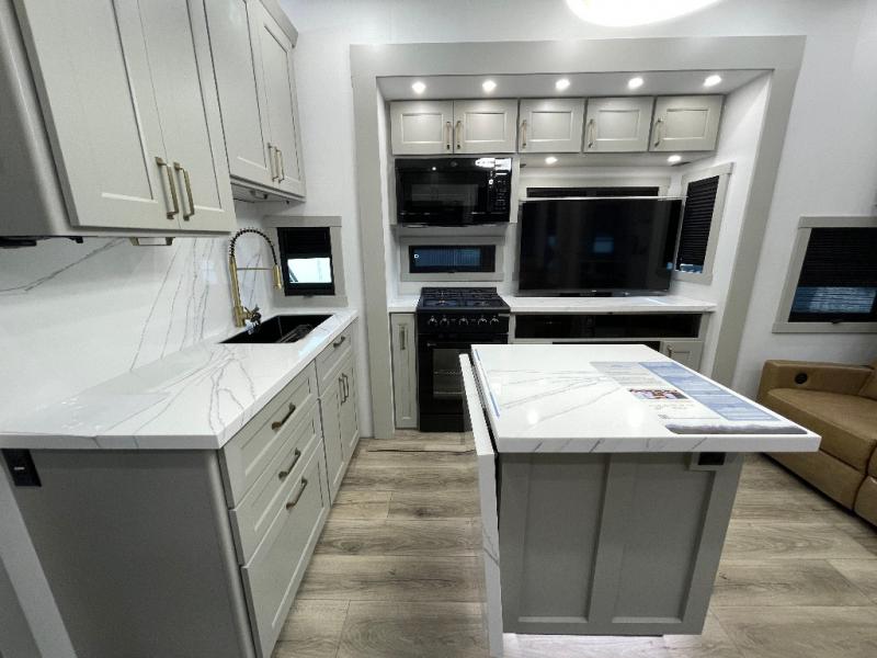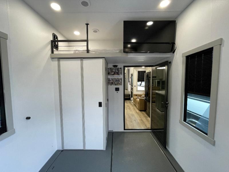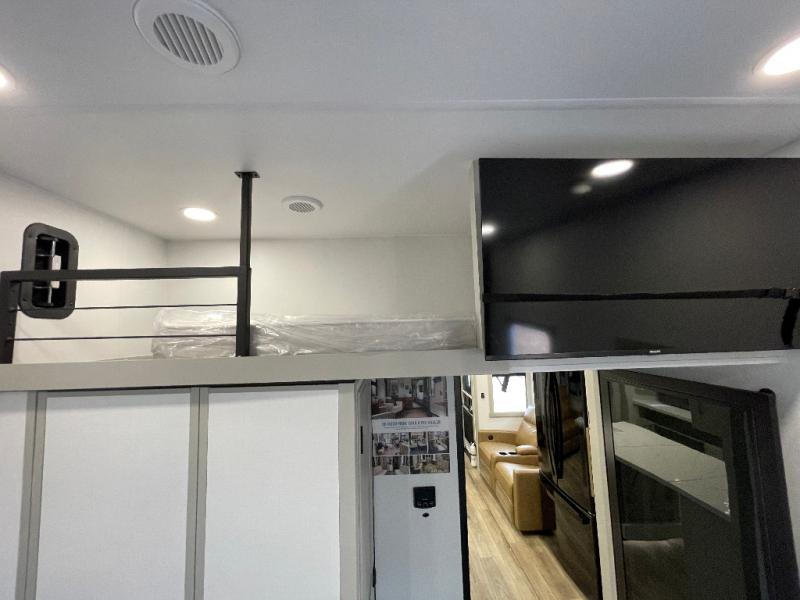 Load up your favorite riding toys and head for the trails in this spacious toy hauler with tons of cargo space! Once the bikes are out, you can relax on the independent dual sofas with a Fold-N Stow Table between or utilize the drop-down bed for a rest. The garage also includes a max-space half bath with fold-away walls and a sink plus a loft/storage for extra sleeping or storage space! Head to the combined kitchen and living area that features dual 2x recliners with heat and massage, dual opposing slides, plus a televator TV and fireplace. The chef of your group will appreciate the waterfall island that converts to a peninsula for more prep space, along with a spice rack and a pull-down utensil tray and knife rack! The spacious full bath includes a residential shower, a space saver door, a solid surface countertop and many more comforts. Last but not least, the front private bedroom will be your own oasis each night that features a king bed slide out, underbed storage drawers and motion lights, a dresser with hidden storage, plus a walk-in closet with cordless vacuum prep and washer/dryer prep!