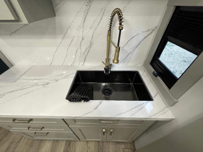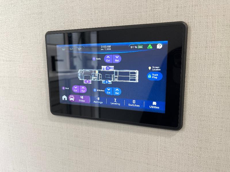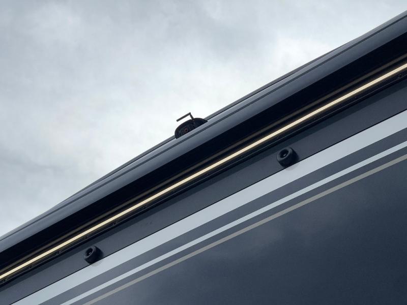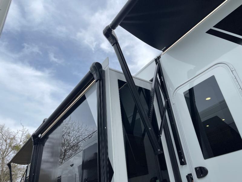 With any Model G toy hauler fifth wheel by Brinkley you will enjoy luxurious amenities, tons of storage space, and innovative features that have been developed and tested in the real world. Durable construction includes an industry leading PDI process, an industry best insulation package, and reinforced and walkable slide roofs. Some of the exterior features you'll find are a 3-way pass-through with a multi-functional flip-up bulkhead wall, under I-beam storage, a MAX-Vision reverse lighting system, and a low-maintenance roof to name a few. A Rockford Fosgate audio system comes standard, along with a Full app-based coach control system (iOS & Android) that lets you control your fifth wheel's functions right from your mobile device. You will find the solar system with a designated storage area to be ultra convenient, plus there is a FlexPower 5500 with a dual fuel inverter generator for all your power needs. Head inside to find a residential interior with Brinkley's CraftSense wood trim construction, floating entrance steps, integrated window screens and insulated blackout blinds, and residential solid surface countertops plus backsplash. You will also enjoy the neon shower lighting and recessed medicine cabinets in the bath, plus motion activated LED bed lights and dual bedside outlets in the bedroom. Choose a Model G toy hauler fifth wheel to experience all the luxury it has to offer!
