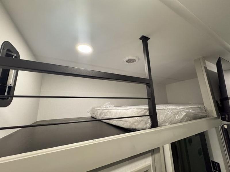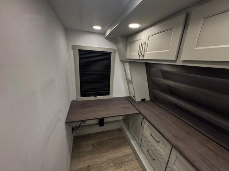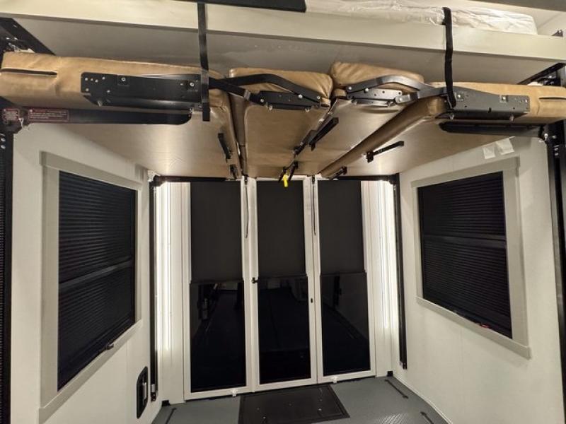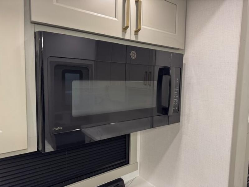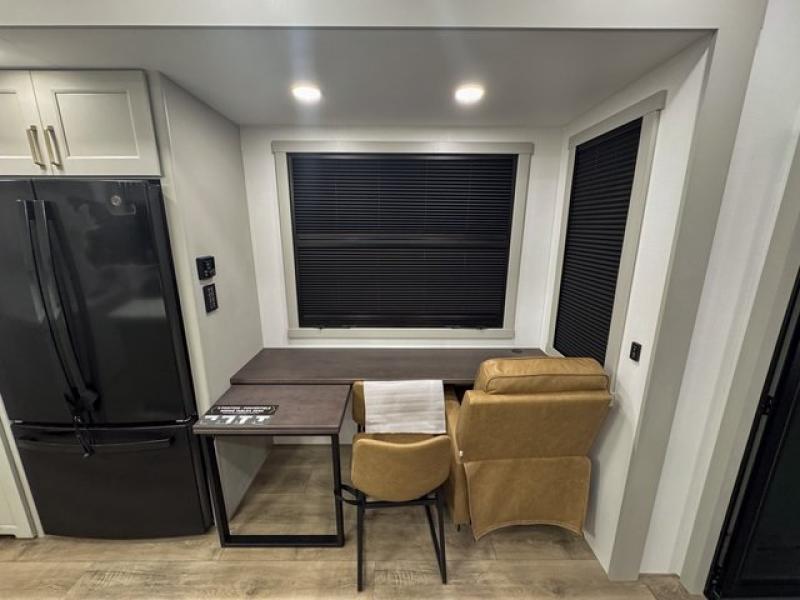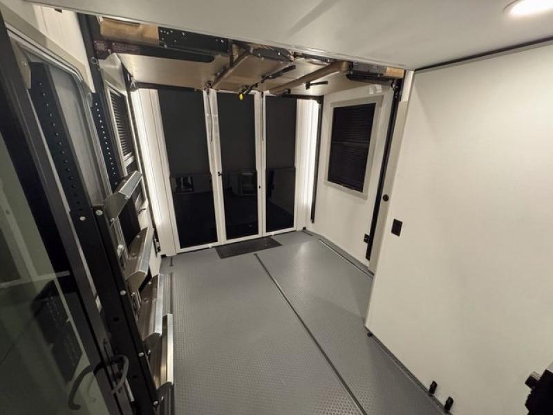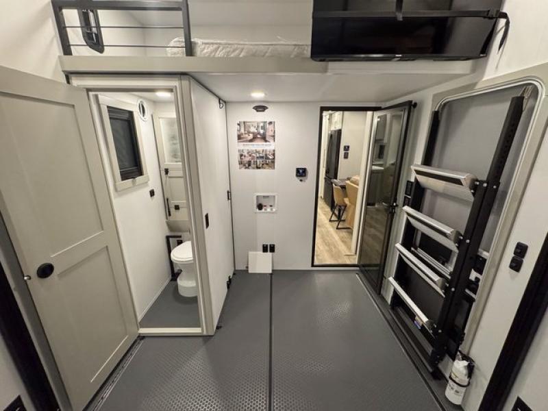 This toy hauler is perfect for those who like to have fun, while still needing an office space to telecommute! The front office includes an adjustable executive L-desk with a hutch and shelves, plus this room is right off of the private bedroom so you can easily get to work in the morning. Once you've made the king-size bed, you can grab your clothes from the dresser with a sliding top, then clean up in the full bathroom. Breakfast can be made on the 24" GE Profile oven with a four-burner range or in the GE Profile convection microwave. The kitchen island includes two stools where you can dine at, or you can sit at the convertible table/L-desk. An L-sofa in the living area sits across an entertainment center with a fireplace, and there is more seating space in the 11' garage. Here, you'll find a loft/storage with a twin bed, a max space half bath with fold-away walls and a sink, plus independent dual sofas with a Fold-N Stow Table and drop-down bed above.