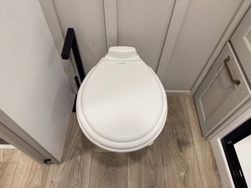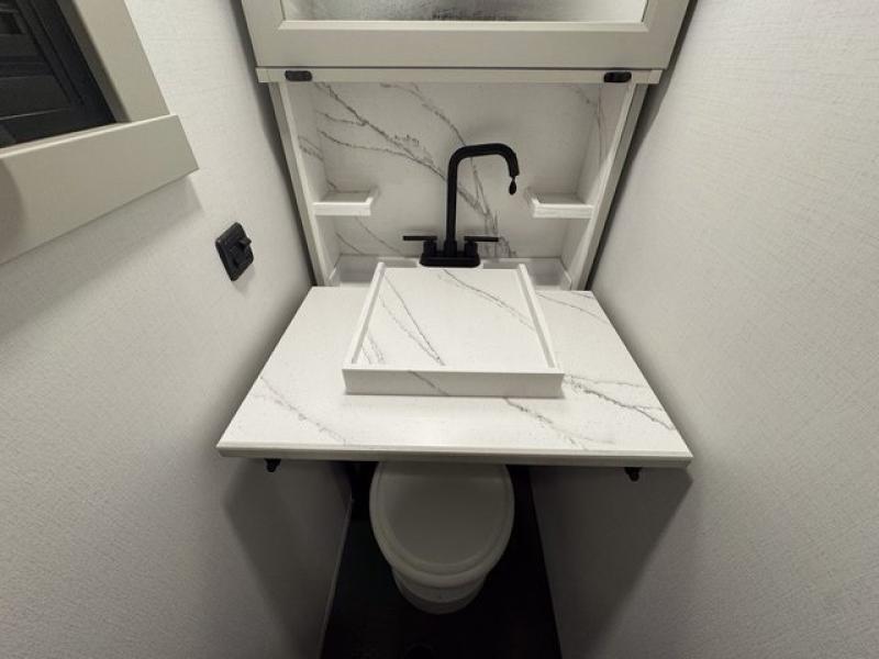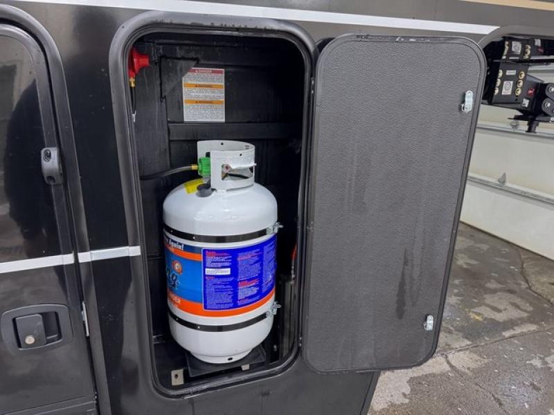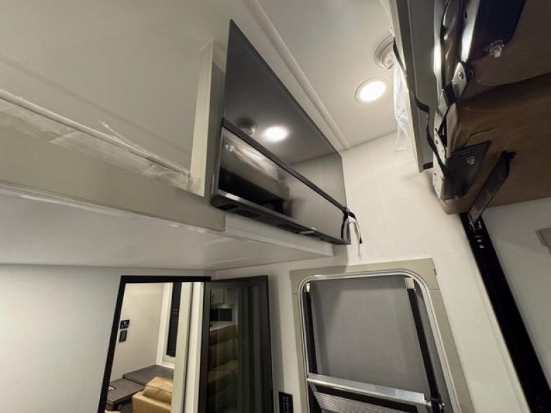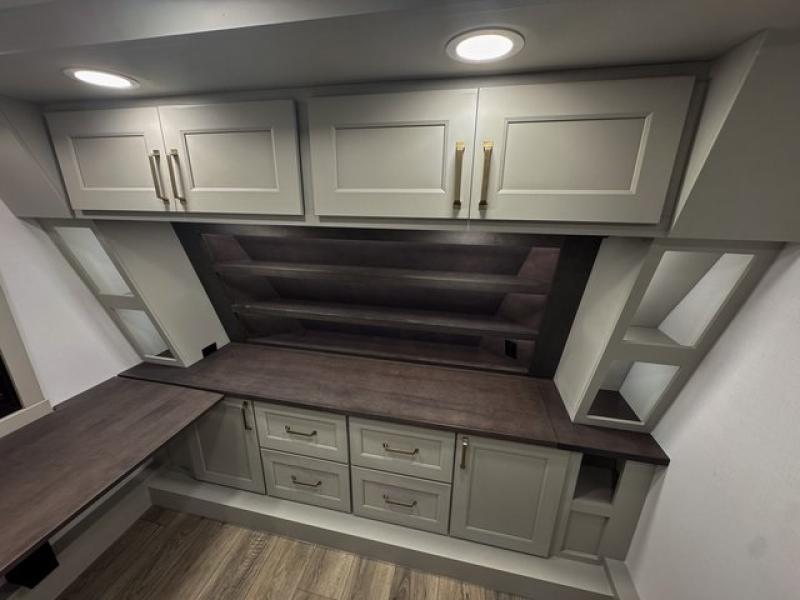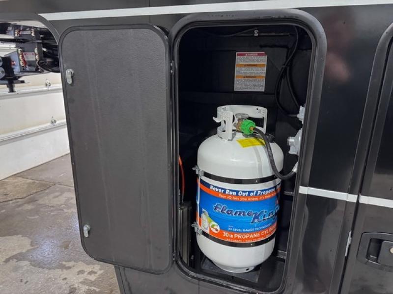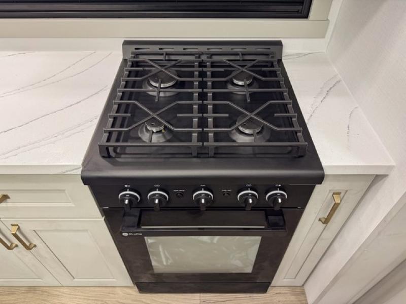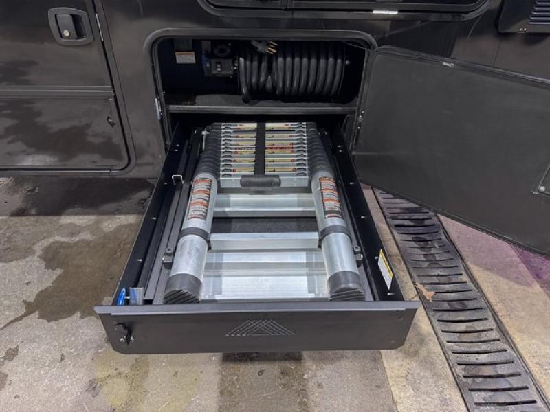 This toy hauler is perfect for those who like to have fun, while still needing an office space to telecommute! The front office includes an adjustable executive L-desk with a hutch and shelves, plus this room is right off of the private bedroom so you can easily get to work in the morning. Once you've made the king-size bed, you can grab your clothes from the dresser with a sliding top, then clean up in the full bathroom. Breakfast can be made on the 24" GE Profile oven with a four-burner range or in the GE Profile convection microwave. The kitchen island includes two stools where you can dine at, or you can sit at the convertible table/L-desk. An L-sofa in the living area sits across an entertainment center with a fireplace, and there is more seating space in the 11' garage. Here, you'll find a loft/storage with a twin bed, a max space half bath with fold-away walls and a sink, plus independent dual sofas with a Fold-N Stow Table and drop-down bed above.