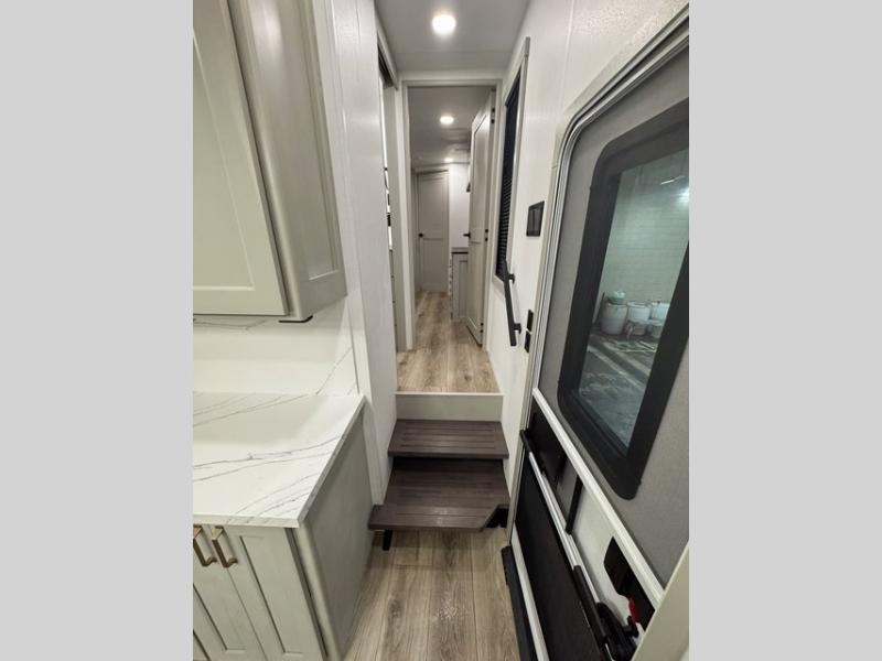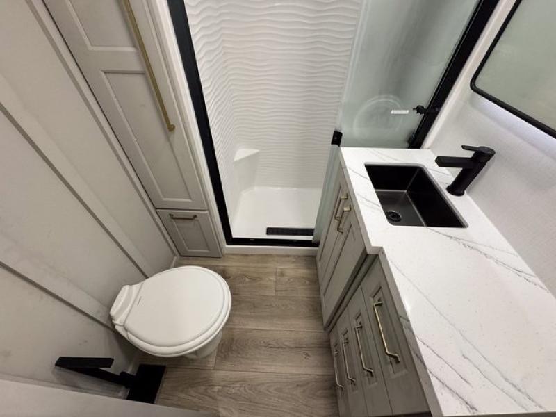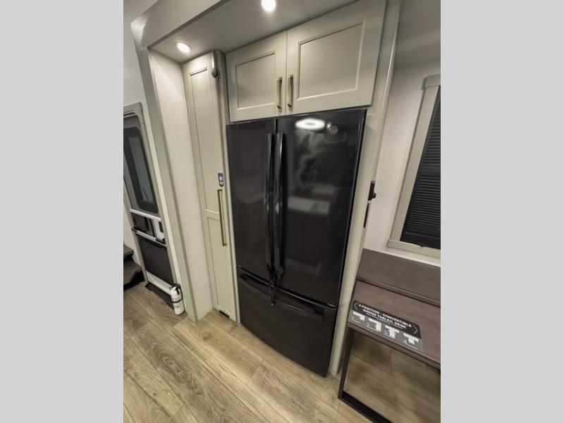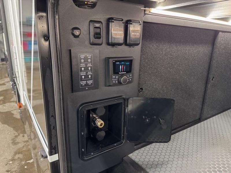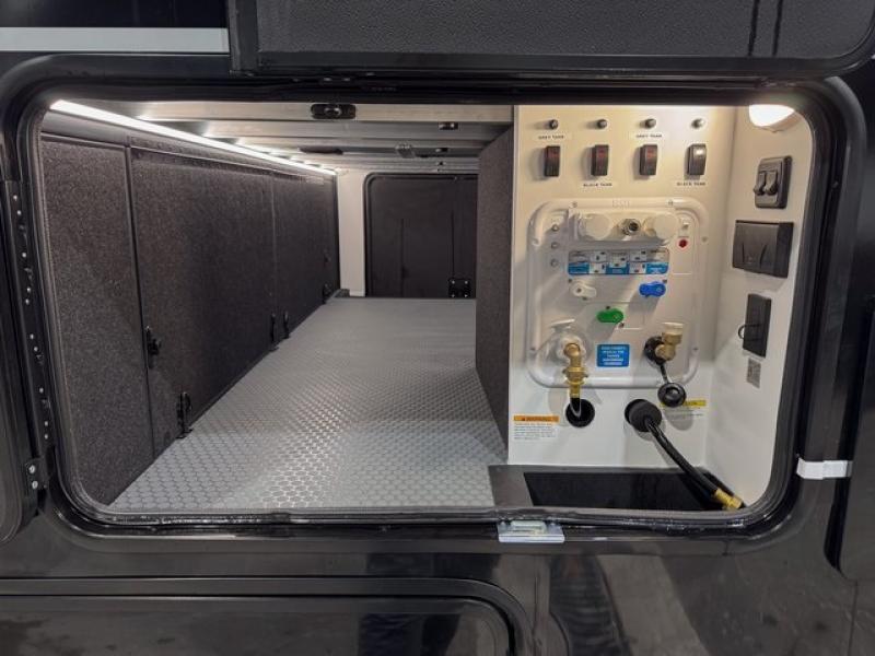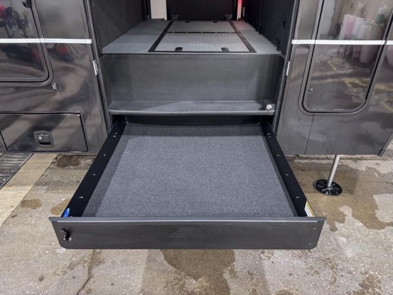 With any Model G toy hauler fifth wheel by Brinkley you will enjoy luxurious amenities, tons of storage space, and innovative features that have been developed and tested in the real world. Durable construction includes an industry leading PDI process, an industry best insulation package, and reinforced and walkable slide roofs. Some of the exterior features you'll find are a 3-way pass-through with a multi-functional flip-up bulkhead wall, under I-beam storage, a MAX-Vision reverse lighting system, and a low-maintenance roof to name a few. A Rockford Fosgate audio system comes standard, along with a Full app-based coach control system (iOS & Android) that lets you control your fifth wheel's functions right from your mobile device. You will find the solar system with a designated storage area to be ultra convenient, plus there is a FlexPower 5500 with a dual fuel inverter generator for all your power needs. Head inside to find a residential interior with Brinkley's CraftSense wood trim construction, floating entrance steps, integrated window screens and insulated blackout blinds, and residential solid surface countertops plus backsplash. You will also enjoy the neon shower lighting and recessed medicine cabinets in the bath, plus motion activated LED bed lights and dual bedside outlets in the bedroom. Choose a Model G toy hauler fifth wheel to experience all the luxury it has to offer!