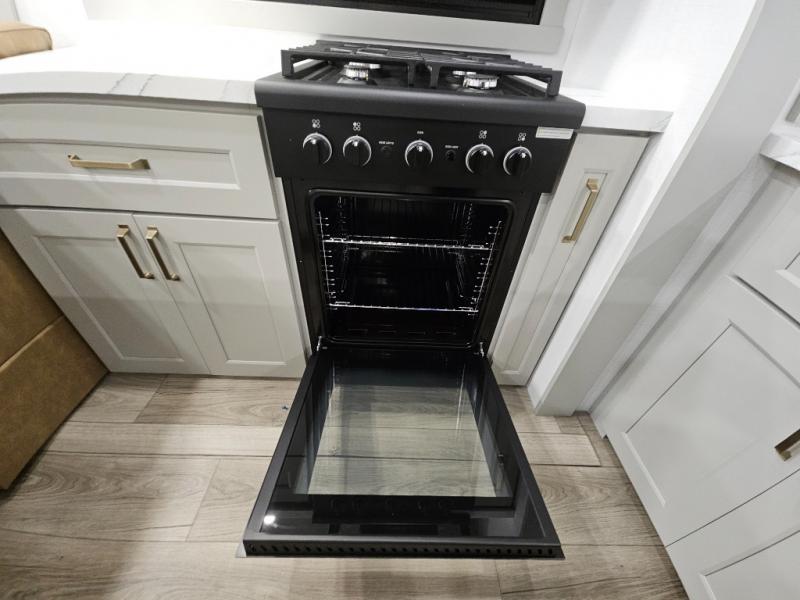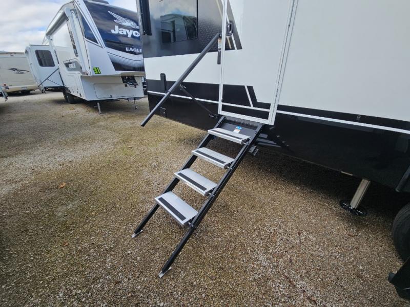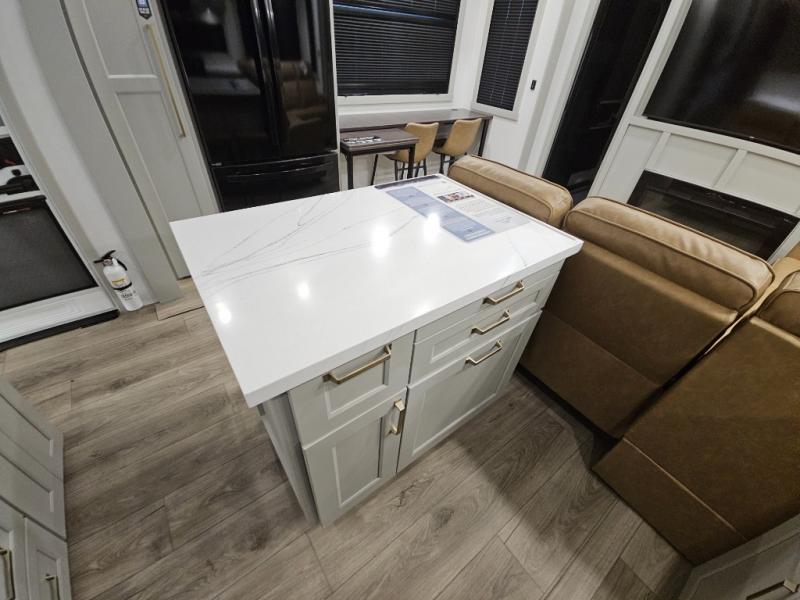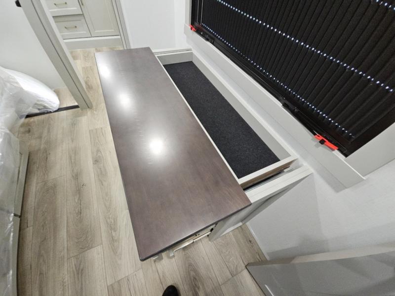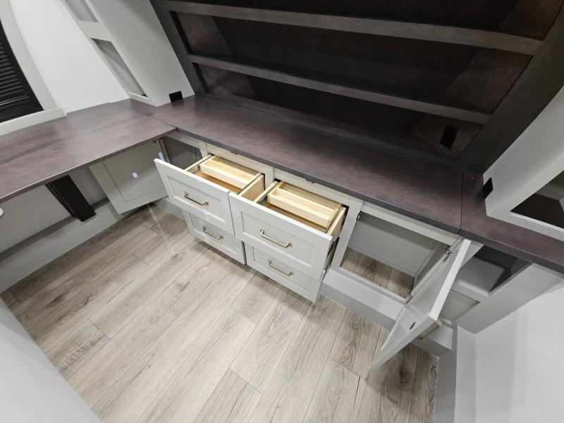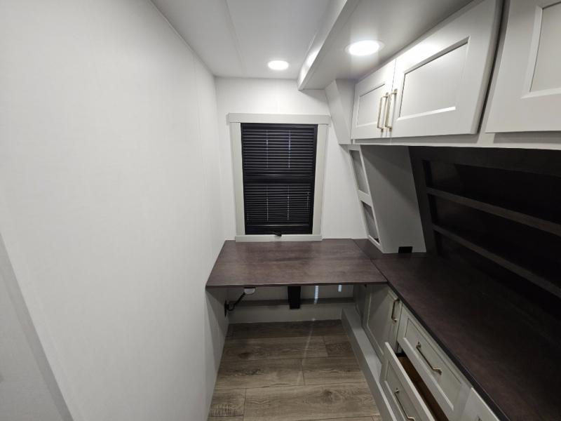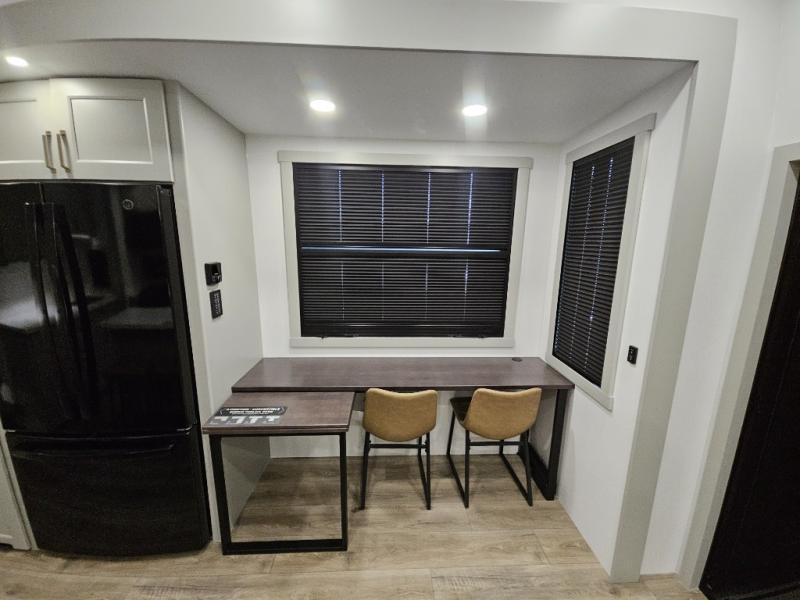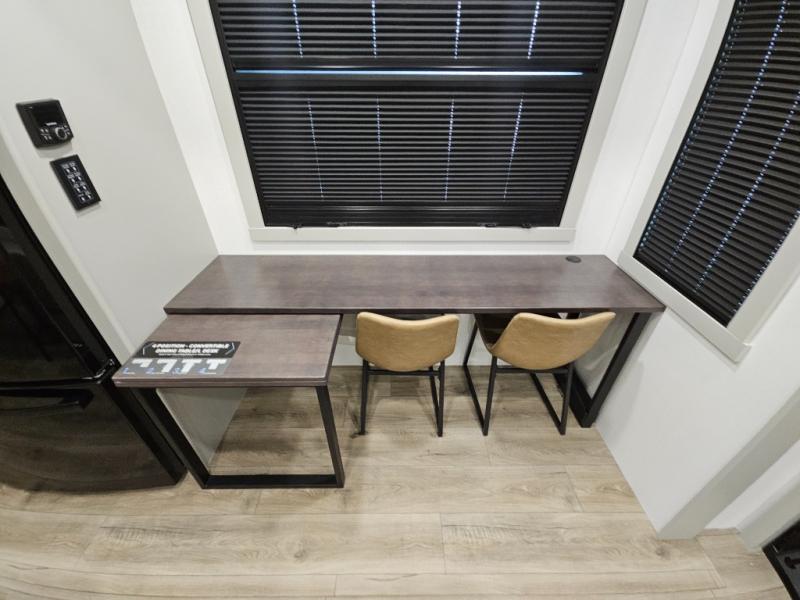 This toy hauler is perfect for those who like to have fun, while still needing an office space to telecommute! The front office includes an adjustable executive L-desk with a hutch and shelves, plus this room is right off of the private bedroom so you can easily get to work in the morning. Once you've made the king-size bed, you can grab your clothes from the dresser with a sliding top, then clean up in the full bathroom. Breakfast can be made on the 24" GE Profile oven with a four-burner range or in the GE Profile convection microwave. The kitchen island includes two stools where you can dine at, or you can sit at the convertible table/L-desk. An L-sofa in the living area sits across an entertainment center with a fireplace, and there is more seating space in the 11' garage. Here, you'll find a loft/storage with a twin bed, a max space half bath with fold-away walls and a sink, plus independent dual sofas with a Fold-N Stow Table and drop-down bed above.