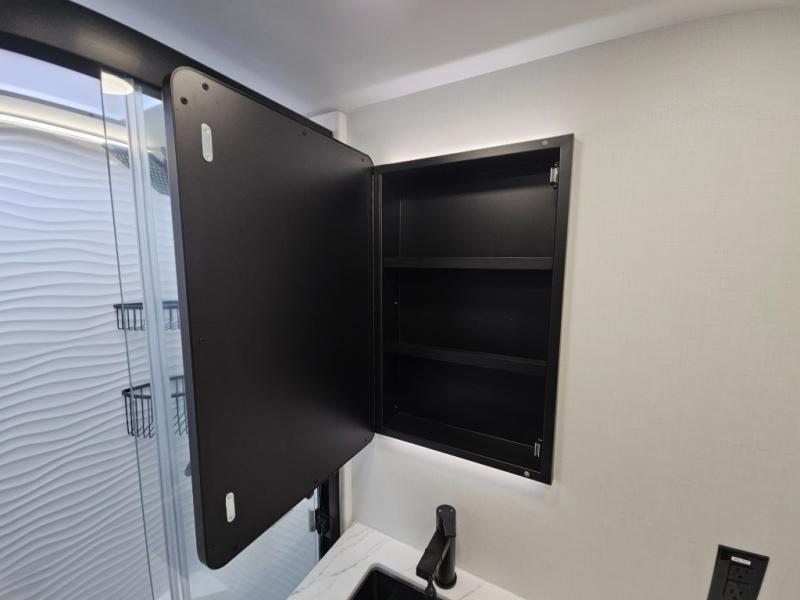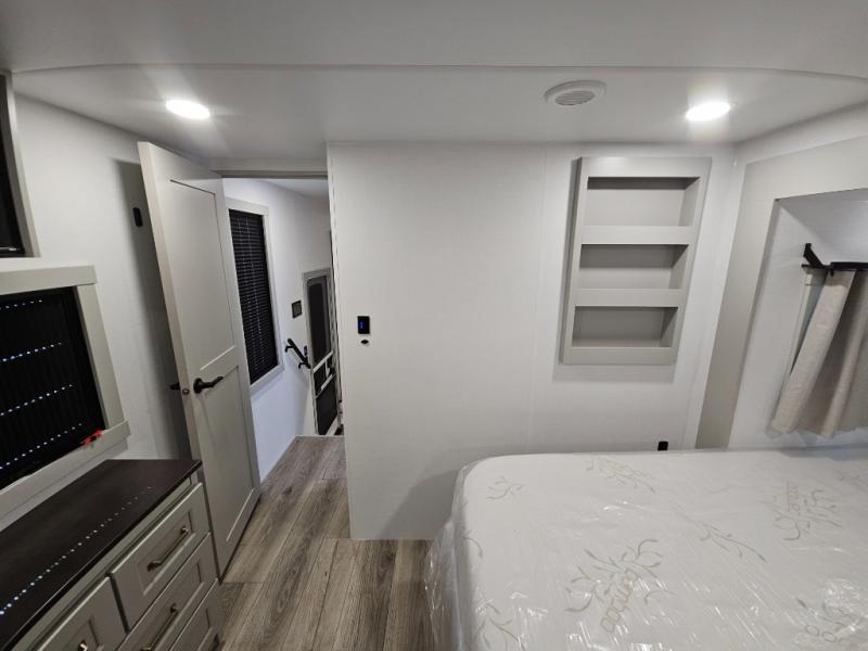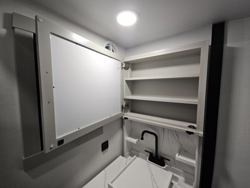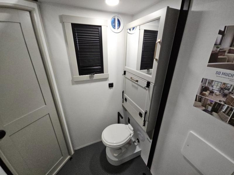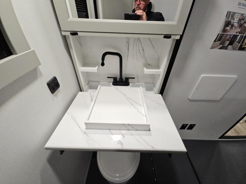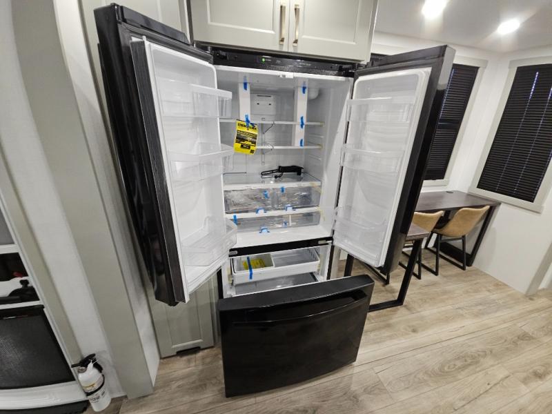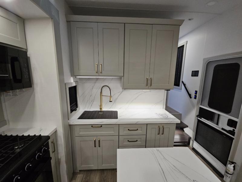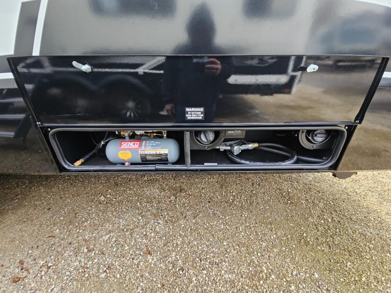 This toy hauler is perfect for those who like to have fun, while still needing an office space to telecommute! The front office includes an adjustable executive L-desk with a hutch and shelves, plus this room is right off of the private bedroom so you can easily get to work in the morning. Once you've made the king-size bed, you can grab your clothes from the dresser with a sliding top, then clean up in the full bathroom. Breakfast can be made on the 24" GE Profile oven with a four-burner range or in the GE Profile convection microwave. The kitchen island includes two stools where you can dine at, or you can sit at the convertible table/L-desk. An L-sofa in the living area sits across an entertainment center with a fireplace, and there is more seating space in the 11' garage. Here, you'll find a loft/storage with a twin bed, a max space half bath with fold-away walls and a sink, plus independent dual sofas with a Fold-N Stow Table and drop-down bed above.