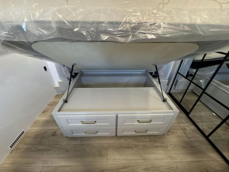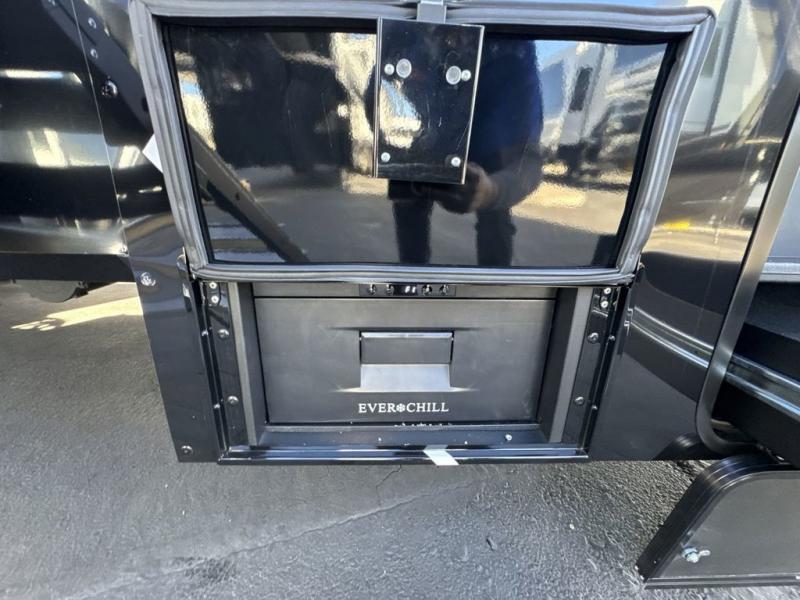 Comfort and convenience are found throughout in this toy hauler! Once you've unloaded the toys from the 10' 6" garage, you can relax on the independent dual sofas with a Fold-N Stow table. There is also a drop-down bed, dovetail storage, a loft/storage with a twin bed, plus a full bath. The second full bath is up front towards the private bedroom. Here, you'll find a king bed slide out, a walk-in closet with cordless vacuum prep, underbed storage drawers and motion lights, plus a dresser with hidden storage. Your crew will love to spend time together in the combined kitchen and living room that includes a walk-around kitchen island, dual 2x recliners, and a convertible dining table/L-desk. Outside, there is a retractable extension cord, a slide tray storge, a drawer fridge/freezer, plus four awnings to keep your outdoor space well shaded.