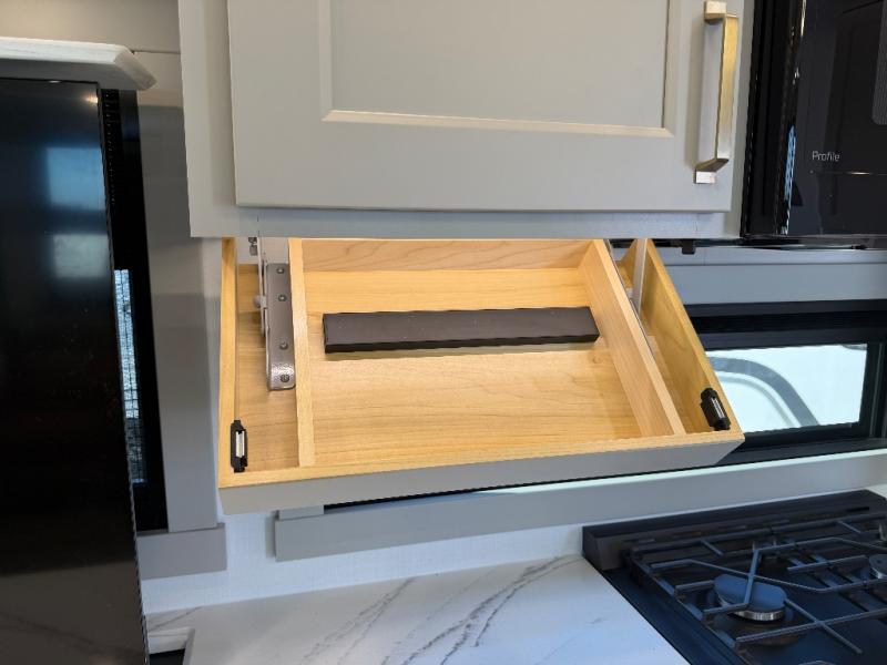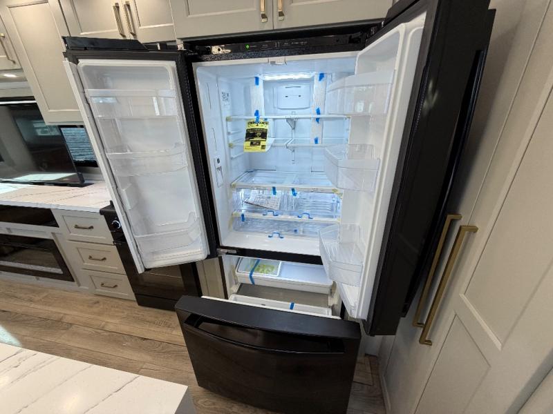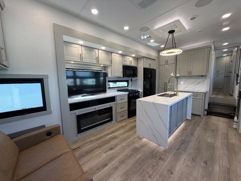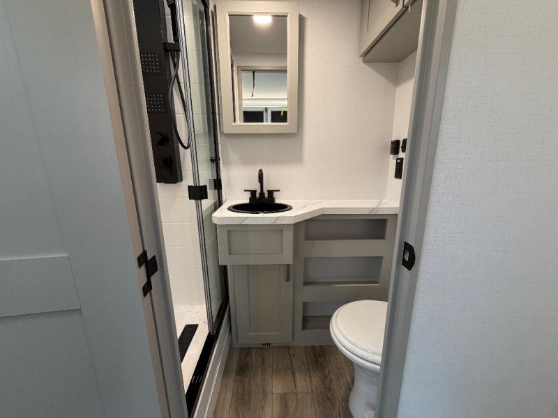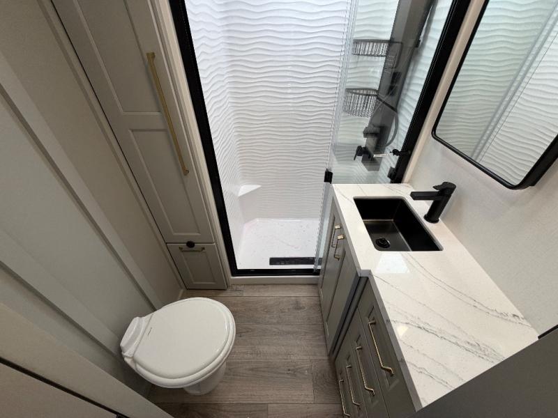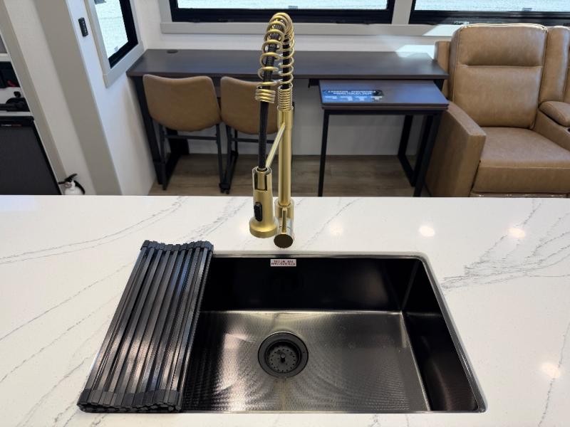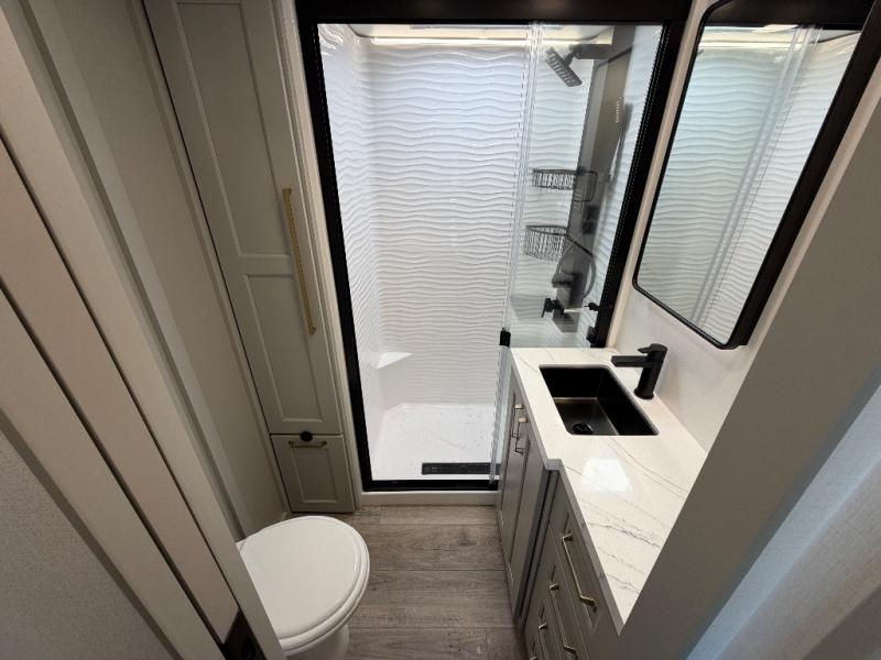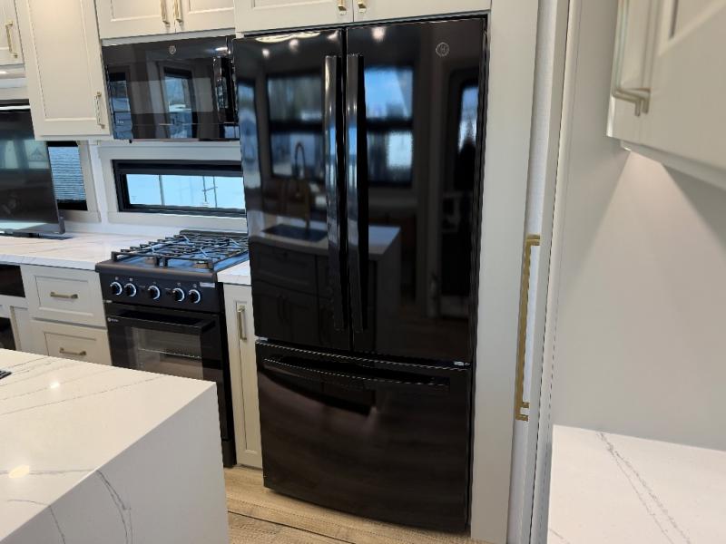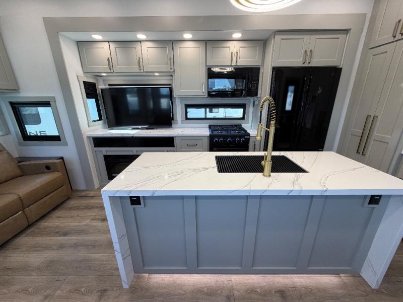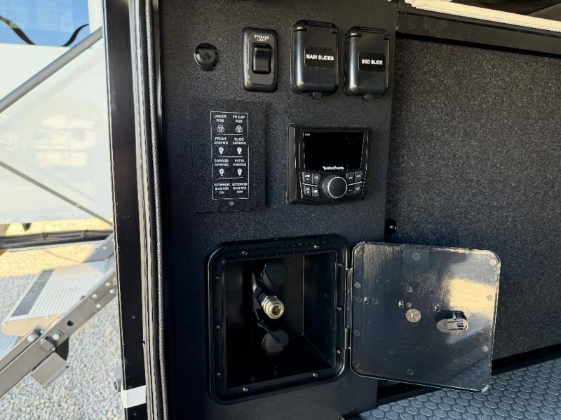 With any Model G toy hauler fifth wheel by Brinkley you will enjoy luxurious amenities, tons of storage space, and innovative features that have been developed and tested in the real world. Durable construction includes an industry leading PDI process, an industry best insulation package, and reinforced and walkable slide roofs. Some of the exterior features you'll find are a 3-way pass-through with a multi-functional flip-up bulkhead wall, under I-beam storage, a MAX-Vision reverse lighting system, and a low-maintenance roof to name a few. A Rockford Fosgate audio system comes standard, along with a Full app-based coach control system (iOS & Android) that lets you control your fifth wheel's functions right from your mobile device. You will find the solar system with a designated storage area to be ultra convenient, plus there is a FlexPower 5500 with a dual fuel inverter generator for all your power needs. Head inside to find a residential interior with Brinkley's CraftSense wood trim construction, floating entrance steps, integrated window screens and insulated blackout blinds, and residential solid surface countertops plus backsplash. You will also enjoy the neon shower lighting and recessed medicine cabinets in the bath, plus motion activated LED bed lights and dual bedside outlets in the bedroom. Choose a Model G toy hauler fifth wheel to experience all the luxury it has to offer!