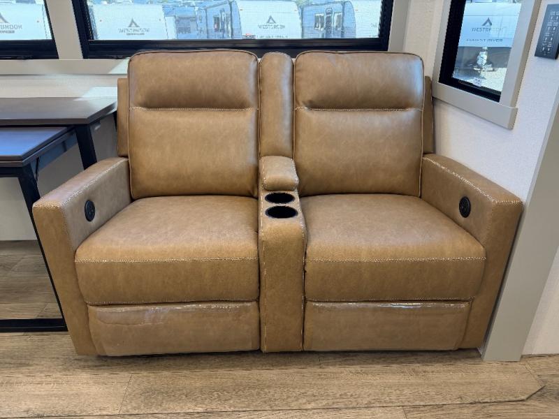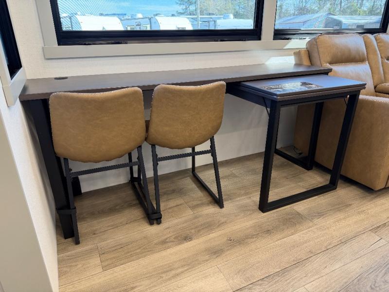 Comfort and convenience are found throughout in this toy hauler! Once you've unloaded the toys from the 10' 6" garage, you can relax on the independent dual sofas with a Fold-N Stow table. There is also a drop-down bed, dovetail storage, a loft/storage with a twin bed, plus a full bath. The second full bath is up front towards the private bedroom. Here, you'll find a king bed slide out, a walk-in closet with cordless vacuum prep, underbed storage drawers and motion lights, plus a dresser with hidden storage. Your crew will love to spend time together in the combined kitchen and living room that includes a walk-around kitchen island, dual 2x recliners, and a convertible dining table/L-desk. Outside, there is a retractable extension cord, a slide tray storge, a drawer fridge/freezer, plus four awnings to keep your outdoor space well shaded.