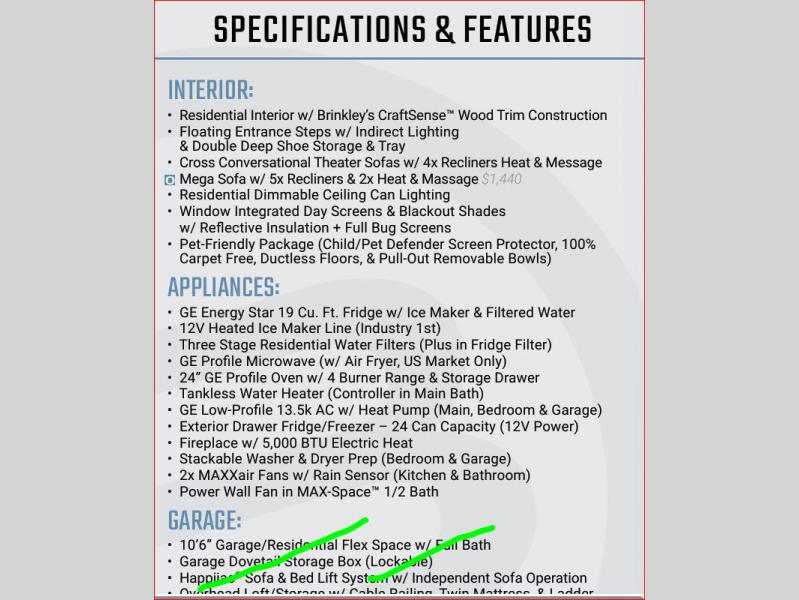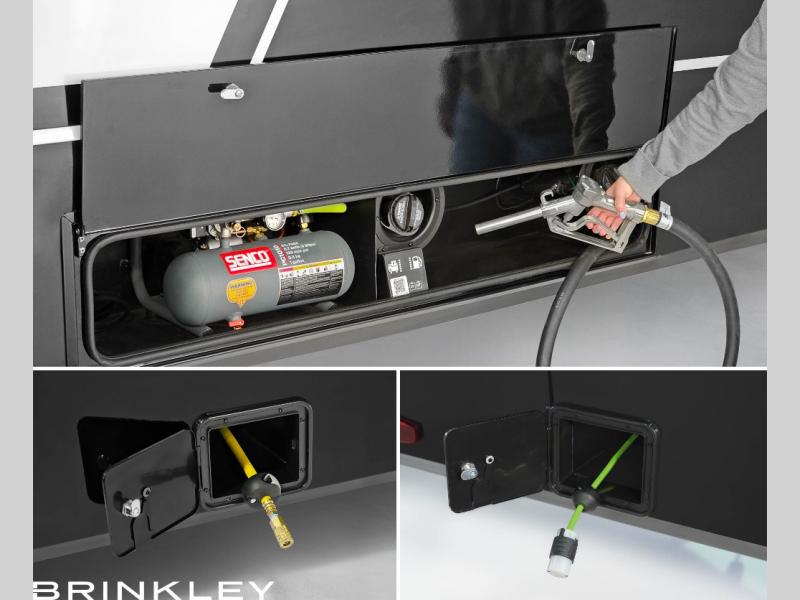With any Model G toy hauler fifth wheel by Brinkley you will enjoy luxurious amenities, tons of storage space, and innovative features that have been developed and tested in the real world. Durable construction includes an industry leading PDI process, an industry best insulation package, and reinforced and walkable slide roofs. Some of the exterior features you'll find are a 3-way pass-through with a multi-functional flip-up bulkhead wall, under I-beam storage, a MAX-Vision reverse lighting system, and a low-maintenance roof to name a few. A Rockford Fosgate audio system comes standard, along with a OneControl app system that lets you control your fifth wheel's functions right from your mobile device. You will find the solar system with a designated storage area to be ultra convenient, plus there is a FlexPower 5500 with a dual fuel inverter generator for all your power needs. Head inside to find a residential interior with Brinkley's CraftSense wood trim construction, floating entrance steps, integrated window screens and insulated blackout blinds, and residential solid surface countertops plus backsplash. You will also enjoy the neon shower lighting and recessed medicine cabinets in the bath, plus motion activated LED bed lights and dual bedside outlets in the bedroom. Choose a Model G toy hauler fifth wheel to experience all the luxury it has to offer!