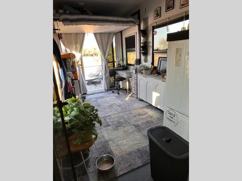 The front bedroom is a serene retreat, featuring a plush king bed, spacious walk-in closet, 32” smart TV, sliding dresser top, and hidden storage for better organization.The bathroom is a haven of convenience, boasting a full bathroom with pull-out linen and trash bin, and a spacious 30 x 42 shower. Perfect for freshening up after a long day of adventure! The kitchen has a pantry featuring adjustable shelving, a hutch, 19 cu. refrigerator, microwave, four-burner cooktop, kitchen island, and convertible dining table/L-desk. Plus, pet bowls for your furry friends! Gather with family and friends in the living room, which features a dual sofa with two recliners, each with heat and massage functions, a televator, and a cozy fireplace. It's the perfect spot to relax and unwind! The garage has a half bathroom, two sofas, and a 43” smart TV, ideal for game days, movie nights, or just relaxing with friends. Outside, enjoy the convenience of a fuel station, three-way pass-thru storage, and LP quick connect. Whether you're an adventure-seeker, or just love to travel in style, this toy hauler has everything you need and more!