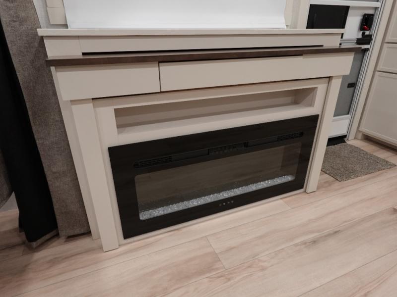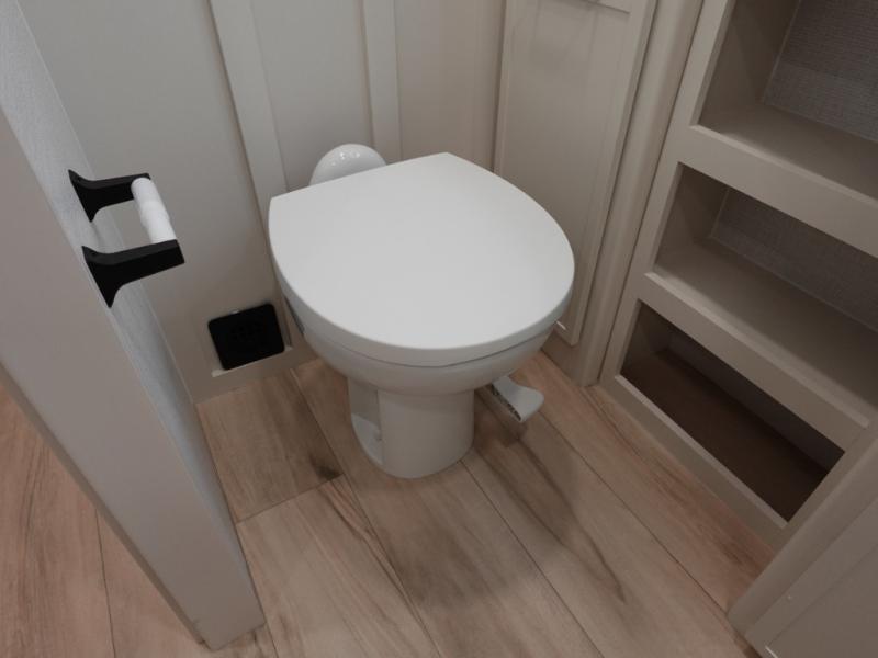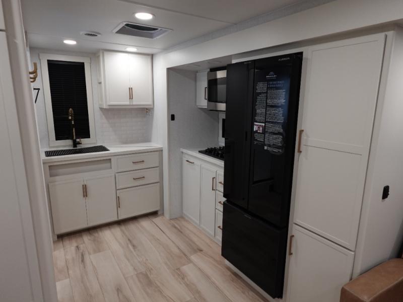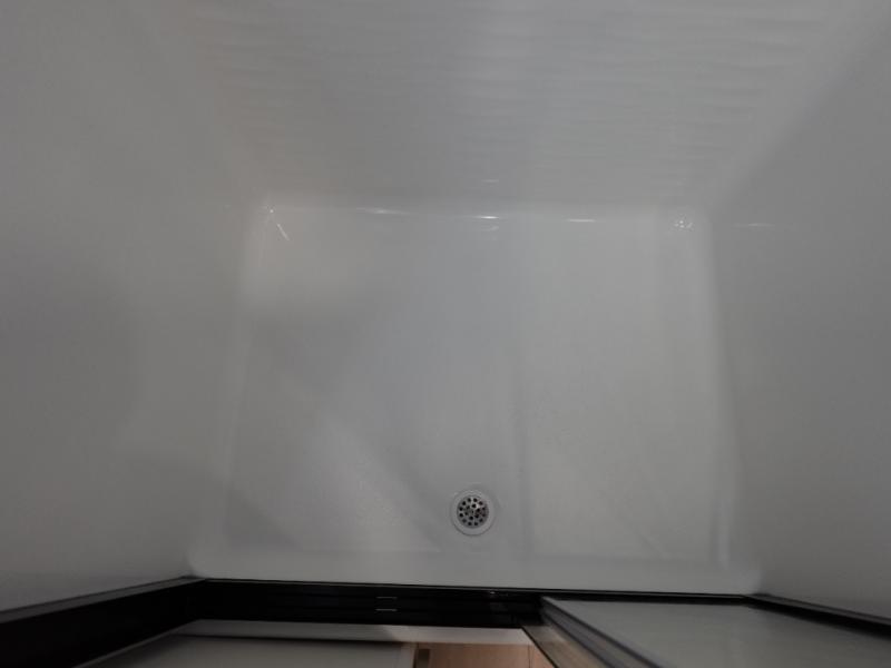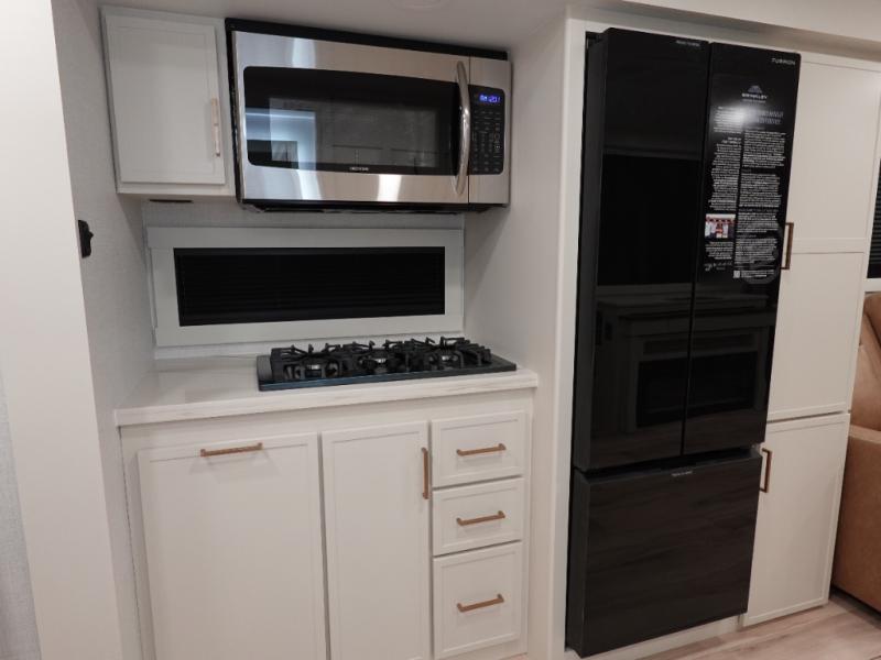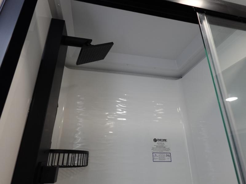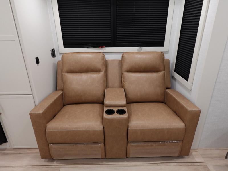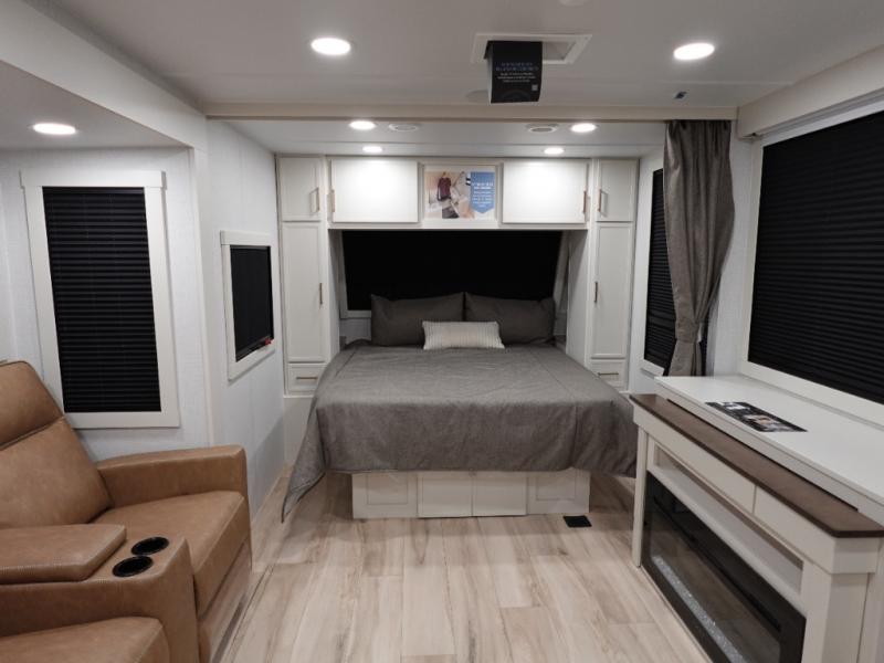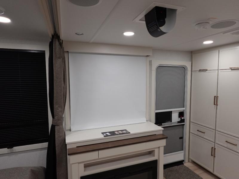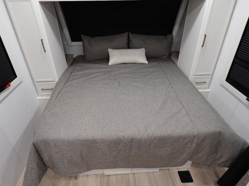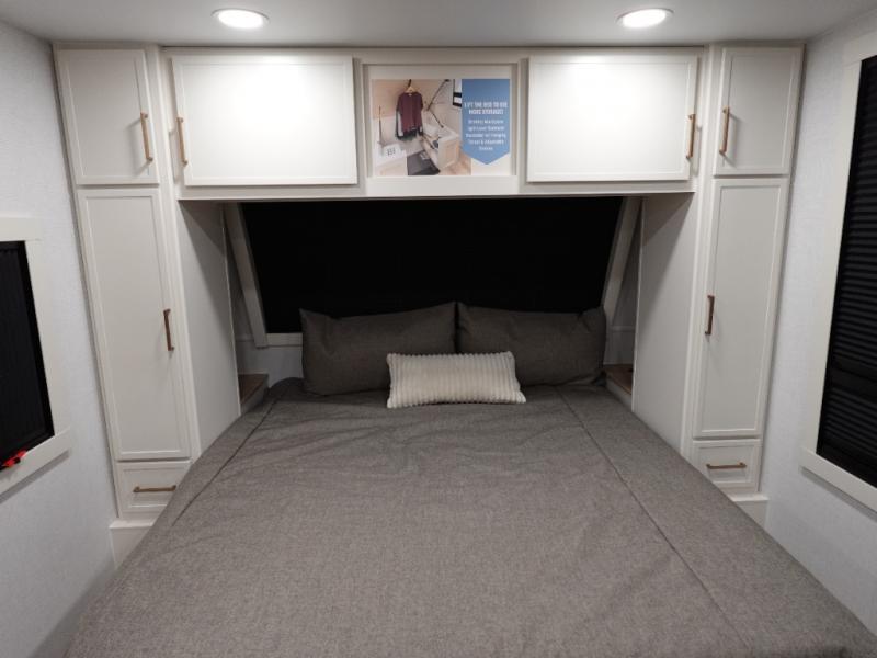 You'll love the amount of space you have in this travel trailer thanks to the large slide out in the main living area. There is comfy theater seating here, along with the kitchen appliances plus a pantry with drawers and an outlet. And a tri-fold sofa option can be chosen in place of theater seating if you're needing sleeping space for guests. You can dine at the pull-out dining table with a drawer, which is right in front of the pull-down interior/exterior screen. A full bath with a 36" x 30" shower will let you freshen up each day, and the king bed in the front bedroom includes a room divider in front for added privacy!