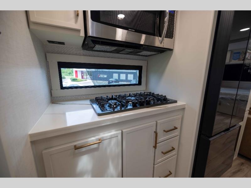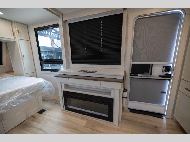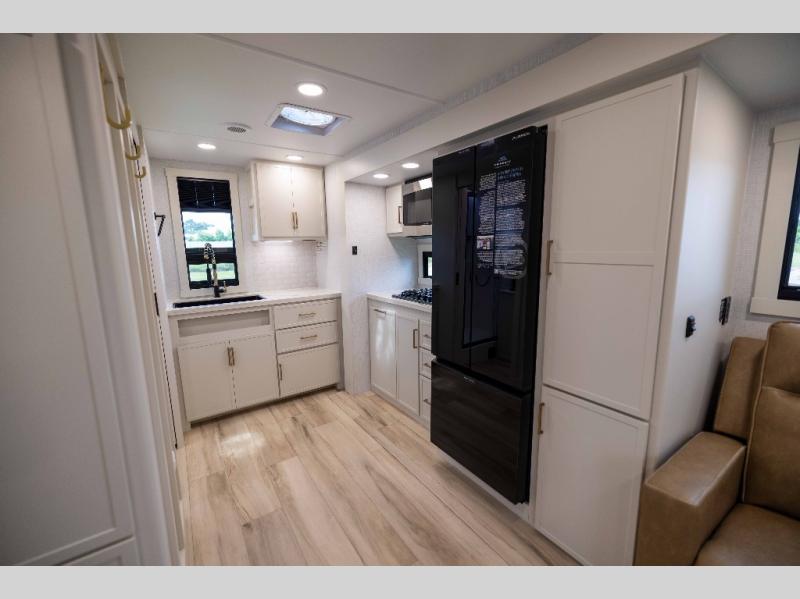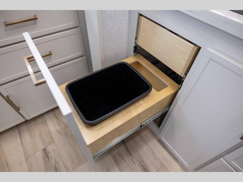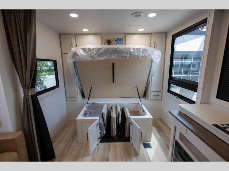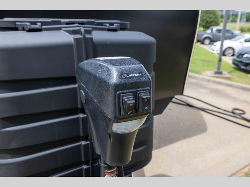 You'll love the amount of space you have in this travel trailer thanks to the large slide out in the main living area. There is comfy theater seating here, along with the kitchen appliances plus a pantry with drawers and an outlet. And a tri-fold sofa option can be chosen in place of theater seating if you're needing sleeping space for guests. You can dine at the pull-out dining table with a drawer, which is right in front of the pull-down interior/exterior screen. A full bath with a 36" x 30" shower will let you freshen up each day, and the king bed in the front bedroom includes a room divider in front for added privacy!