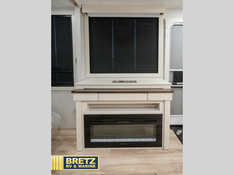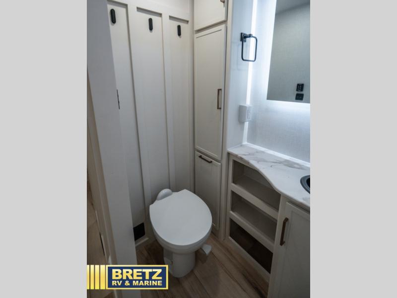 You'll love the amount of space you have in this travel trailer thanks to the large slide out in the main living area. There is comfy theater seating here, along with the kitchen appliances plus a pantry with drawers and an outlet. And a tri-fold sofa option can be chosen in place of theater seating if you're needing sleeping space for guests. You can dine at the pull-out dining table with a drawer, which is right in front of the pull-down interior/exterior screen. A full bath with a 36" x 30" shower will let you freshen up each day, and the king bed in the front bedroom includes a room divider in front for added privacy!