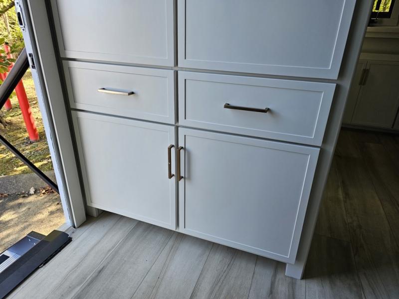 You'll love the amount of space you have in this travel trailer thanks to the large slide out in the main living area. There is comfy theater seating here, along with the kitchen appliances plus a pantry with drawers and an outlet. And a tri-fold sofa option can be chosen in place of theater seating if you're needing sleeping space for guests. You can dine at the pull-out dining table with a drawer, which is right in front of the pull-down interior/exterior screen. A full bath with a 36" x 30" shower will let you freshen up each day, and the king bed in the front bedroom includes a room divider in front for added privacy!