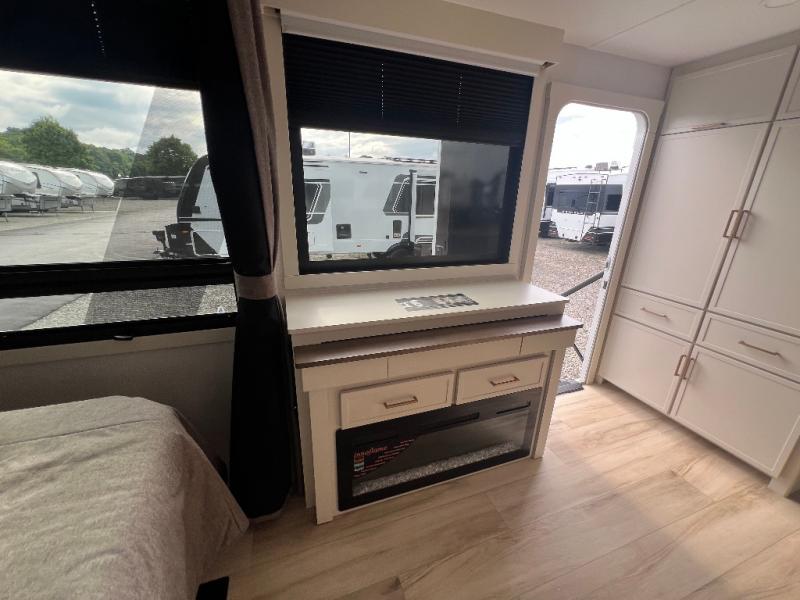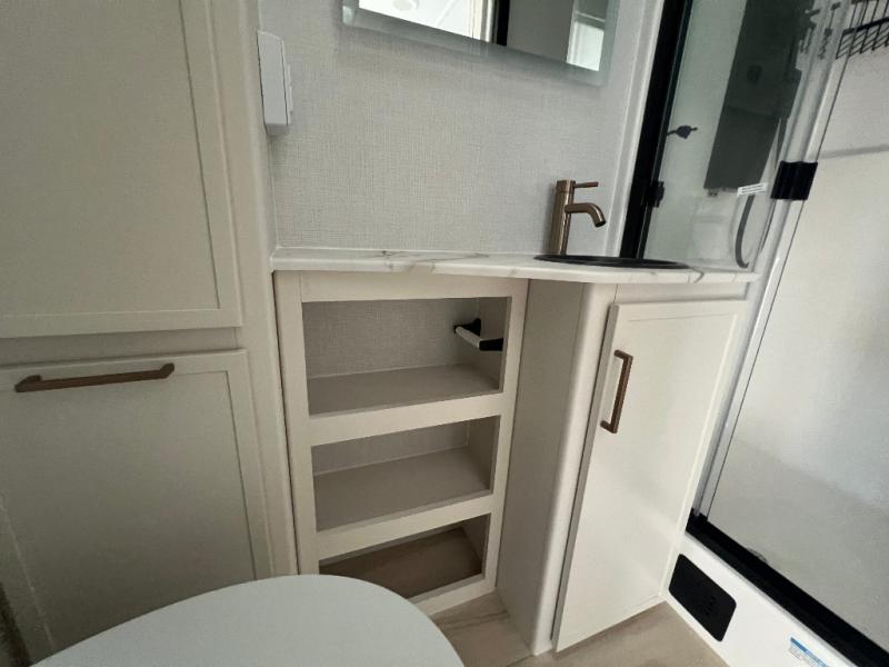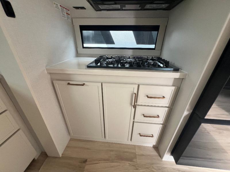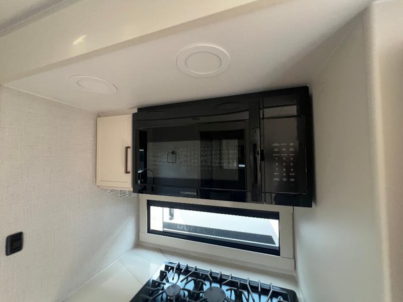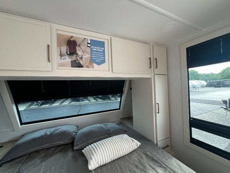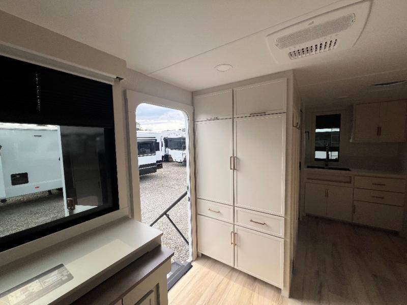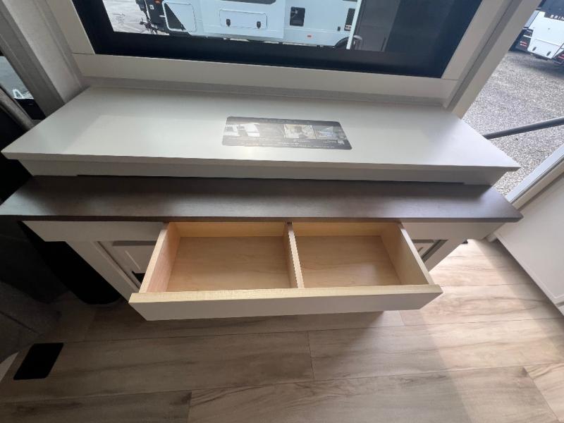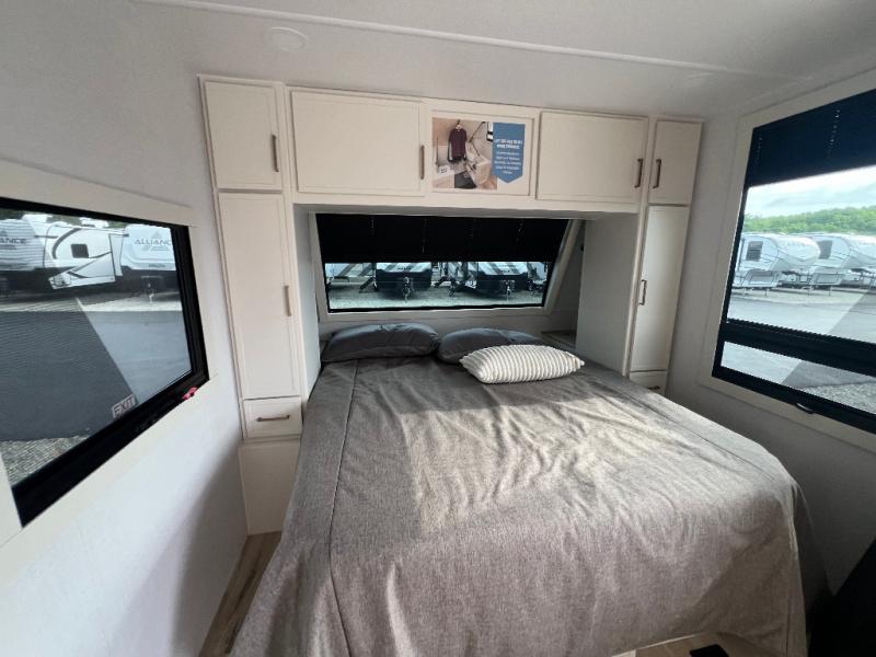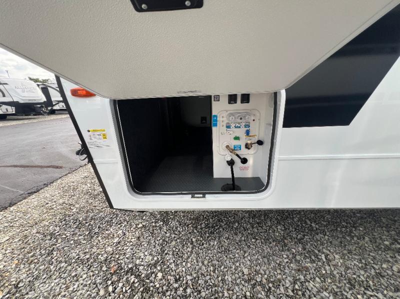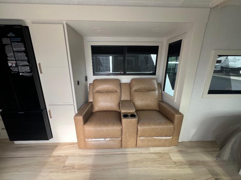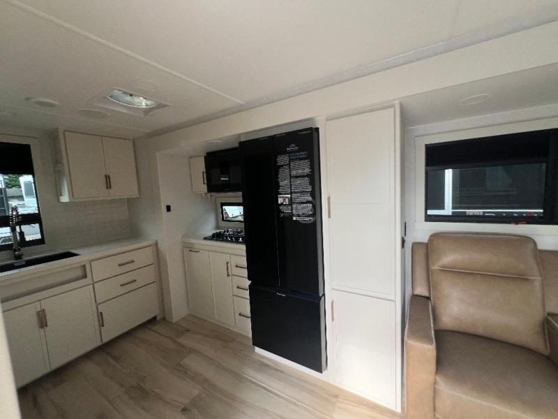 You'll love the amount of space you have in this travel trailer thanks to the large slide out in the main living area. There is comfy theater seating here, along with the kitchen appliances plus a pantry with drawers and an outlet. And a tri-fold sofa option can be chosen in place of theater seating if you're needing sleeping space for guests. You can dine at the pull-out dining table with a drawer, which is right in front of the pull-down interior/exterior screen. A full bath with a 36" x 30" shower will let you freshen up each day, and the king bed in the front bedroom includes a room divider in front for added privacy!
