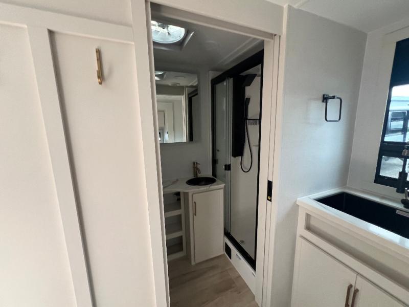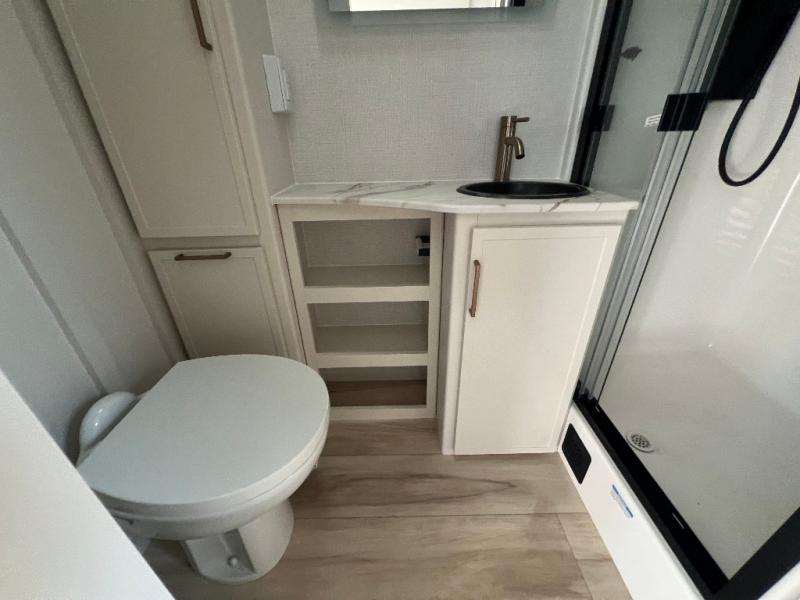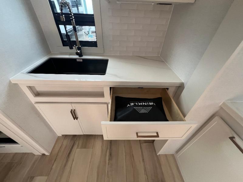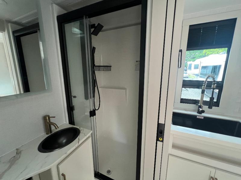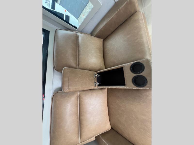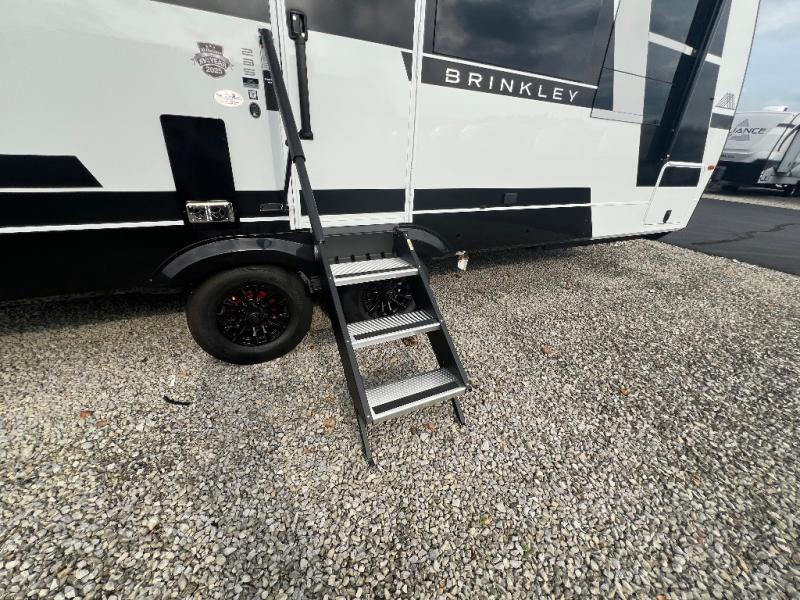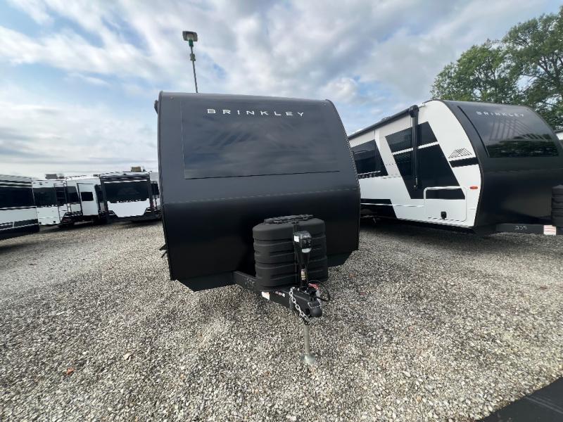 The lightweight Model I travel trailer by Brinkley is the perfect choice for those looking for an easy tow and at-home comforts! There is a drop-frame chassis, high-performance Road Armor suspension equalizer system, and Demco EZ Latch trailer coupler that automatically latches when dropped onto a hitch ball without the need of a safety pin. Additional exterior features include square Euro frameless windows, automotive-grade paint, full-width LED strip lighting in the pass-thru, and a pet & property security campside tie-down to keep your gear and furry friends safe. Inside, you'll be wowed by Brinkley's CraftSense wood trim construction, residential solid surface kitchen countertops, dimmable bedroom lights, and marine-grade neon LED shower lighting to name a few stand-out features!