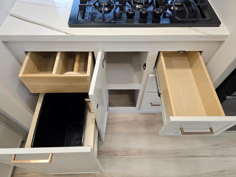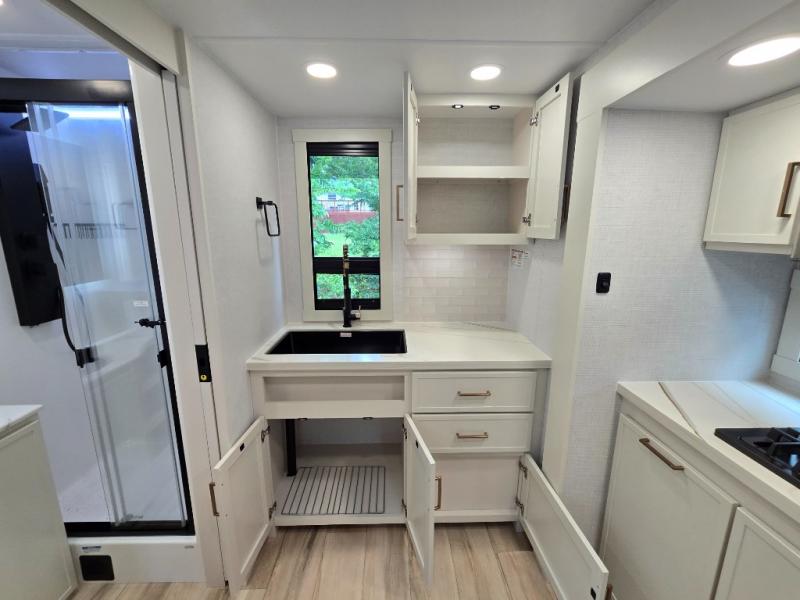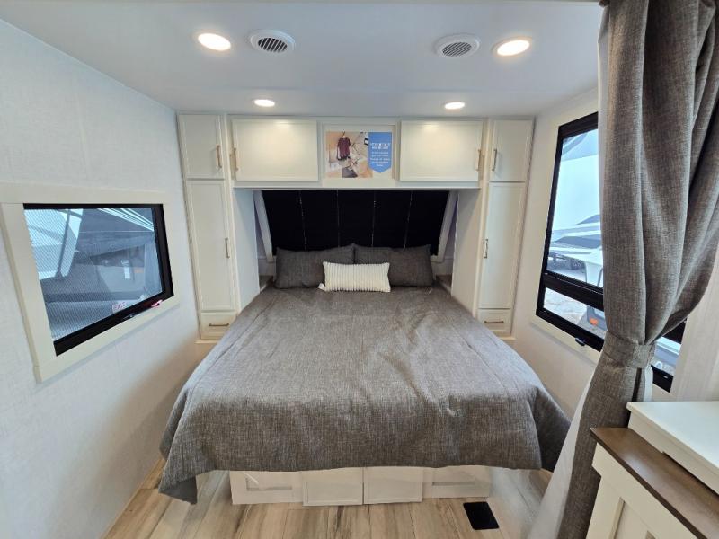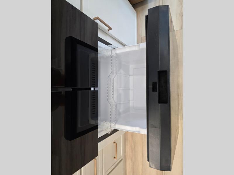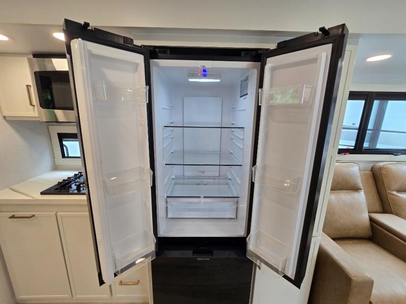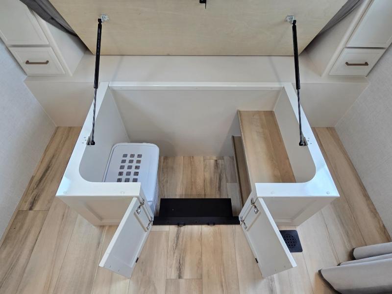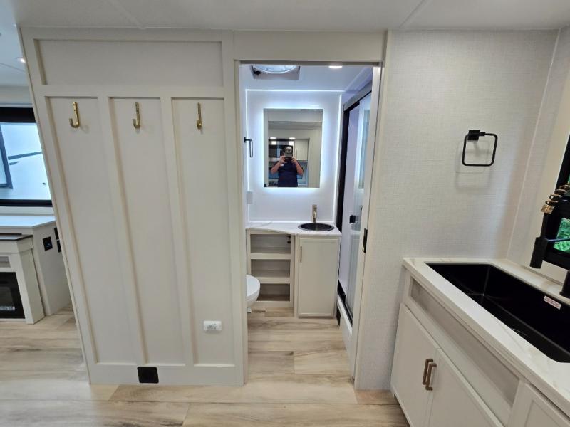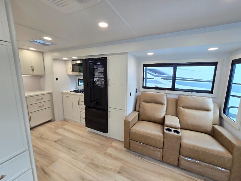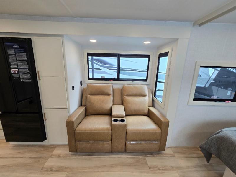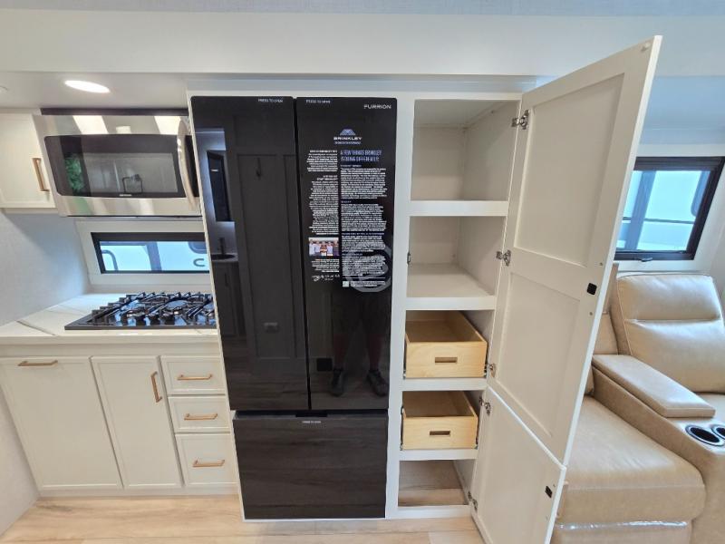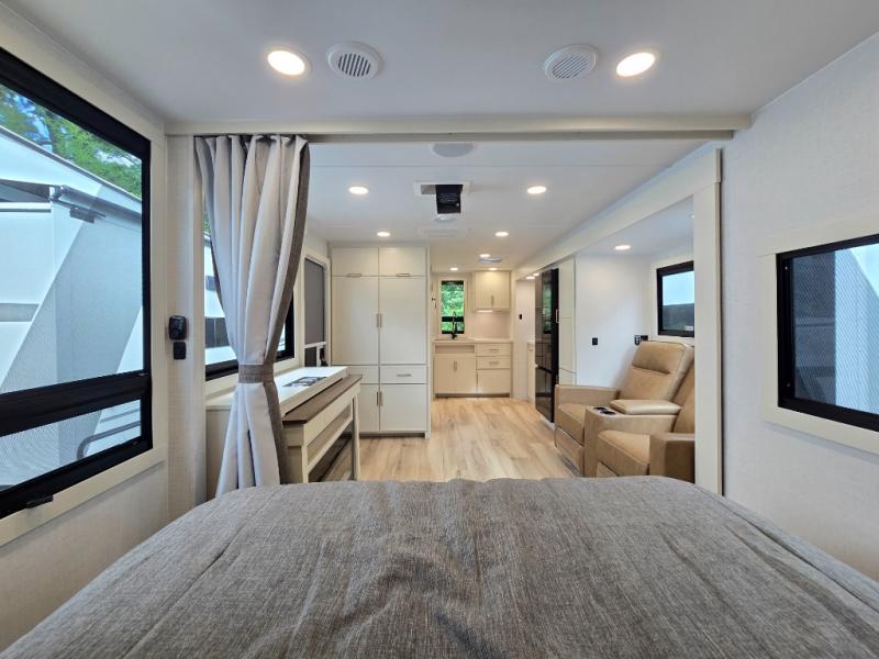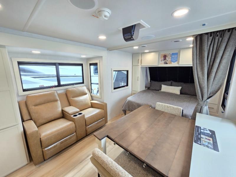 You'll love the amount of space you have in this travel trailer thanks to the large slide out in the main living area. There is comfy theater seating here, along with the kitchen appliances plus a pantry with drawers and an outlet. And a tri-fold sofa option can be chosen in place of theater seating if you're needing sleeping space for guests. You can dine at the pull-out dining table with a drawer, which is right in front of the pull-down interior/exterior screen. A full bath with a 36" x 30" shower will let you freshen up each day, and the king bed in the front bedroom includes a room divider in front for added privacy!
