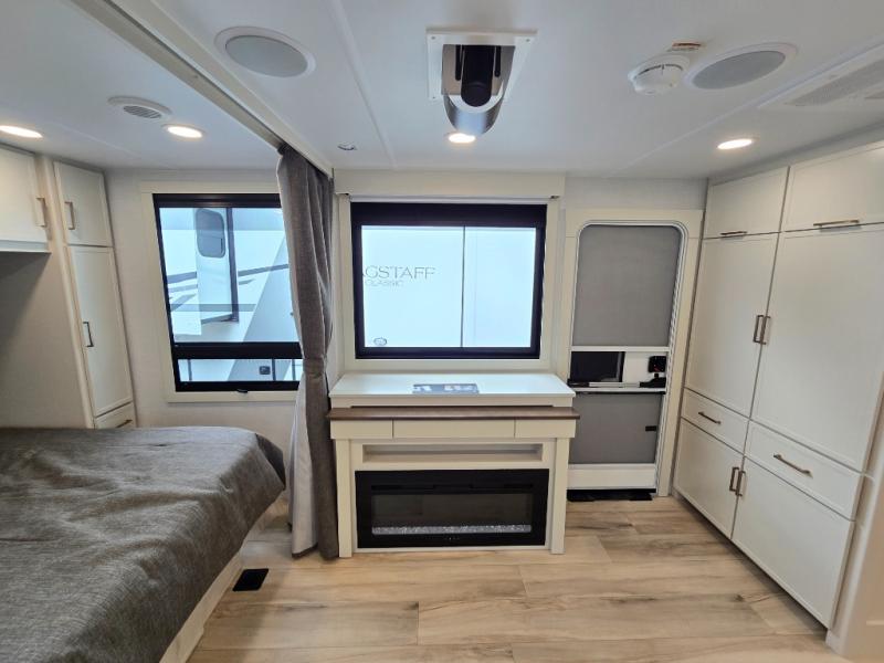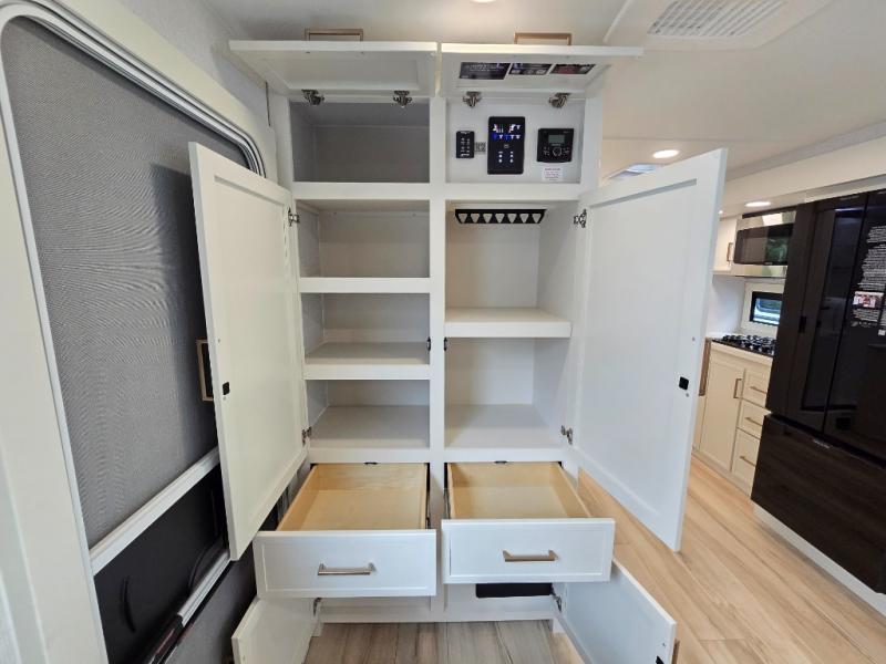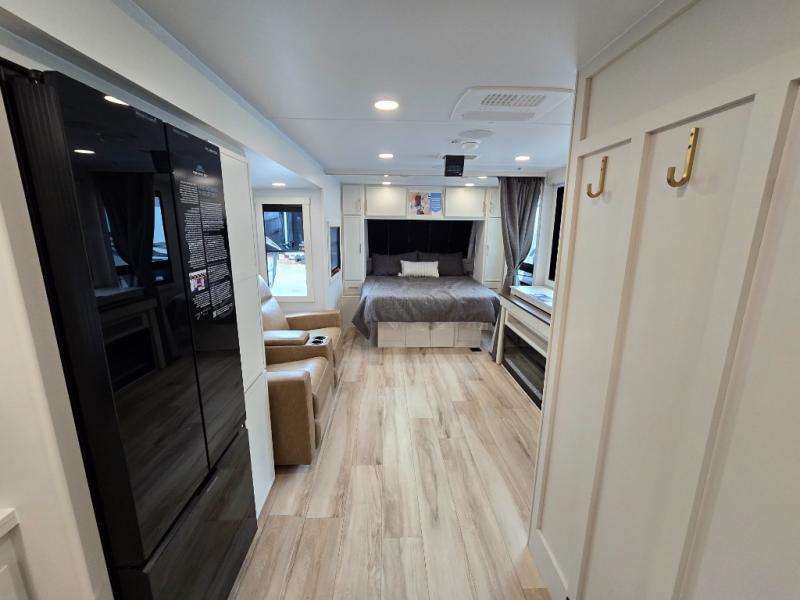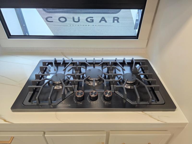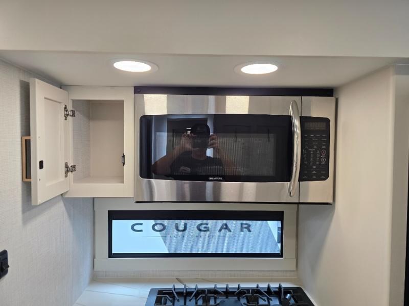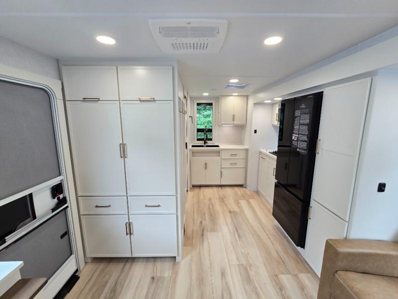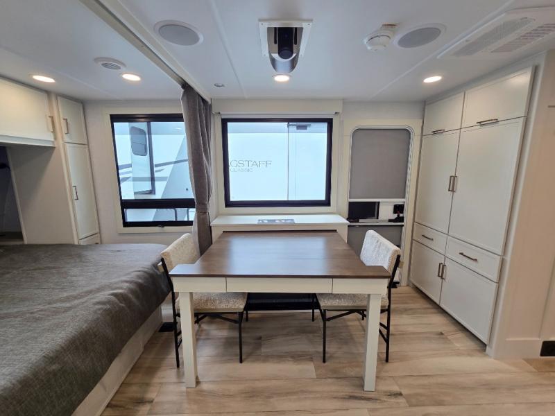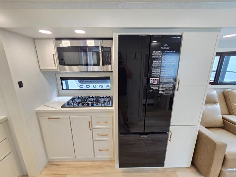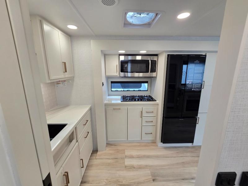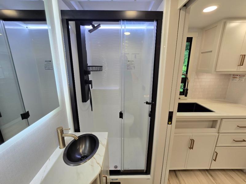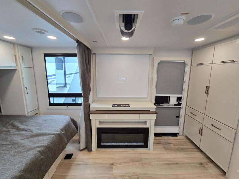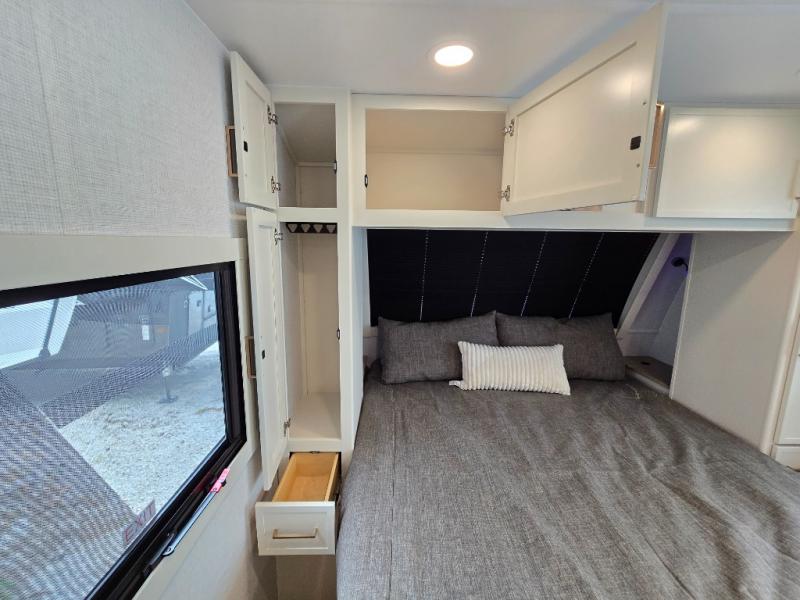 You'll love the amount of space you have in this travel trailer thanks to the large slide out in the main living area. There is comfy theater seating here, along with the kitchen appliances plus a pantry with drawers and an outlet. And a tri-fold sofa option can be chosen in place of theater seating if you're needing sleeping space for guests. You can dine at the pull-out dining table with a drawer, which is right in front of the pull-down interior/exterior screen. A full bath with a 36" x 30" shower will let you freshen up each day, and the king bed in the front bedroom includes a room divider in front for added privacy!
