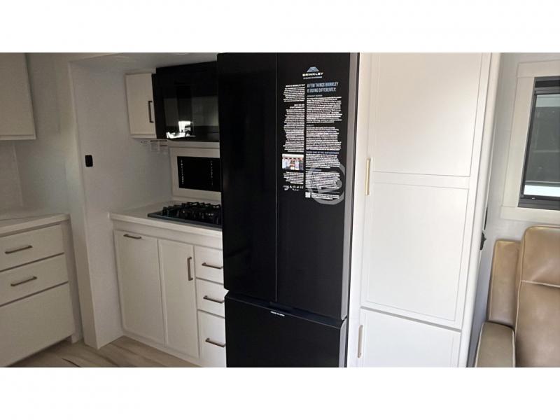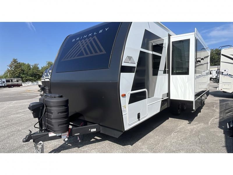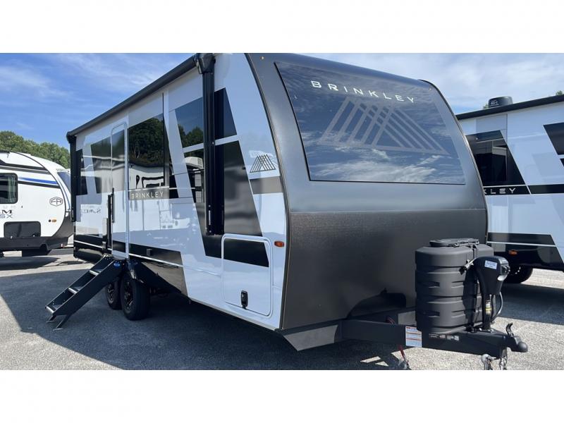 The lightweight Model I travel trailer by Brinkley is the perfect choice for those looking for an easy tow and at-home comforts! There is a drop-frame chassis, high-performance Road Armor suspension equalizer system, and Demco EZ Latch trailer coupler that automatically latches when dropped onto a hitch ball without the need of a safety pin. Additional exterior features include square Euro frameless windows, automotive-grade paint, full-width LED strip lighting in the pass-thru, and a pet & property security campside tie-down to keep your gear and furry friends safe. Inside, you'll be wowed by Brinkley's CraftSense wood trim construction, residential solid surface kitchen countertops, dimmable bedroom lights, and marine-grade neon LED shower lighting to name a few stand-out features!