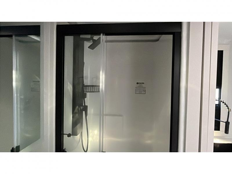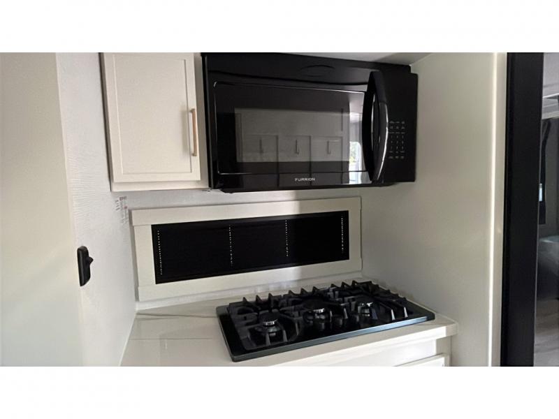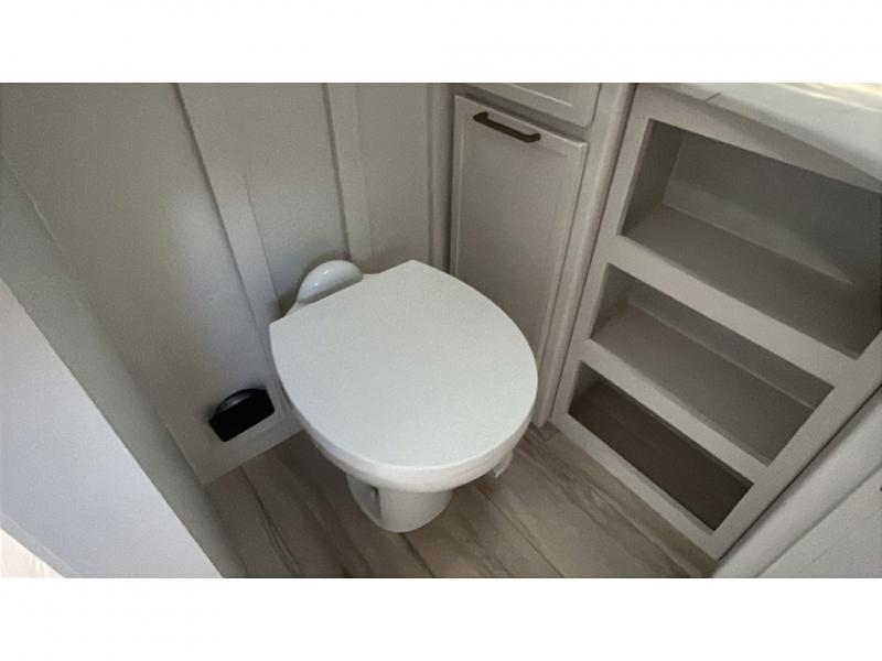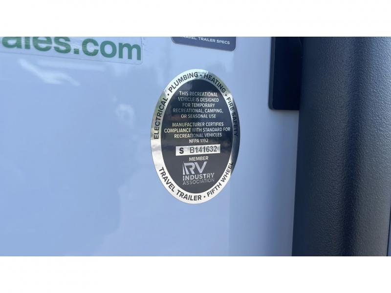 You'll love the amount of space you have in this travel trailer thanks to the large slide out in the main living area. There is comfy theater seating here, along with the kitchen appliances plus a pantry with drawers and an outlet. And a tri-fold sofa option can be chosen in place of theater seating if you're needing sleeping space for guests. You can dine at the pull-out dining table with a drawer, which is right in front of the pull-down interior/exterior screen. A full bath with a 36" x 30" shower will let you freshen up each day, and the king bed in the front bedroom includes a room divider in front for added privacy!