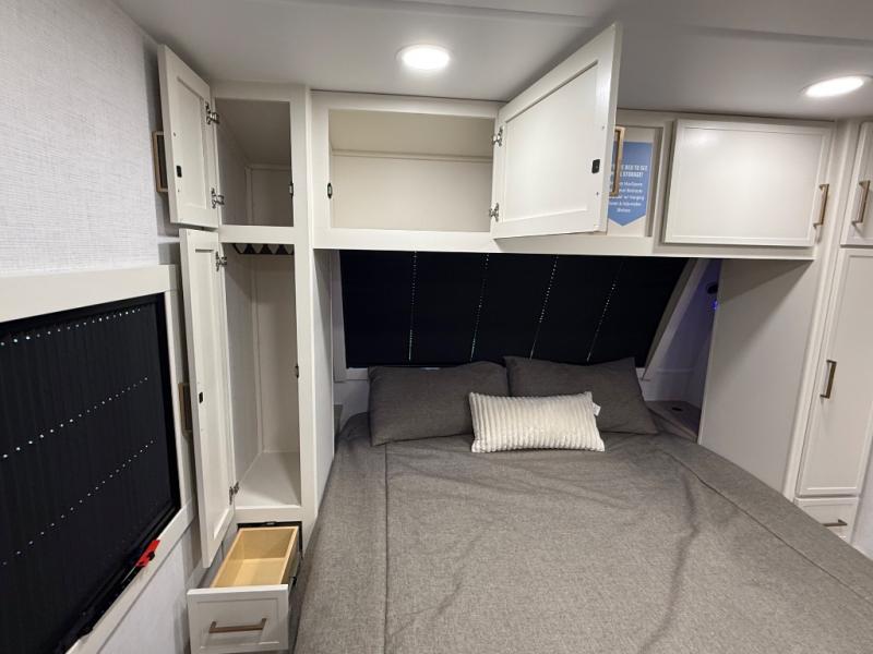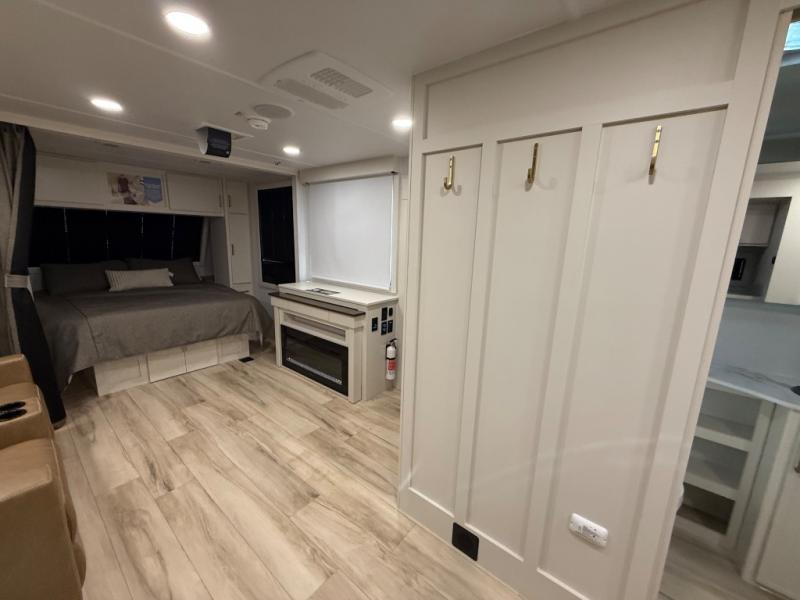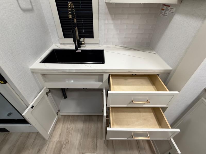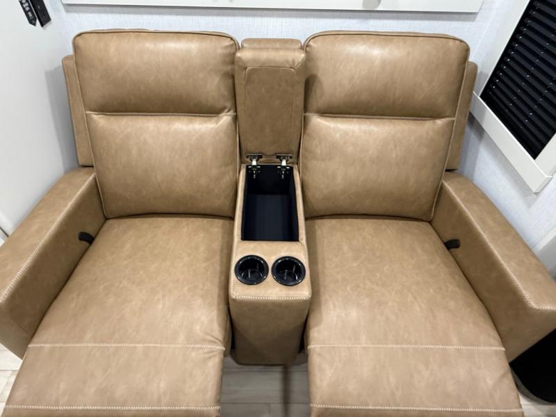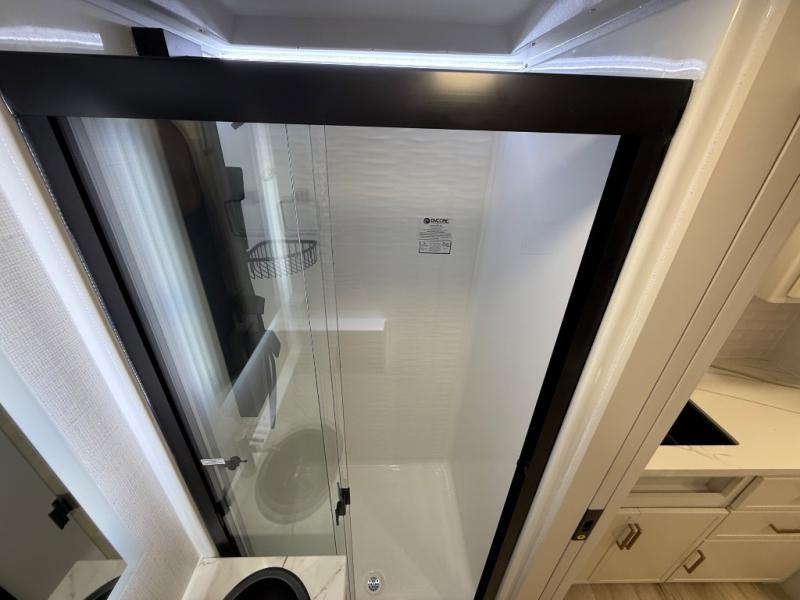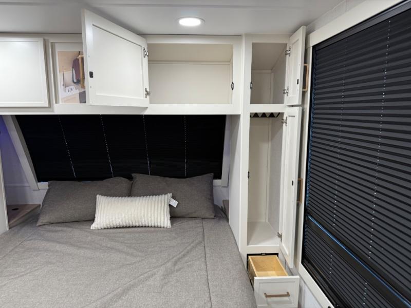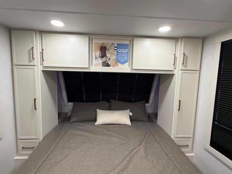 You'll love the amount of space you have in this travel trailer thanks to the large slide out in the main living area. There is comfy theater seating here, along with the kitchen appliances plus a pantry with drawers and an outlet. And a tri-fold sofa option can be chosen in place of theater seating if you're needing sleeping space for guests. You can dine at the pull-out dining table with a drawer, which is right in front of the pull-down interior/exterior screen. A full bath with a 36" x 30" shower will let you freshen up each day, and the king bed in the front bedroom includes a room divider in front for added privacy!