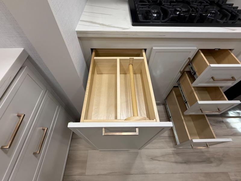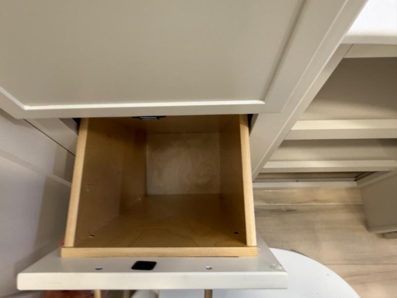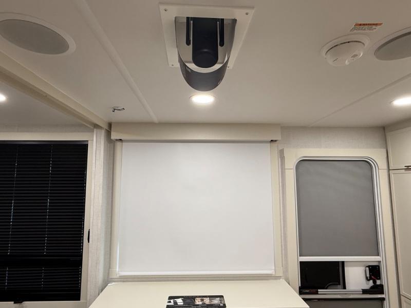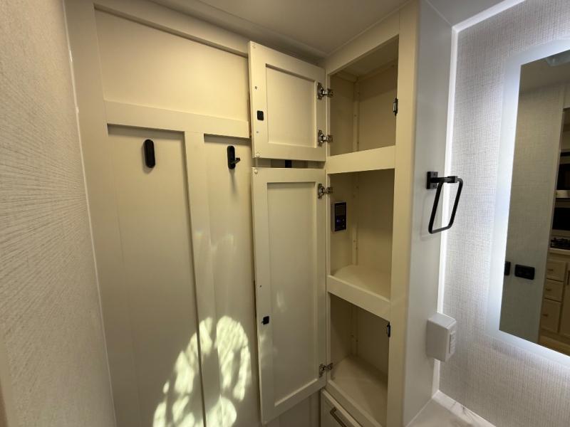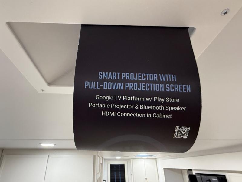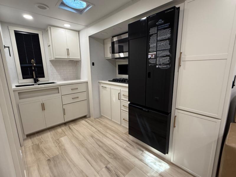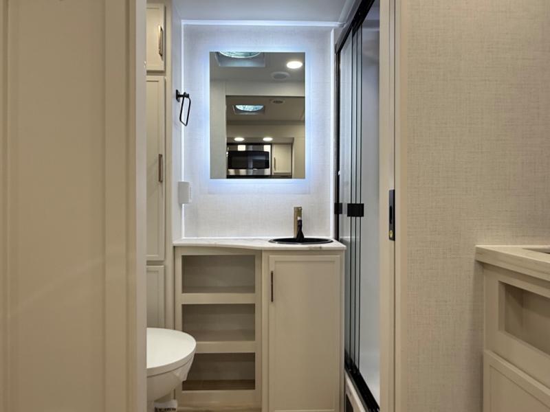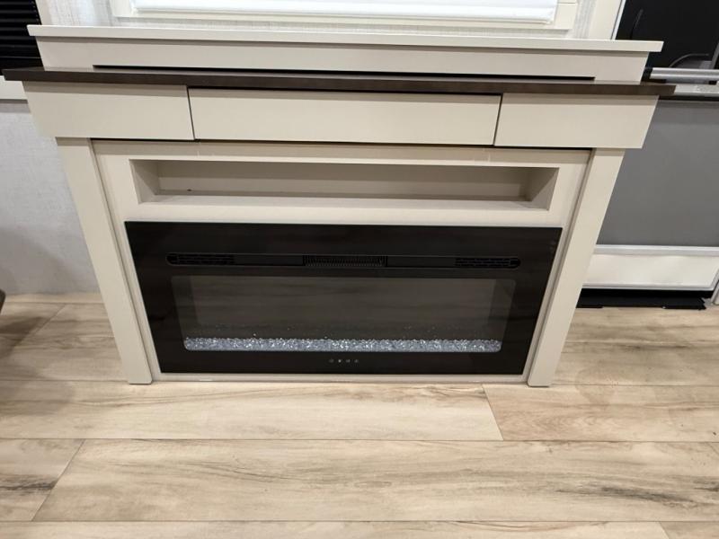 You'll love the amount of space you have in this travel trailer thanks to the large slide out in the main living area. There is comfy theater seating here, along with the kitchen appliances plus a pantry with drawers and an outlet. And a tri-fold sofa option can be chosen in place of theater seating if you're needing sleeping space for guests. You can dine at the pull-out dining table with a drawer, which is right in front of the pull-down interior/exterior screen. A full bath with a 36" x 30" shower will let you freshen up each day, and the king bed in the front bedroom includes a room divider in front for added privacy!