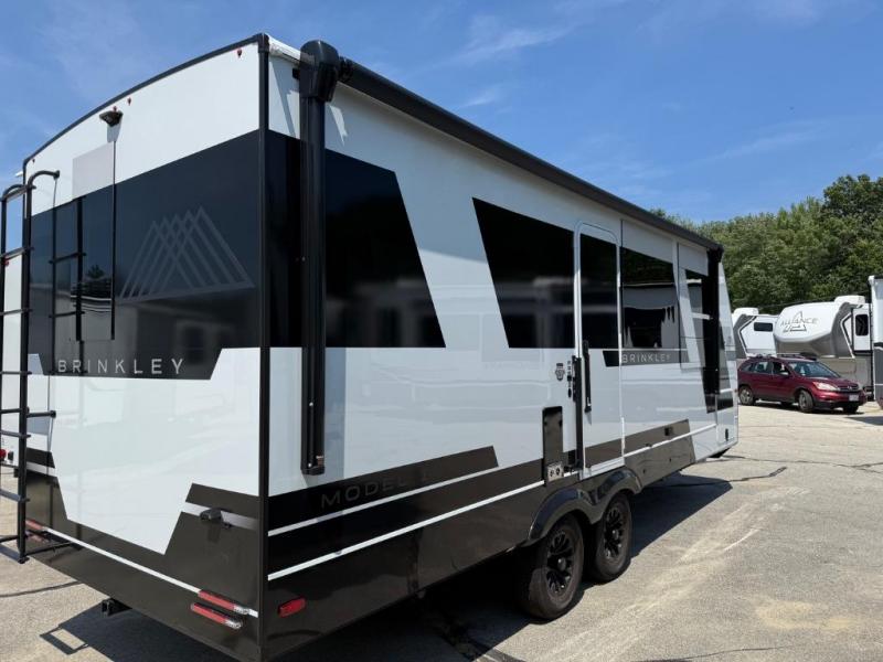 The lightweight Model I travel trailer by Brinkley is the perfect choice for those looking for an easy tow and at-home comforts! There is a drop-frame chassis, high-performance Road Armor suspension equalizer system, and Demco EZ Latch trailer coupler that automatically latches when dropped onto a hitch ball without the need of a safety pin. Additional exterior features include square Euro frameless windows, automotive-grade paint, full-width LED strip lighting in the pass-thru, and a pet & property security campside tie-down to keep your gear and furry friends safe. Inside, you'll be wowed by Brinkley's CraftSense wood trim construction, residential solid surface kitchen countertops, dimmable bedroom lights, and marine-grade neon LED shower lighting to name a few stand-out features!