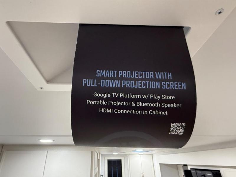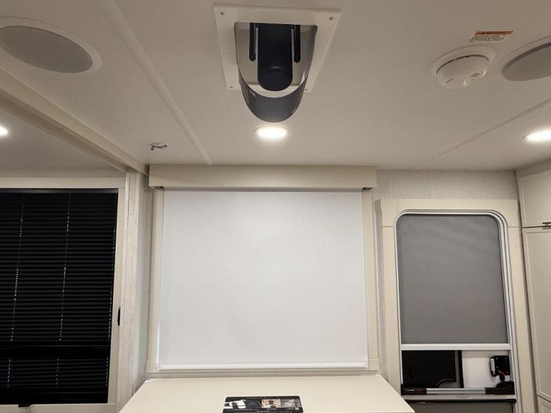 Ceiling-mounted digital smart projector with a pull-down screen—perfect for indoor or outdoor movie nights.