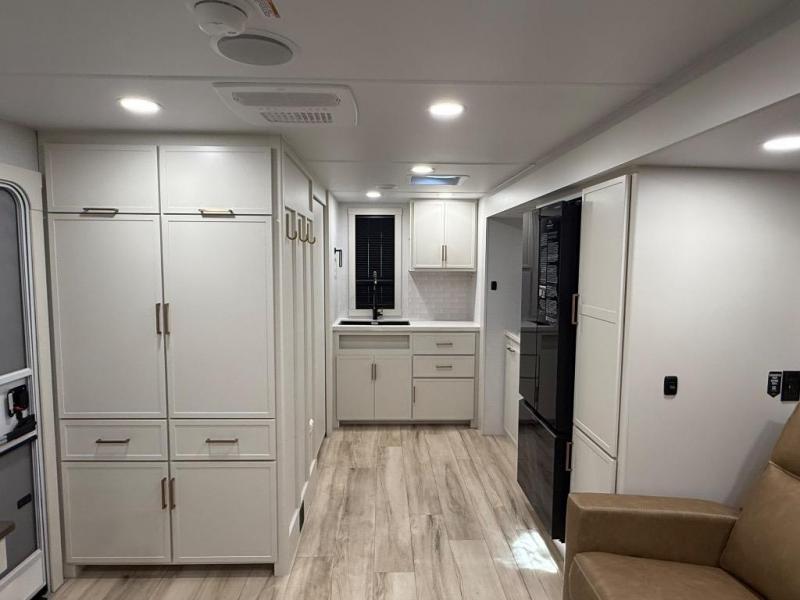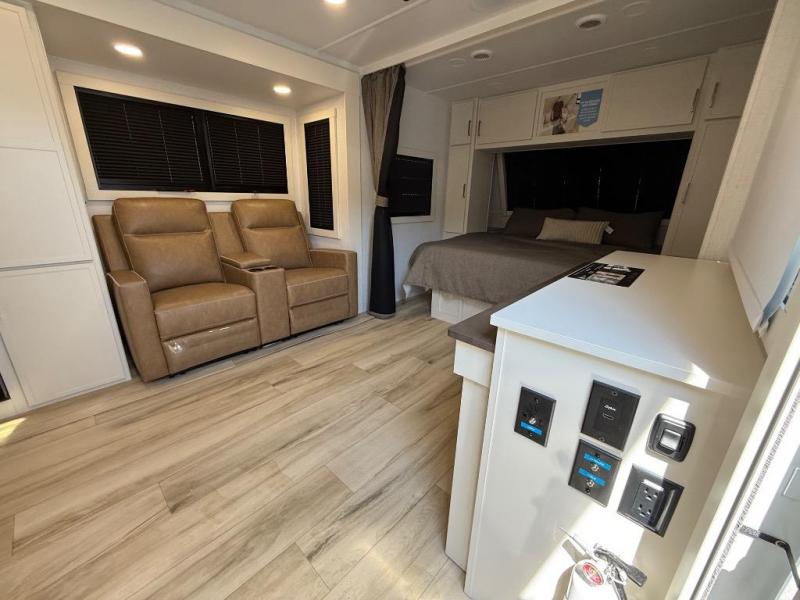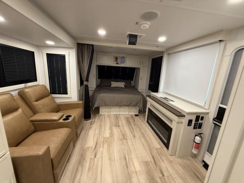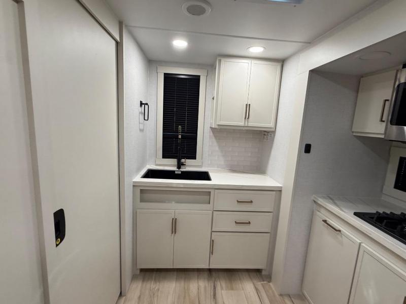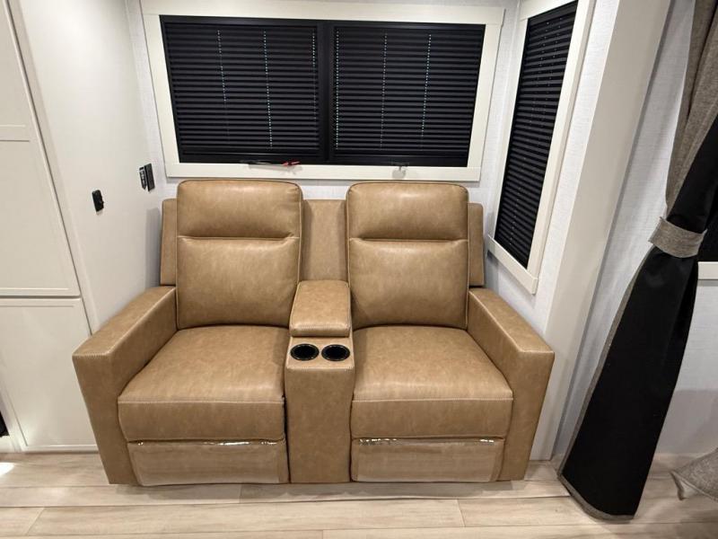 You'll love the amount of space you have in this travel trailer thanks to the large slide out in the main living area. There is comfy theater seating here, along with the kitchen appliances plus a pantry with drawers and an outlet. And a tri-fold sofa option can be chosen in place of theater seating if you're needing sleeping space for guests. You can dine at the pull-out dining table with a drawer, which is right in front of the pull-down interior/exterior screen. A full bath with a 36" x 30" shower will let you freshen up each day, and the king bed in the front bedroom includes a room divider in front for added privacy!