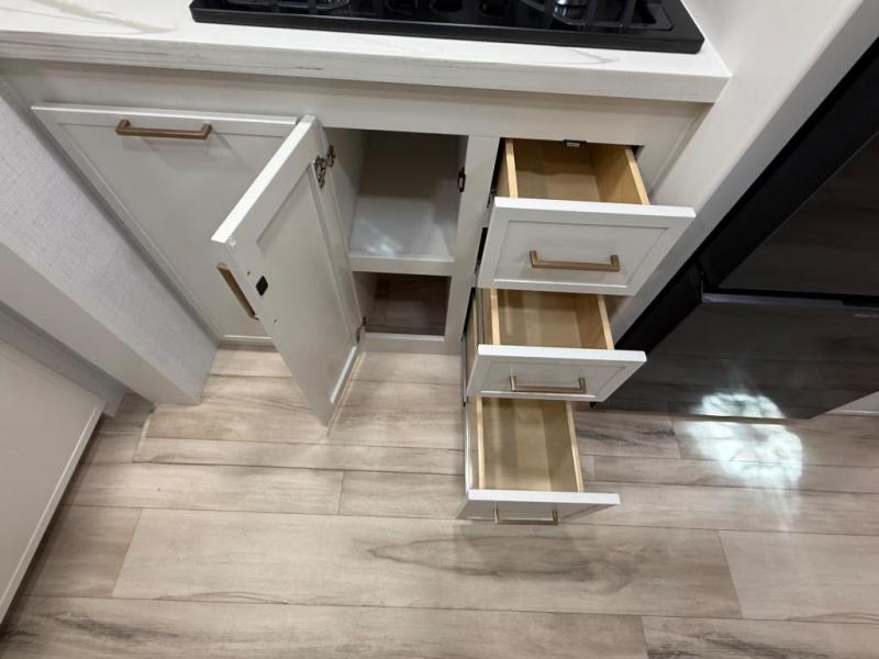 Fine finishes throughout, including soft-close cabinetry, high-end wood trim, solid-surface countertops, dovetail drawers, and a pull-out dining table with utensil storage.