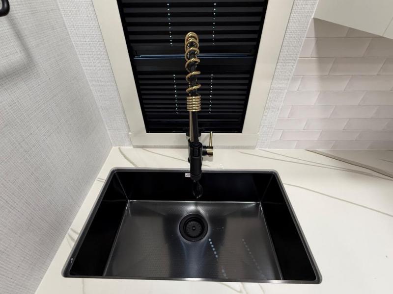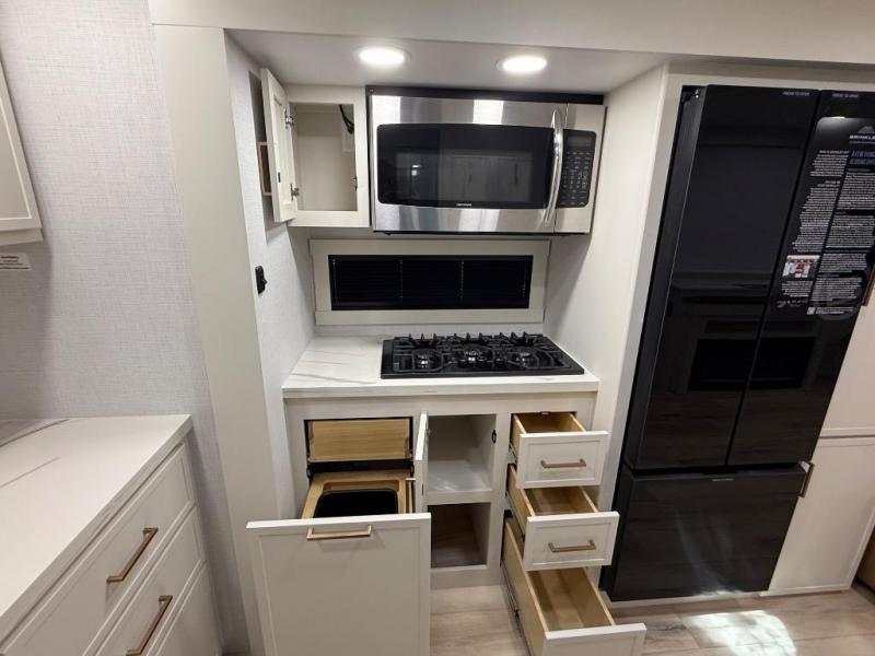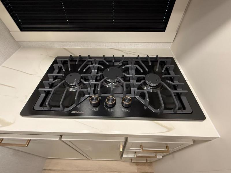 Well-appointed galley with a three-burner cooktop, convection microwave (air-fryer capable), farmhouse sink with cover, and a 12?cu?ft 12?V energy-efficient refrigerator.