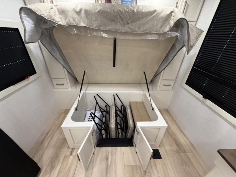 Smart, open-concept interior featuring a front seating area that converts into a bed, ideal for both lounging and sleeping.