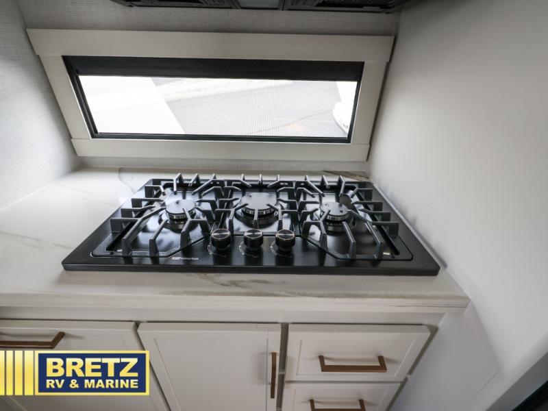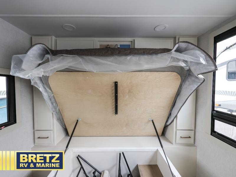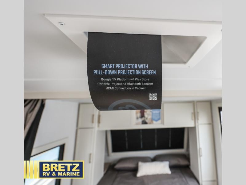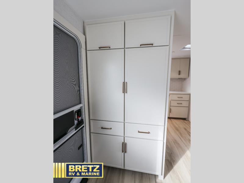 You'll love the amount of space you have in this travel trailer thanks to the large slide out in the main living area. There is comfy theater seating here, along with the kitchen appliances plus a pantry with drawers and an outlet. And a tri-fold sofa option can be chosen in place of theater seating if you're needing sleeping space for guests. You can dine at the pull-out dining table with a drawer, which is right in front of the pull-down interior/exterior screen. A full bath with a 36" x 30" shower will let you freshen up each day, and the king bed in the front bedroom includes a room divider in front for added privacy!