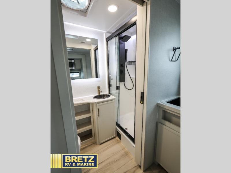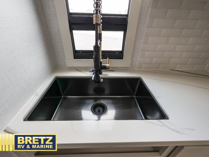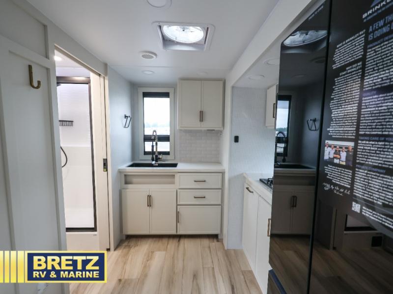 The lightweight Model I travel trailer by Brinkley is the perfect choice for those looking for an easy tow and at-home comforts! There is a drop-frame chassis, high-performance Road Armor suspension equalizer system, and Demco EZ Latch trailer coupler that automatically latches when dropped onto a hitch ball without the need of a safety pin. Additional exterior features include square Euro frameless windows, automotive-grade paint, full-width LED strip lighting in the pass-thru, and a pet & property security campside tie-down to keep your gear and furry friends safe. Inside, you'll be wowed by Brinkley's CraftSense wood trim construction, residential solid surface kitchen countertops, dimmable bedroom lights, and marine-grade neon LED shower lighting to name a few stand-out features!