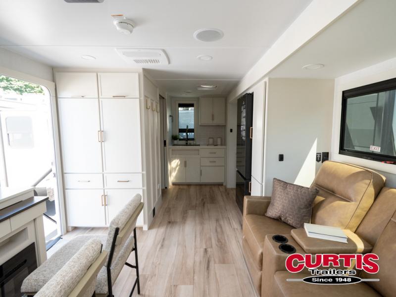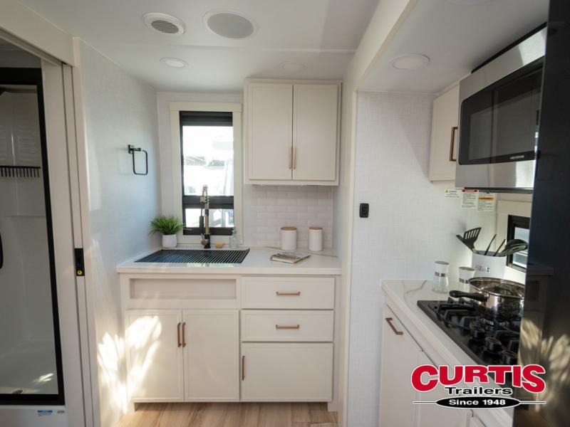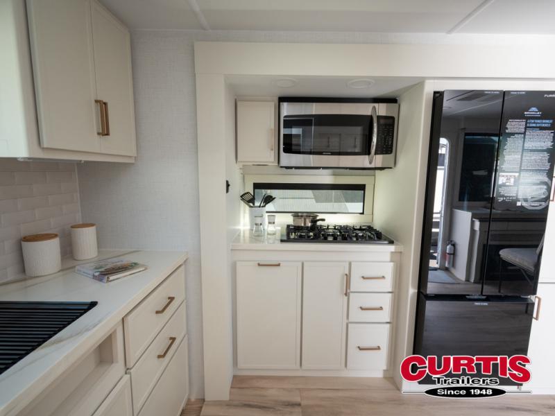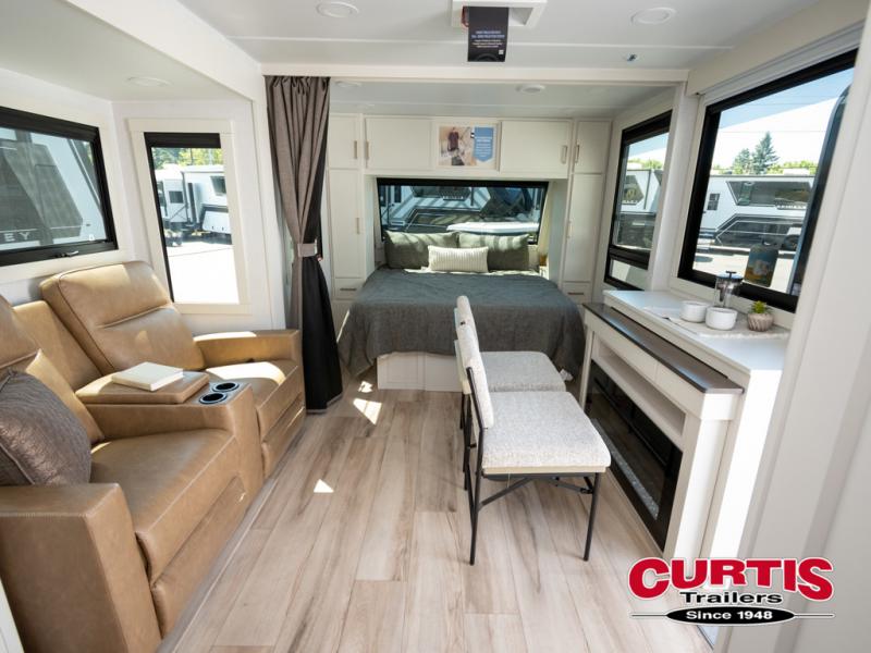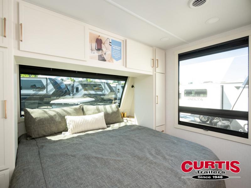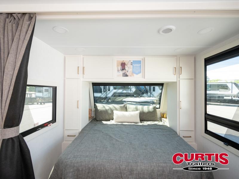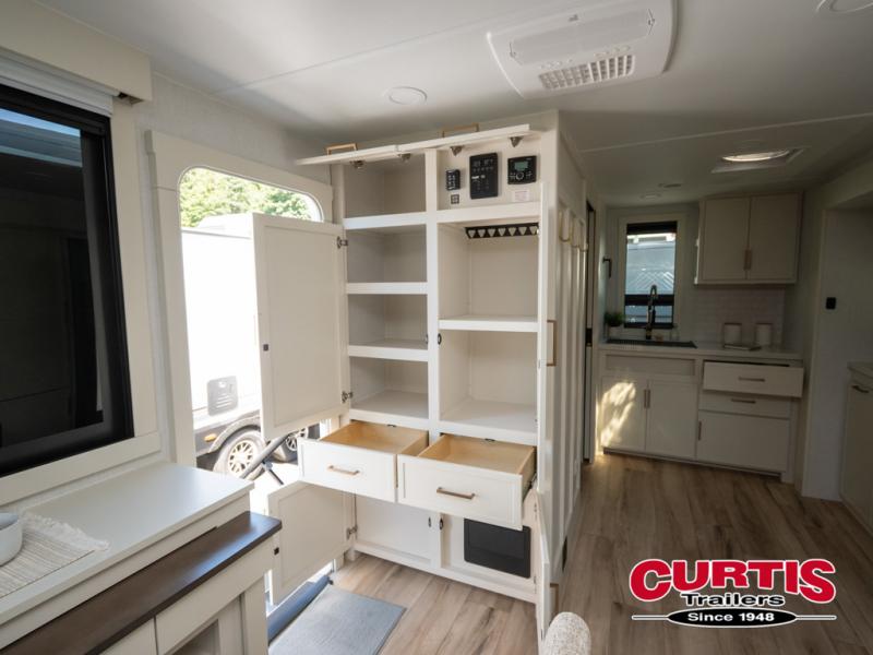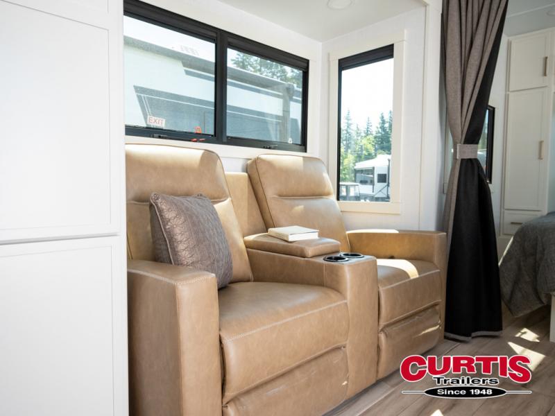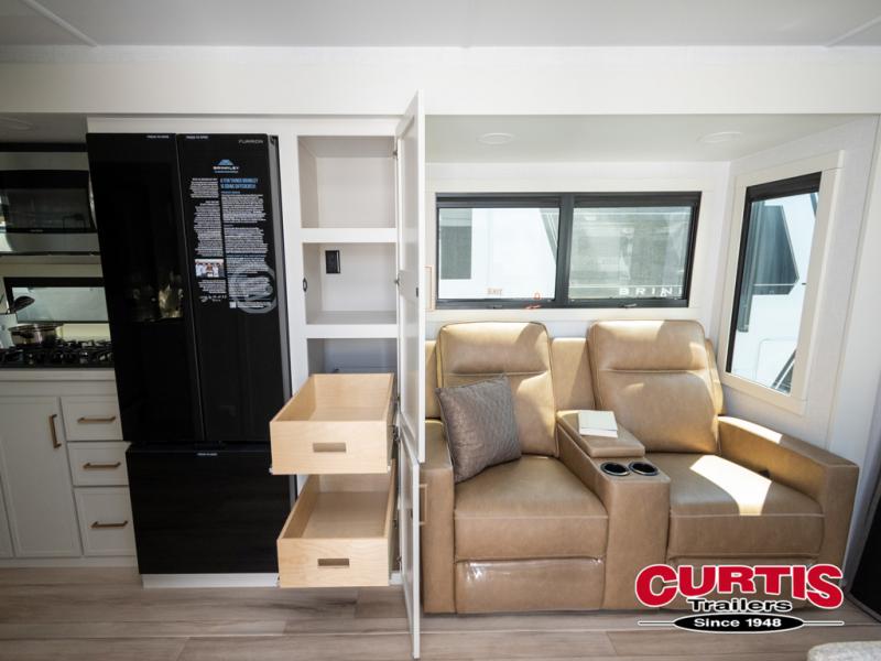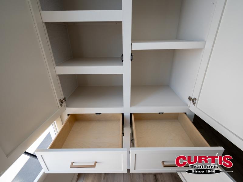 You'll love the amount of space you have in this travel trailer thanks to the large slide out in the main living area. There is comfy theater seating here, along with the kitchen appliances plus a pantry with drawers and an outlet. And a tri-fold sofa option can be chosen in place of theater seating if you're needing sleeping space for guests. You can dine at the pull-out dining table with a drawer, which is right in front of the pull-down interior/exterior screen. A full bath with a 36" x 30" shower will let you freshen up each day, and the king bed in the front bedroom includes a room divider in front for added privacy!