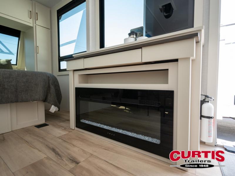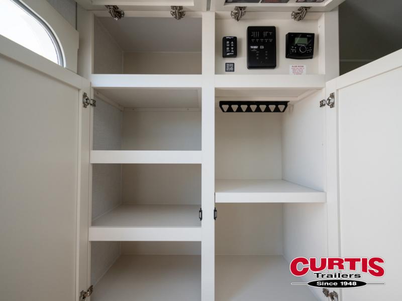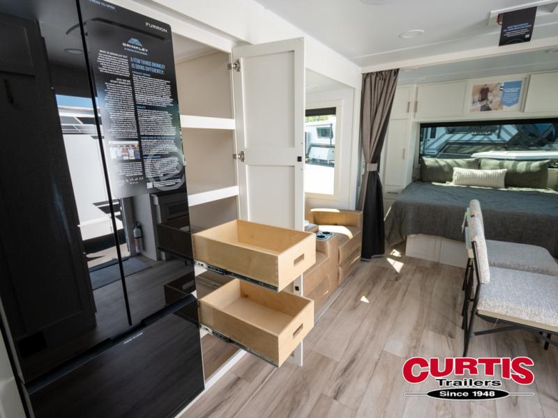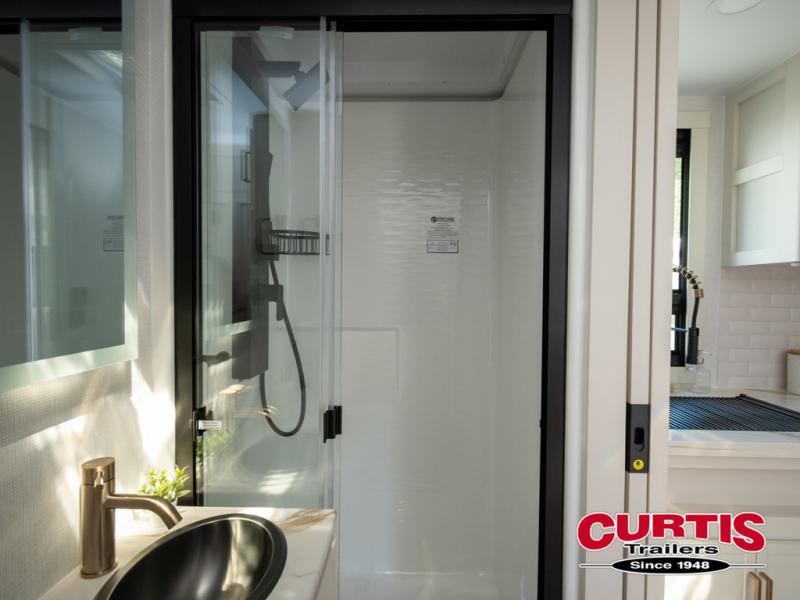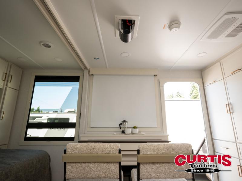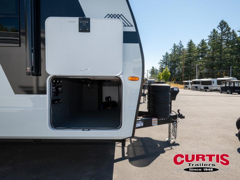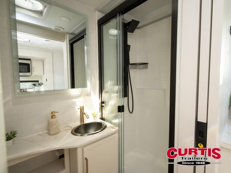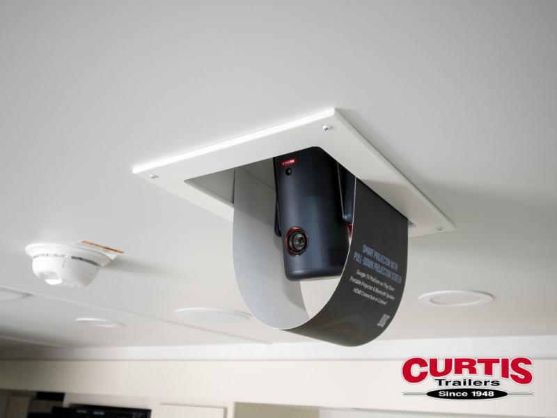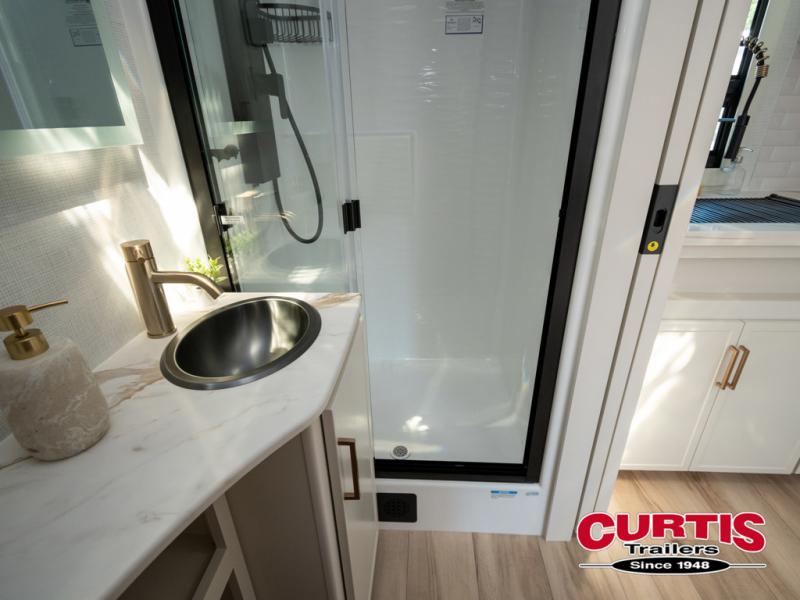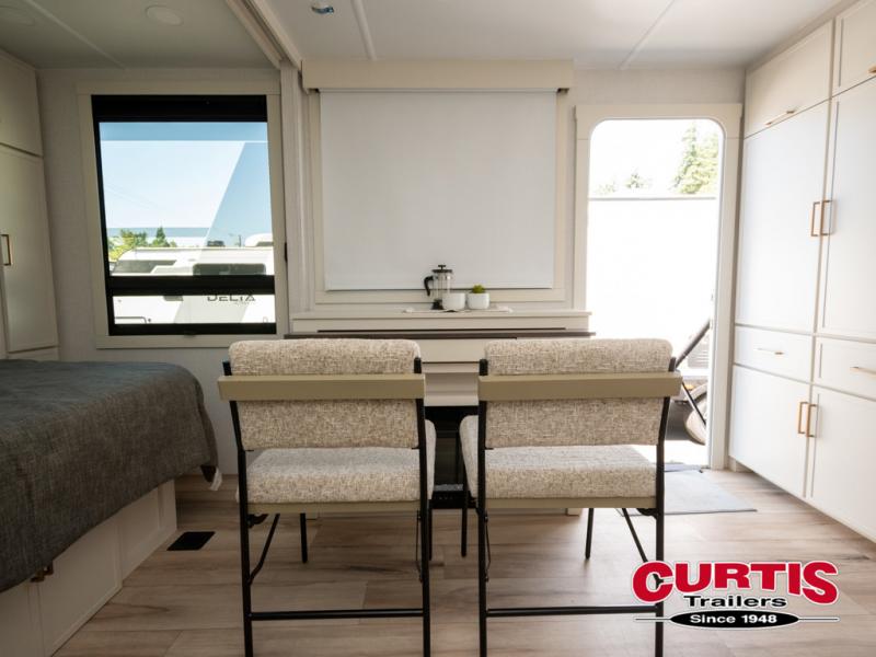 You'll love the amount of space you have in this travel trailer thanks to the large slide out in the main living area. There is comfy theater seating here, along with the kitchen appliances plus a pantry with drawers and an outlet. And a tri-fold sofa option can be chosen in place of theater seating if you're needing sleeping space for guests. You can dine at the pull-out dining table with a drawer, which is right in front of the pull-down interior/exterior screen. A full bath with a 36" x 30" shower will let you freshen up each day, and the king bed in the front bedroom includes a room divider in front for added privacy!