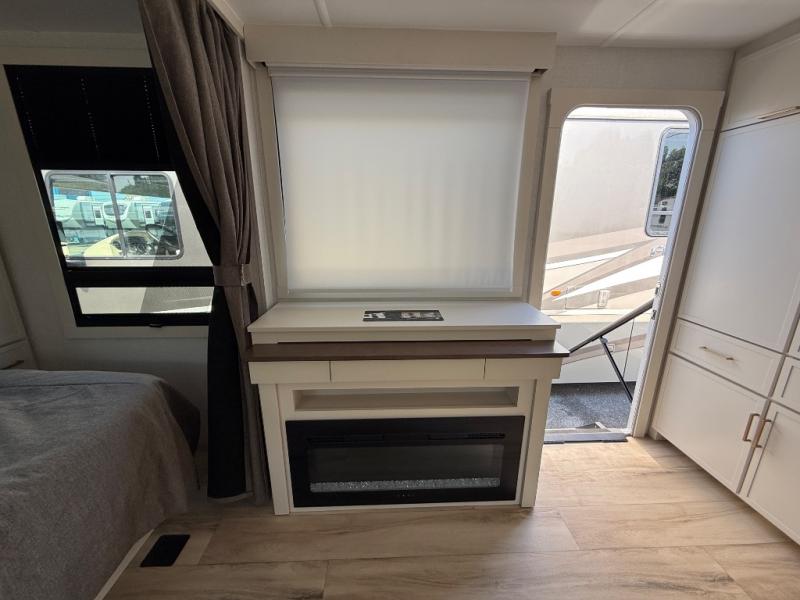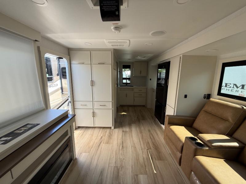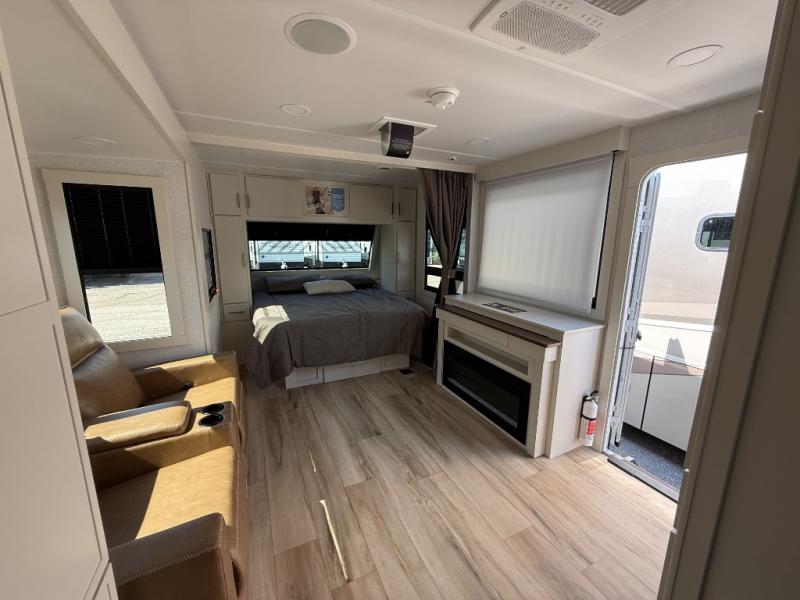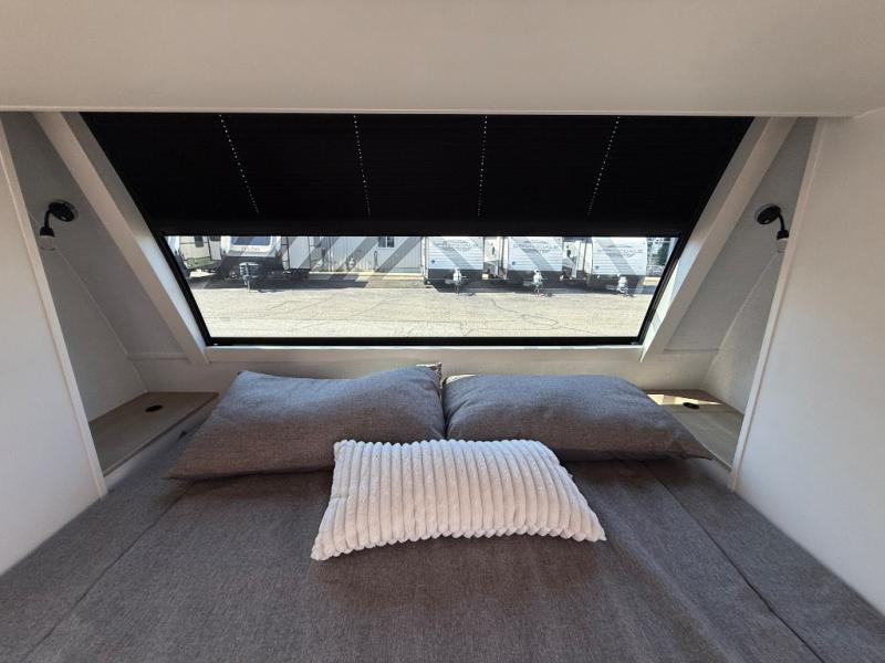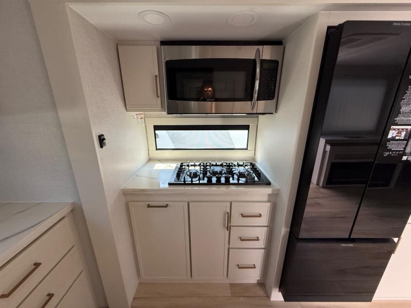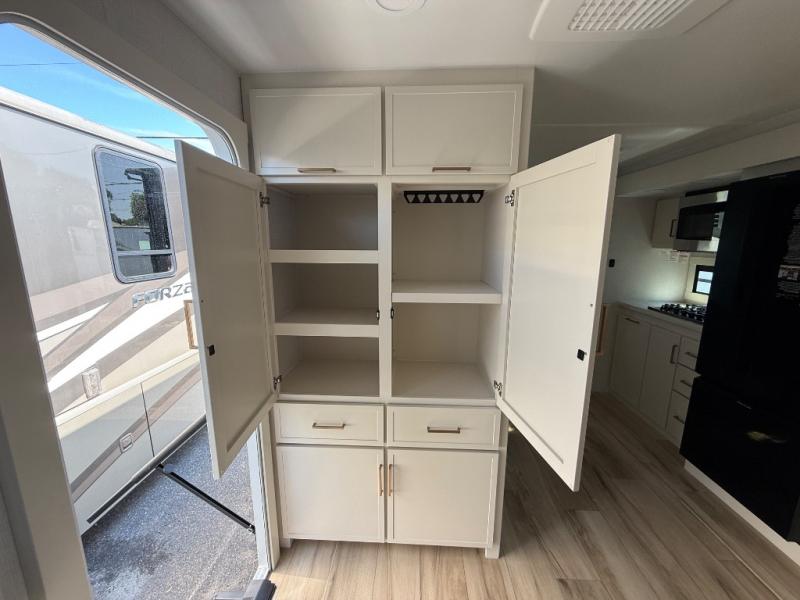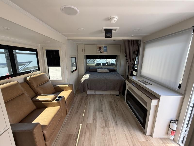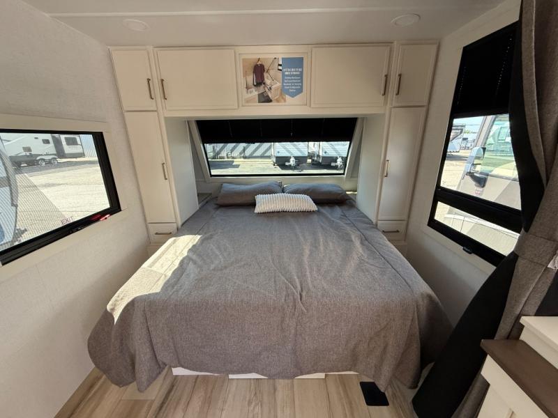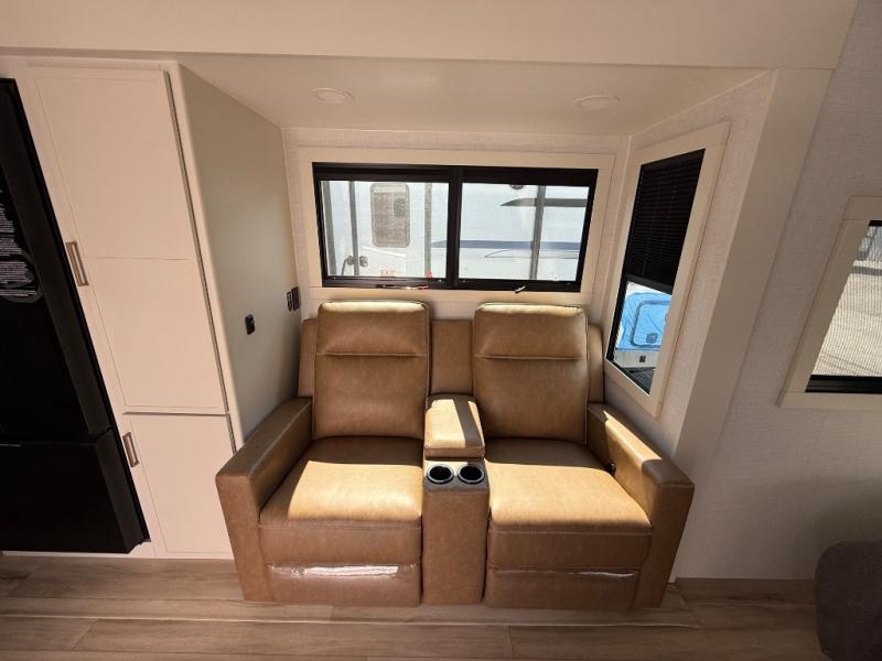 You'll love the amount of space you have in this travel trailer thanks to the large slide out in the main living area. There is comfy theater seating here, along with the kitchen appliances plus a pantry with drawers and an outlet. And a tri-fold sofa option can be chosen in place of theater seating if you're needing sleeping space for guests. You can dine at the pull-out dining table with a drawer, which is right in front of the pull-down interior/exterior screen. A full bath with a 36" x 30" shower will let you freshen up each day, and the king bed in the front bedroom includes a room divider in front for added privacy!