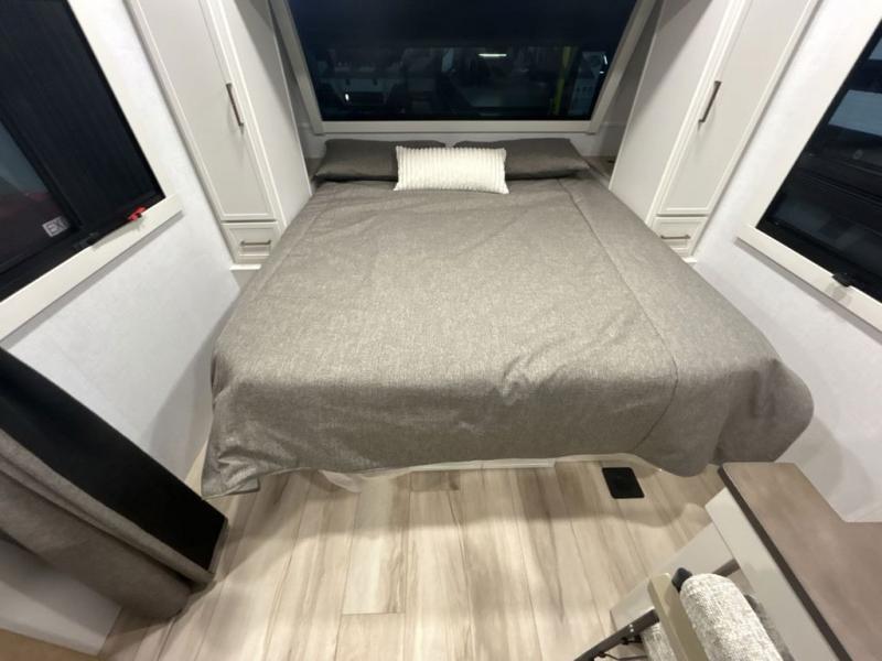 You'll love the amount of space you have in this travel trailer thanks to the large slide out in the main living area. There is comfy theater seating here, along with the kitchen appliances plus a pantry with drawers and an outlet. And a tri-fold sofa option can be chosen in place of theater seating if you're needing sleeping space for guests. You can dine at the pull-out dining table with a drawer, which is right in front of the pull-down interior/exterior screen. A full bath with a 36" x 30" shower will let you freshen up each day, and the king bed in the front bedroom includes a room divider in front for added privacy!